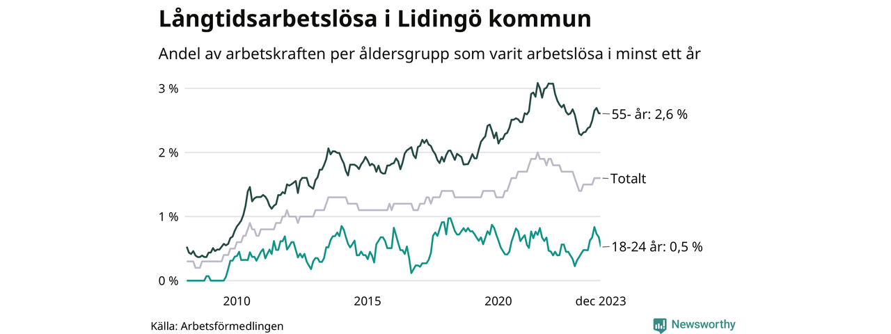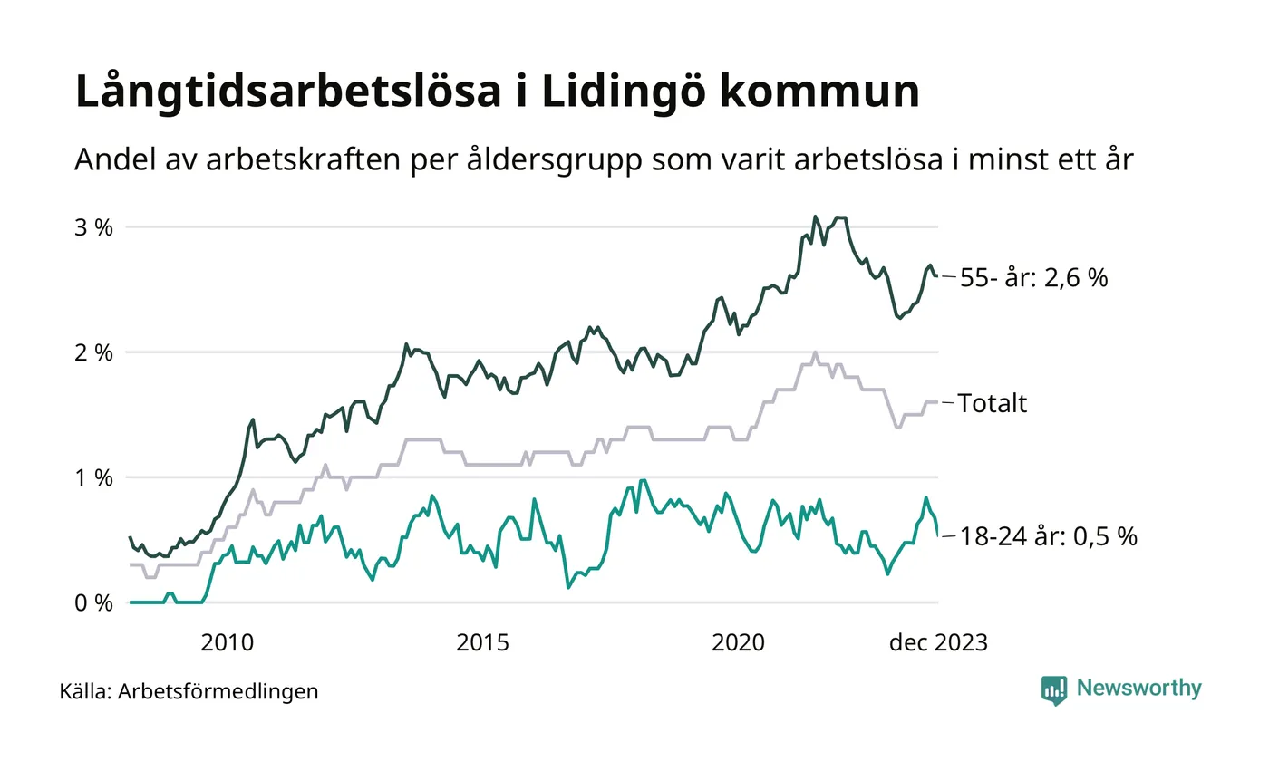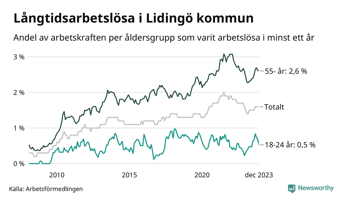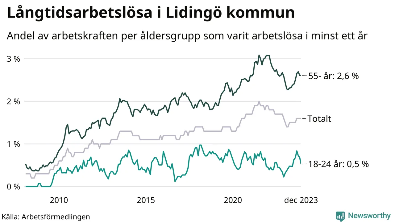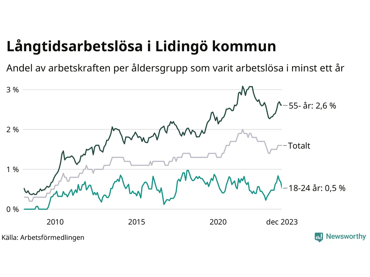 Av de 360 personerna som varit arbetslösa i mer än ett år i Lidingö kommun är 127 personer mellan 55 och 651 år och tio är mellan 18 och 24 år. För den äldre gruppen är andelen arbetslösa 2,6 procent medan den i den yngre gruppen är 0,5 procent. Även i riket som helhet är långtidsarbetslösheten högre i gruppen äldre.