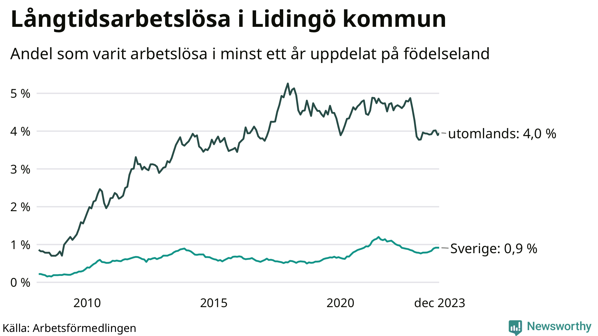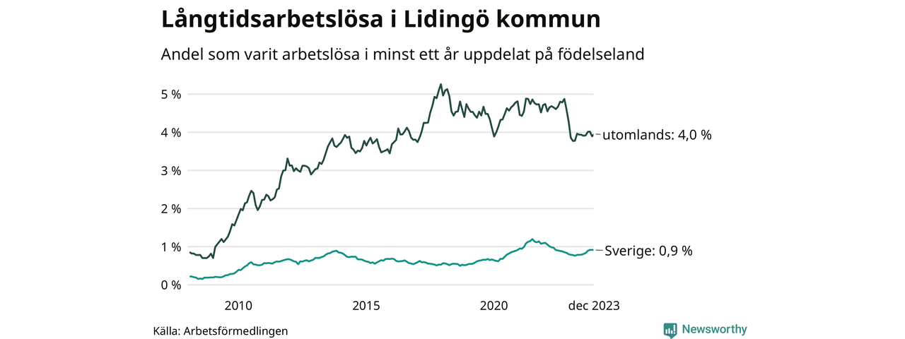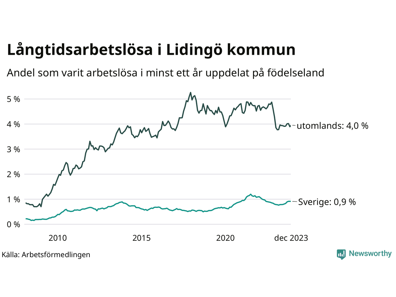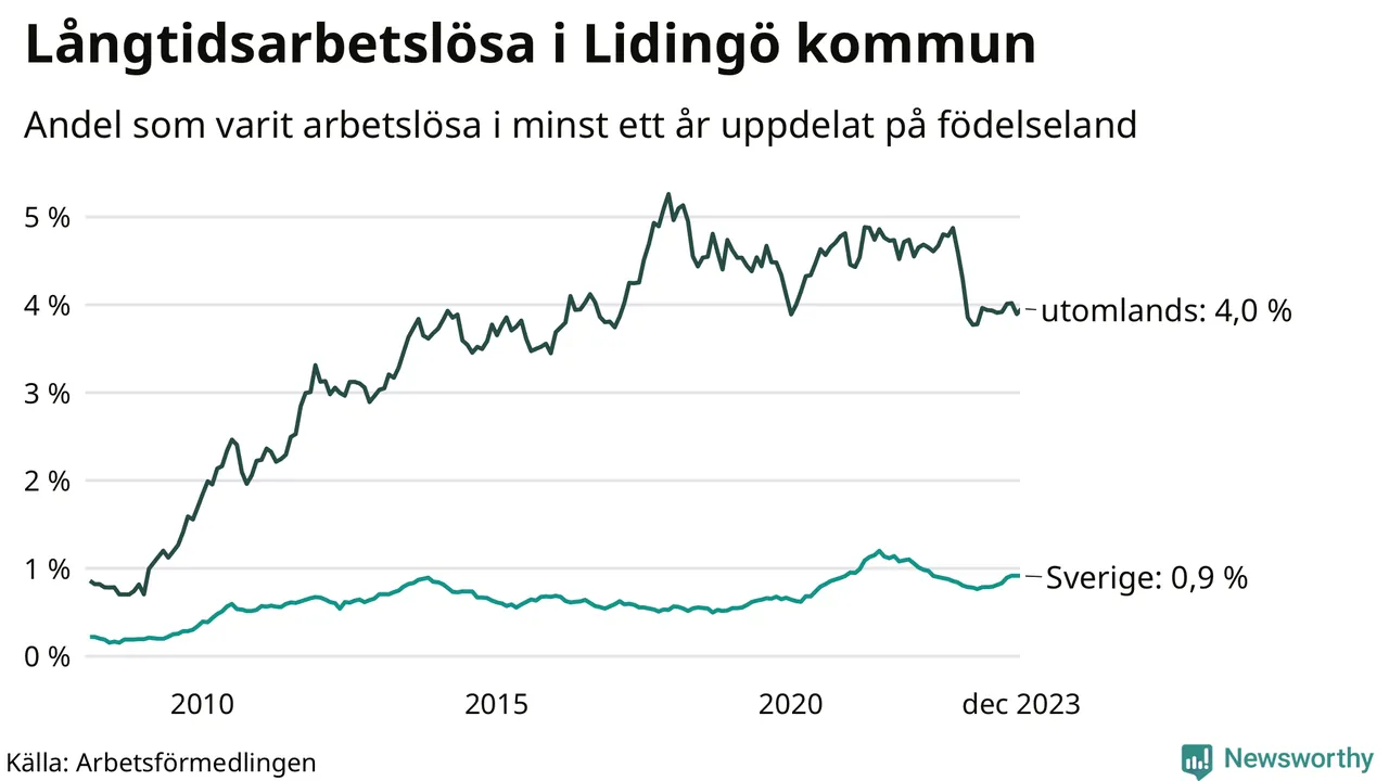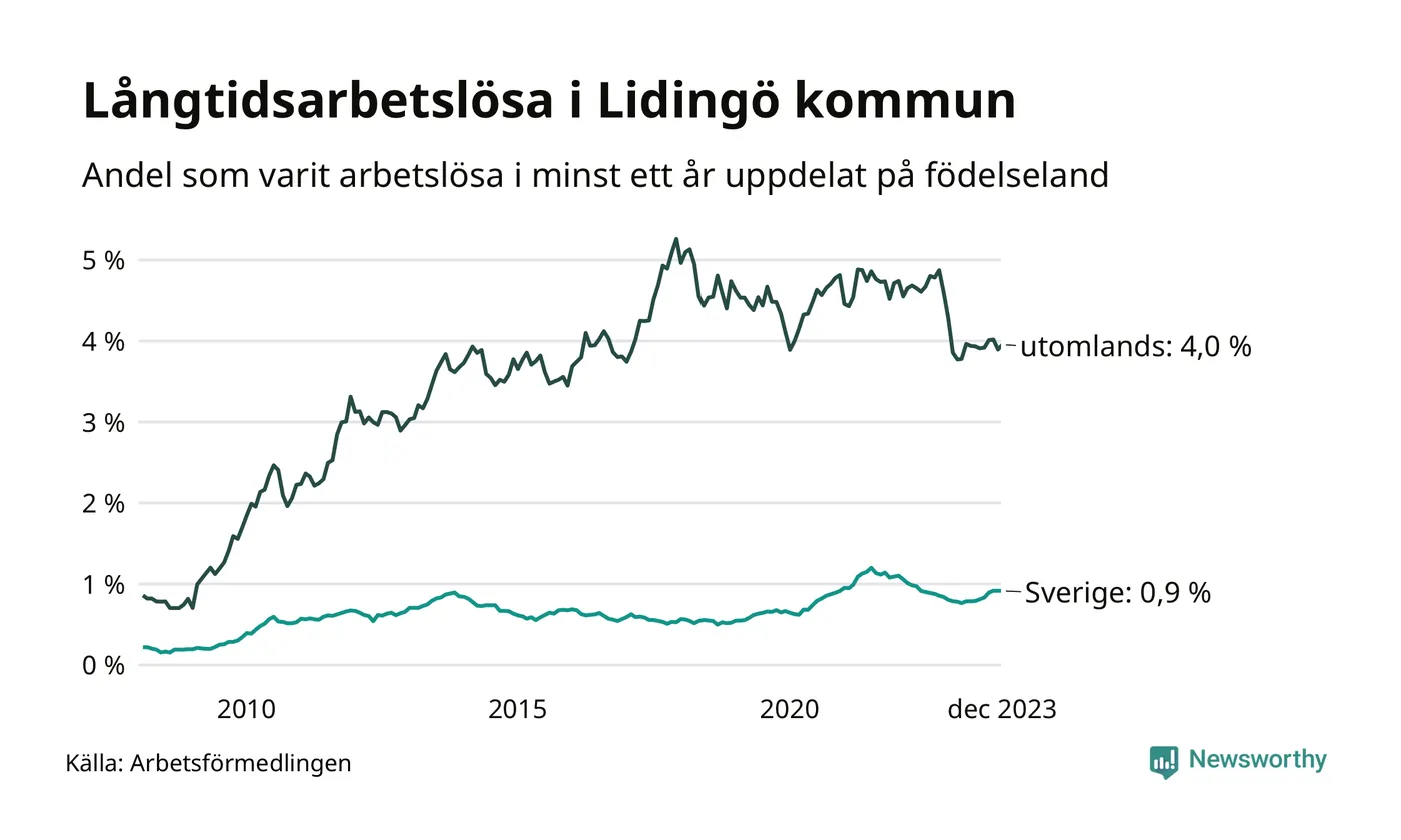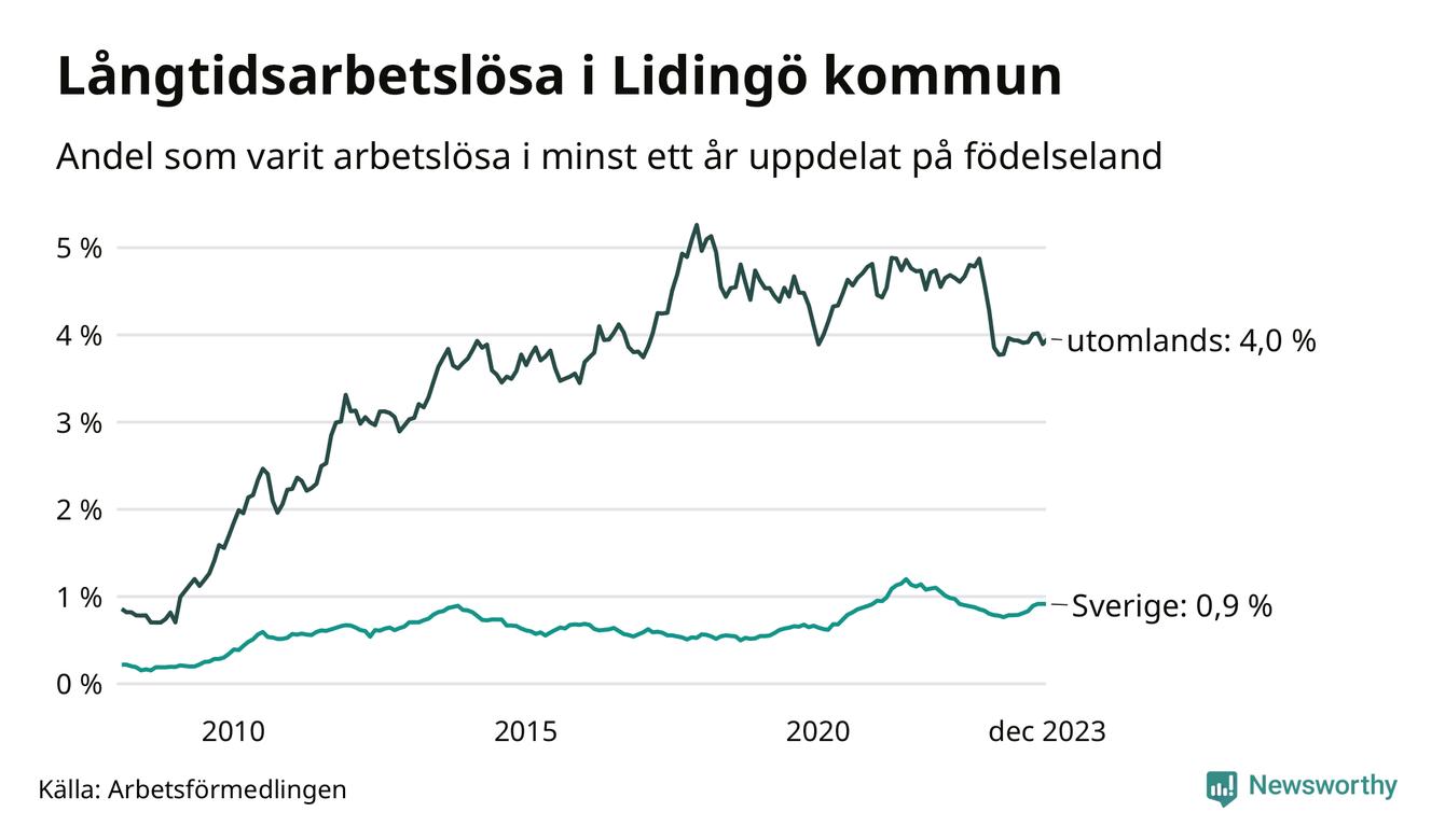 164 av de långtidsarbetslösa på Lidingö är födda i Sverige, medan 196 är födda utomlands. Det innebär att långtidsarbetslösheten bland Sverigefödda är 0,9 procent, medan den är fyra gånger så hög – 4,0 procent – bland födda utomlands. Även i riket som helhet är arbetslösheten högre bland utrikesfödda.