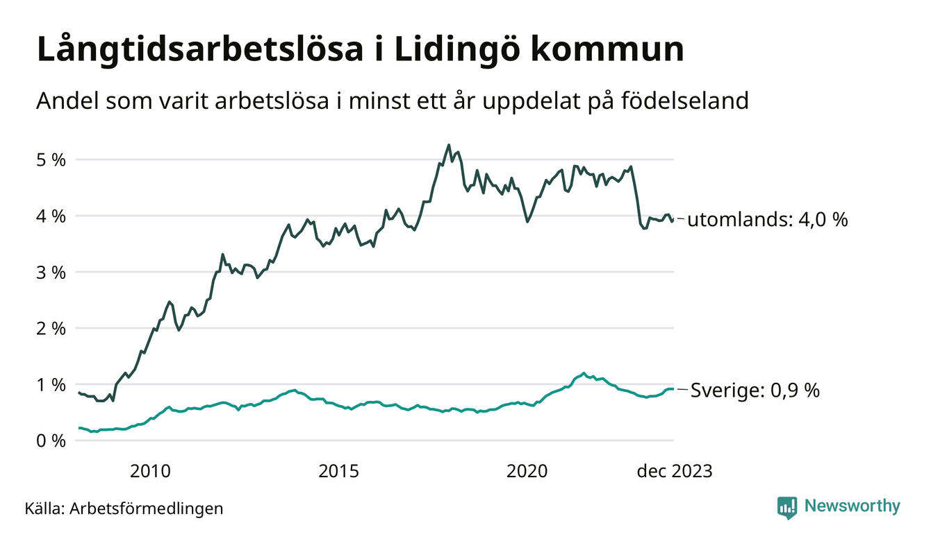 Graf: Andel arbetslösa uppdelat på födelseland på Lidingö