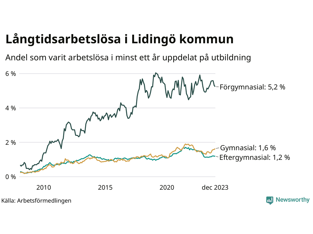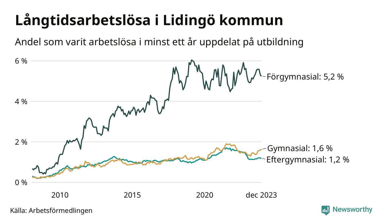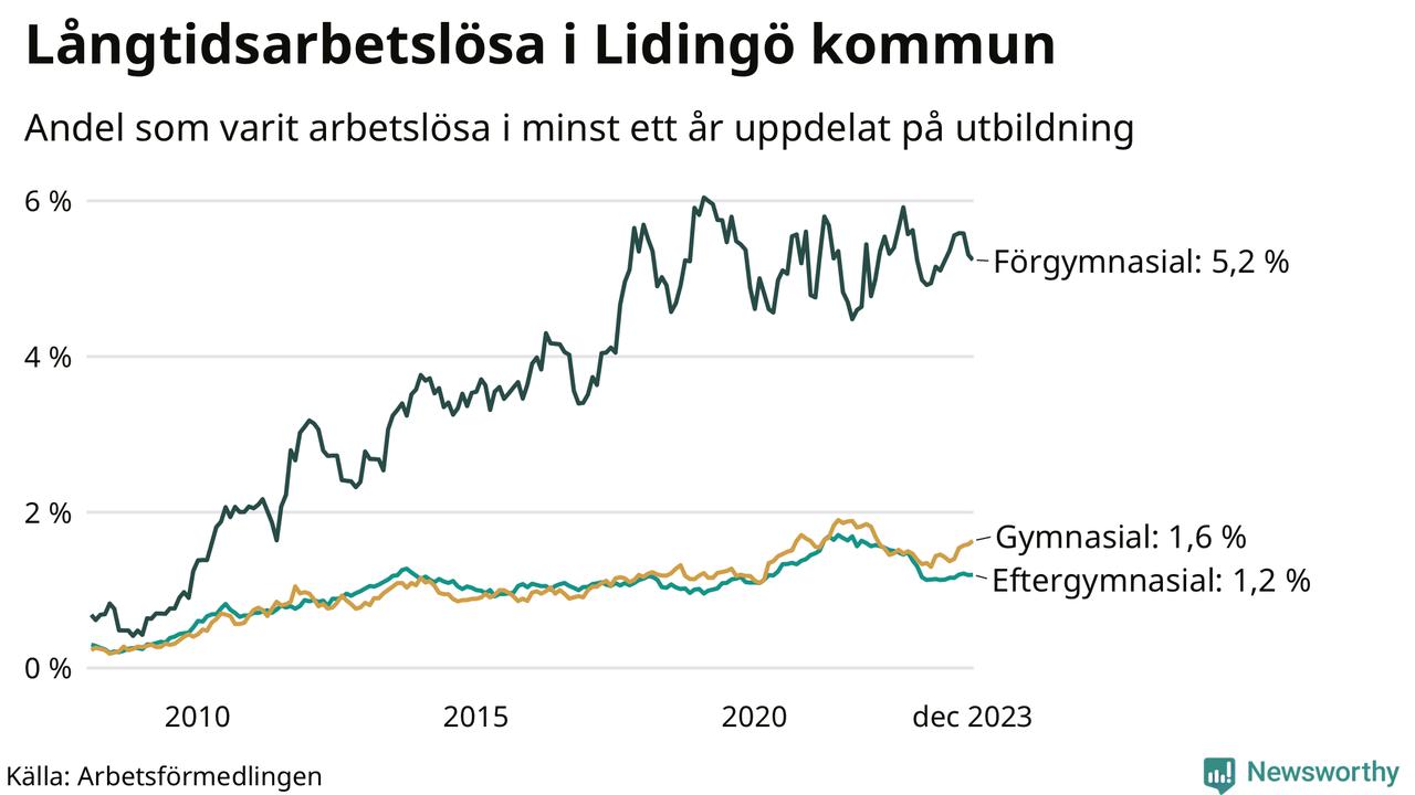 Graf över andel långtidsarbetslösa på Lidingö uppdelat på utbildningsnivå