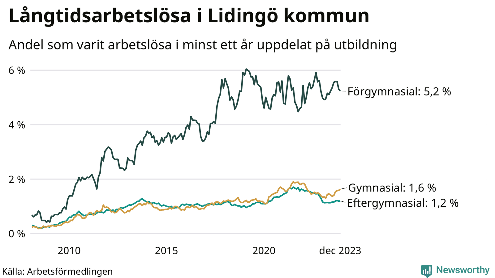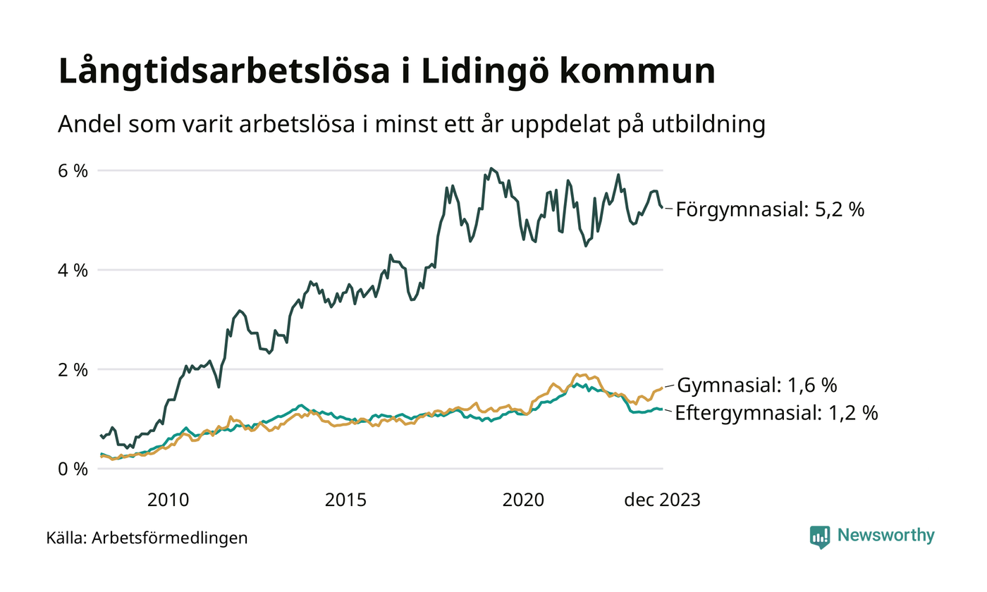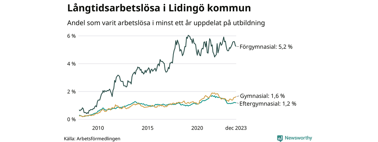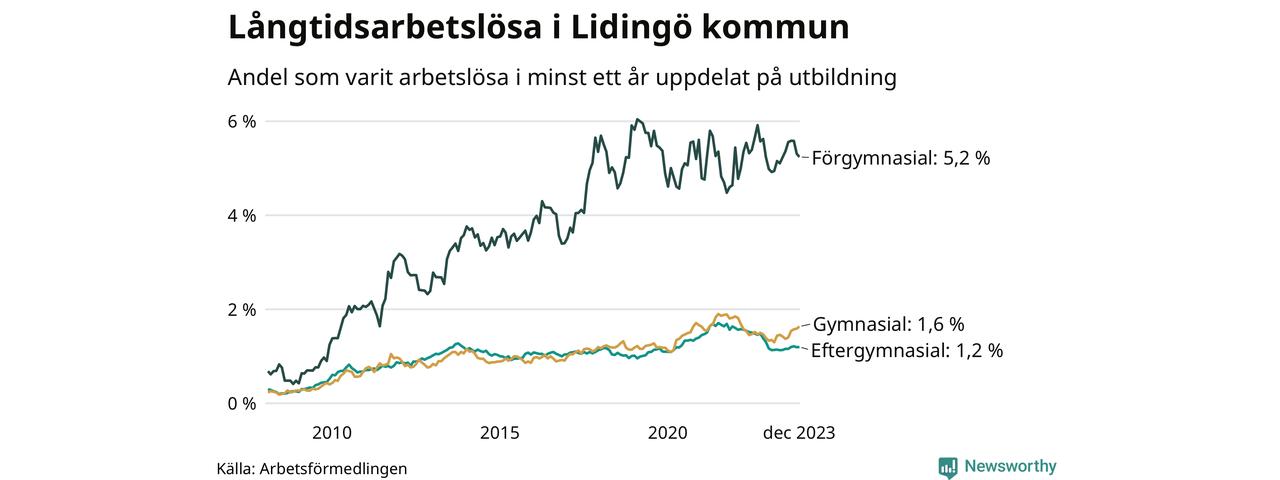 Graf över andel långtidsarbetslösa på Lidingö uppdelat på utbildningsnivå