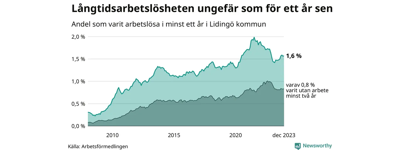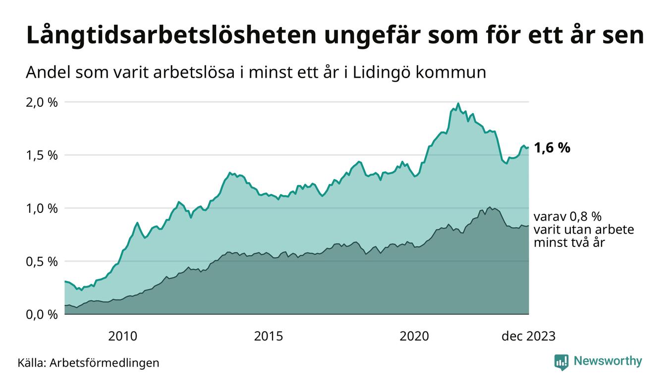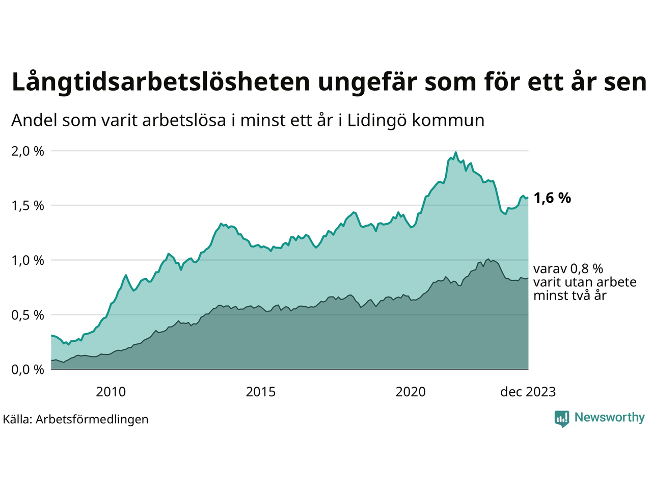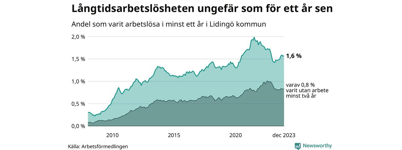 I december hade 360 Lidingöbor varit arbetslösa i minst ett år, vilket är tre fler än månaden innan. 360 personer motsvarar 1,6 procent av arbetskraften i kommunen – andelen långtidsarbetslösa är ungefär på samma nivå som för ett år sedan.