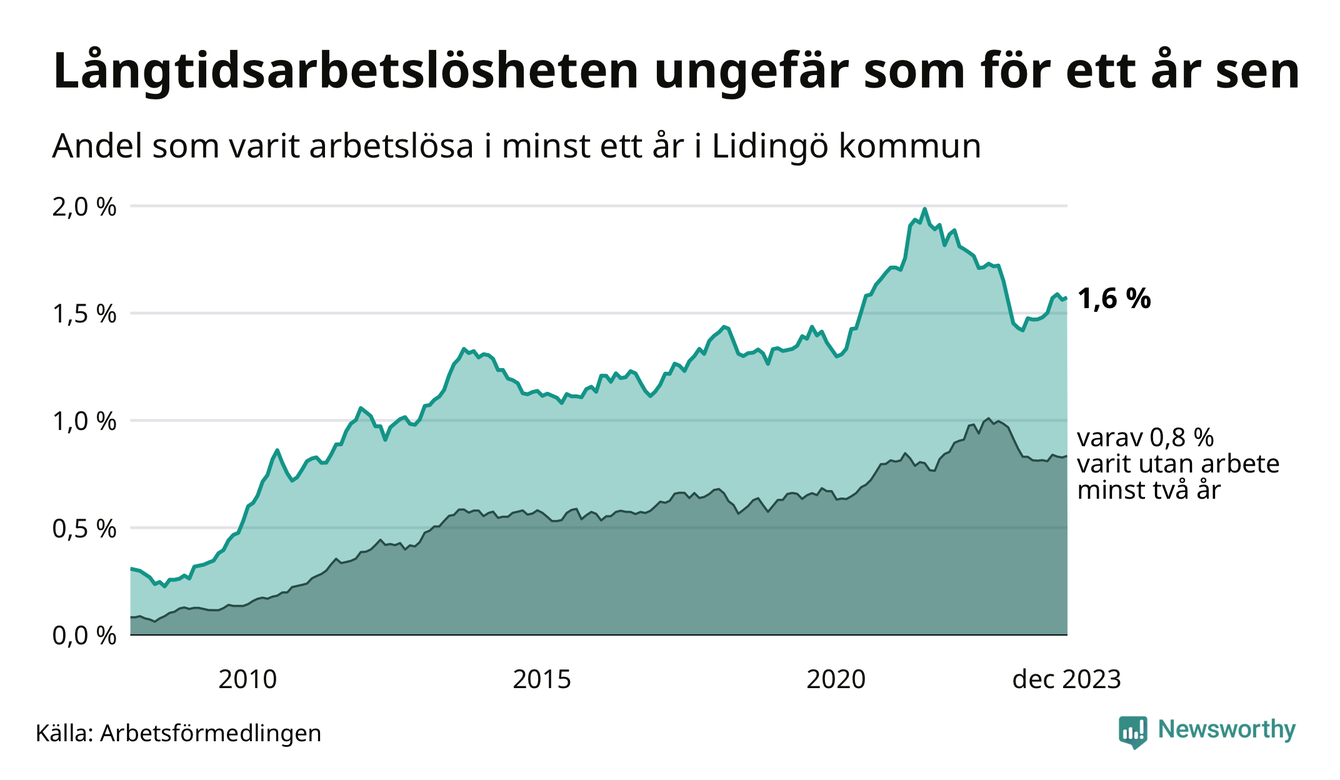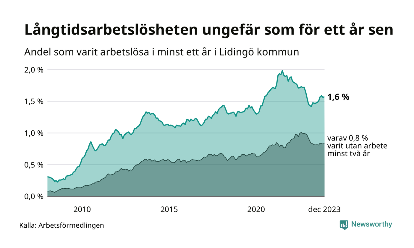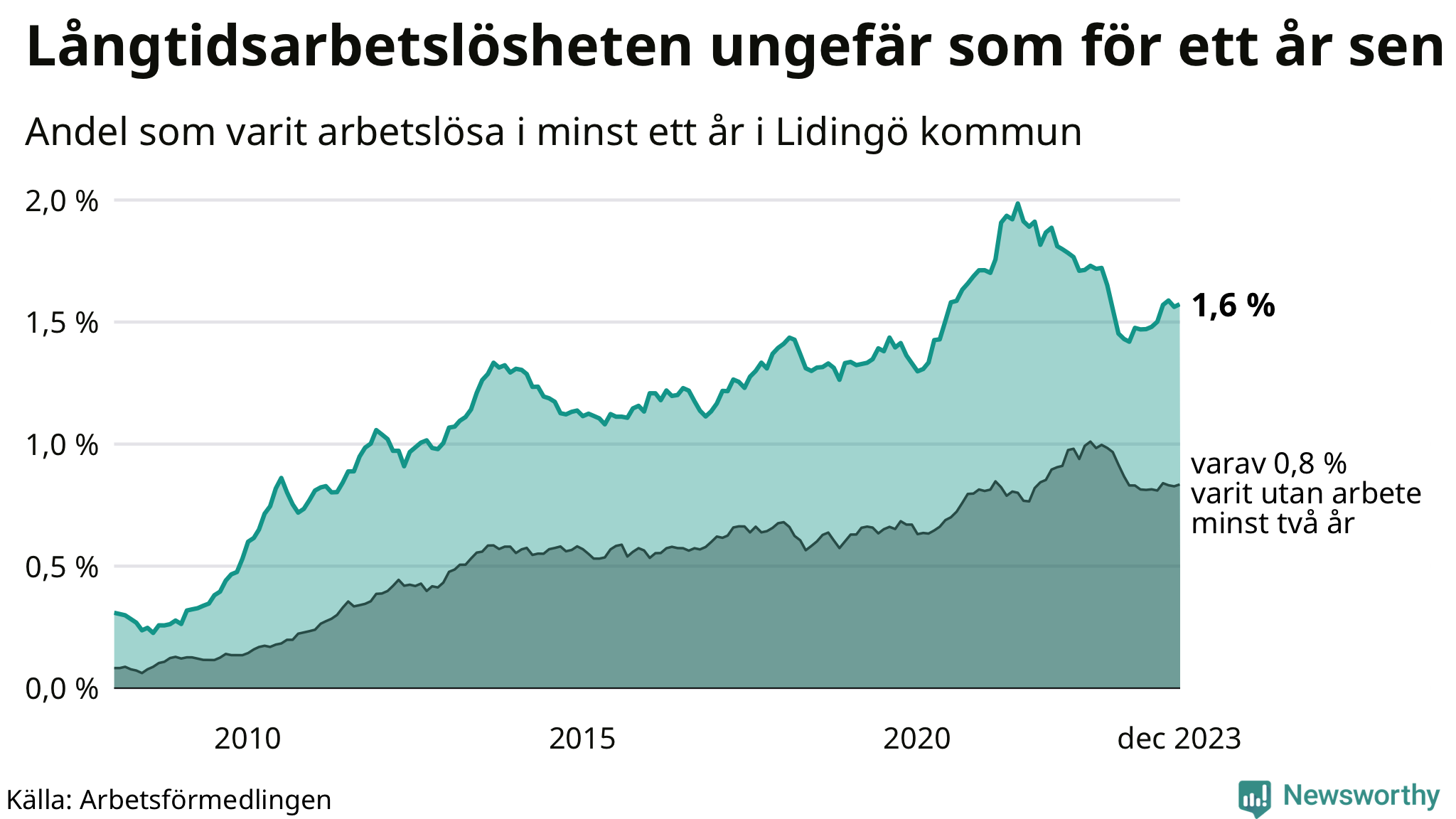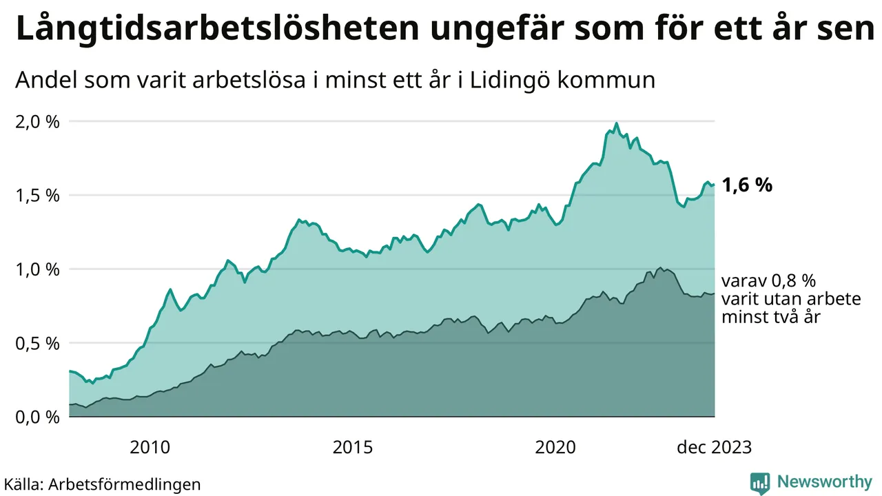 I december hade 360 Lidingöbor varit arbetslösa i minst ett år, vilket är tre fler än månaden innan. 360 personer motsvarar 1,6 procent av arbetskraften i kommunen – andelen långtidsarbetslösa är ungefär på samma nivå som för ett år sedan.