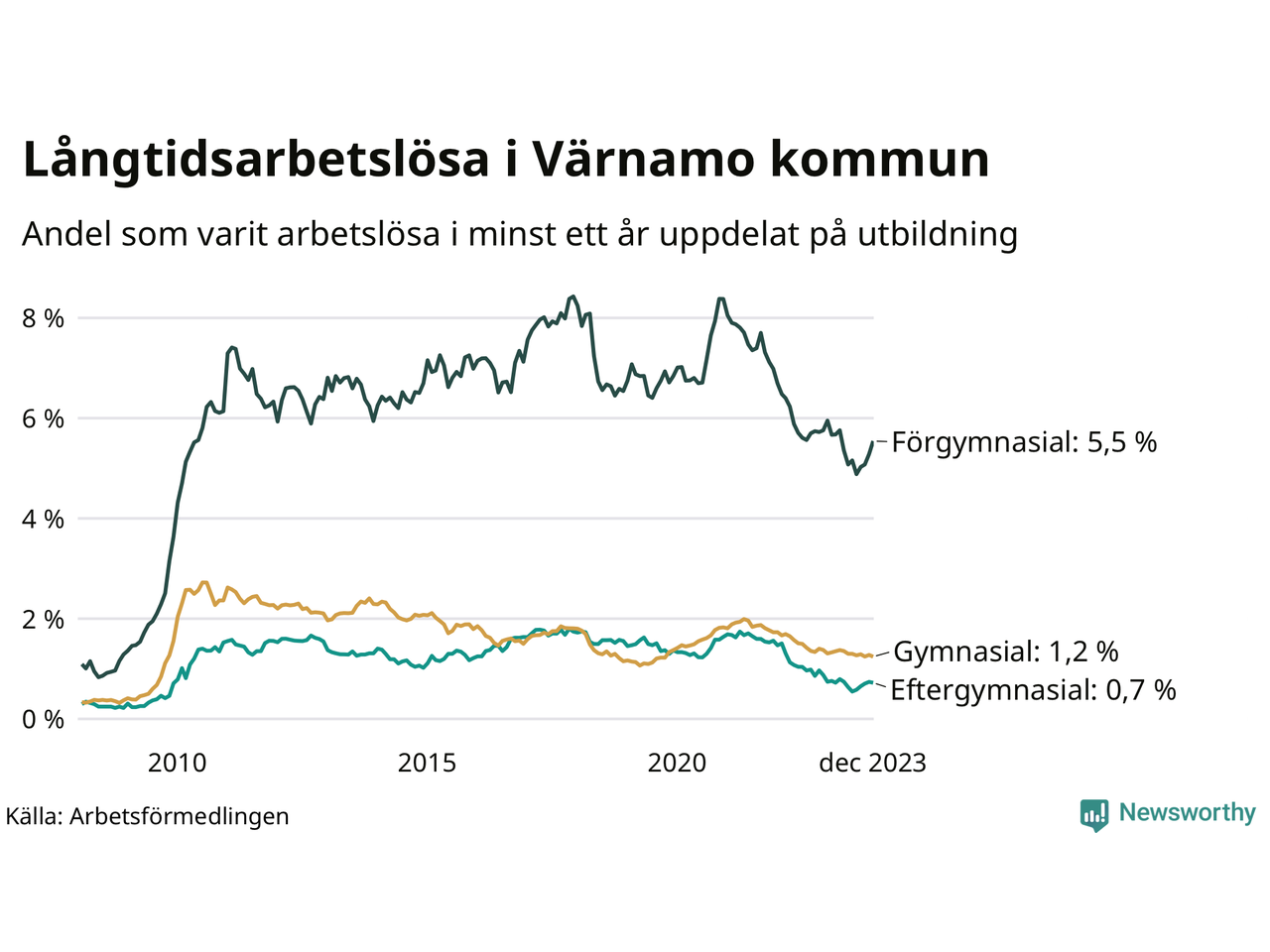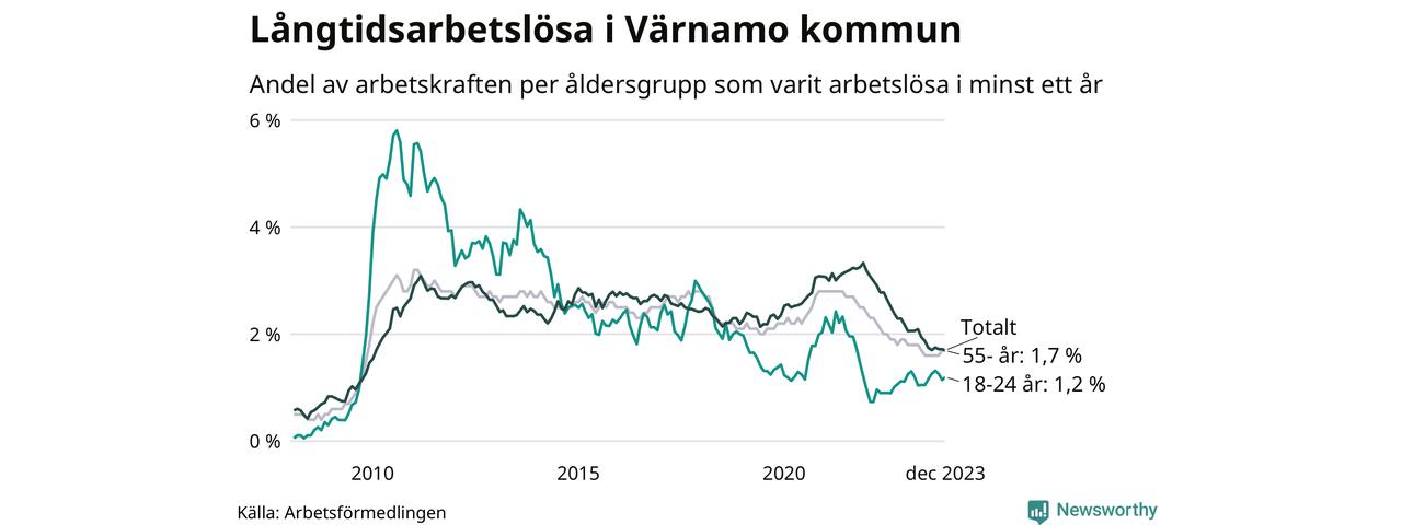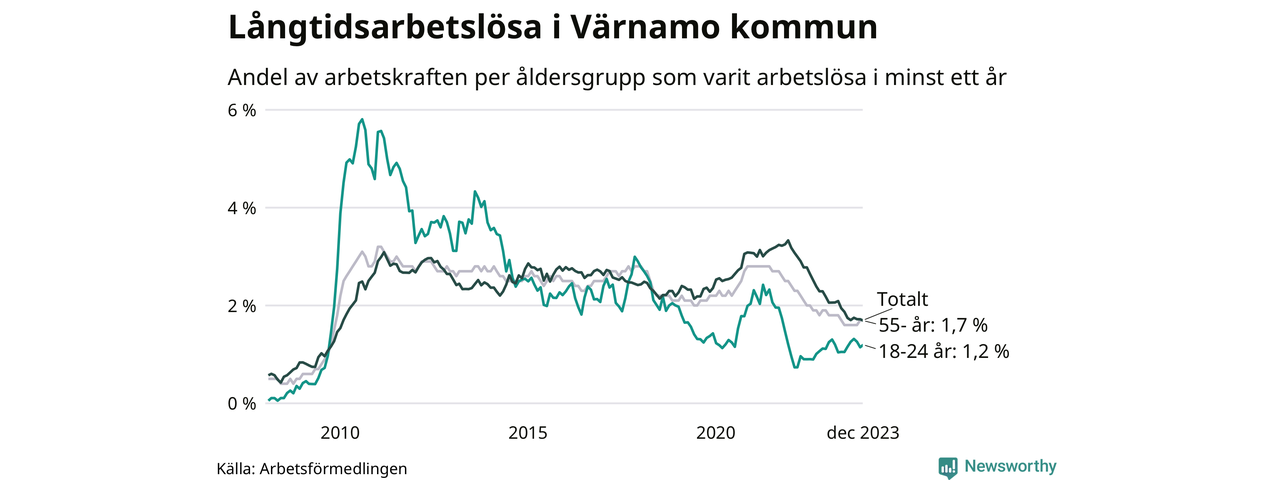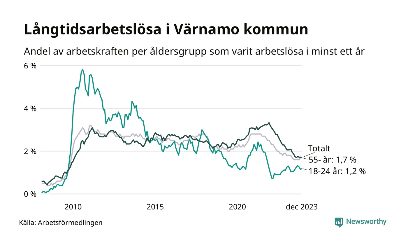 Av de 309 personerna som varit arbetslösa i mer än ett år i Värnamo kommun är 69 personer mellan 55 och 651 år och 22 är mellan 18 och 24 år. För den äldre gruppen är andelen arbetslösa 1,7 procent medan den i den yngre gruppen är 1,2 procent. Även i riket som helhet är långtidsarbetslösheten högre i gruppen äldre.