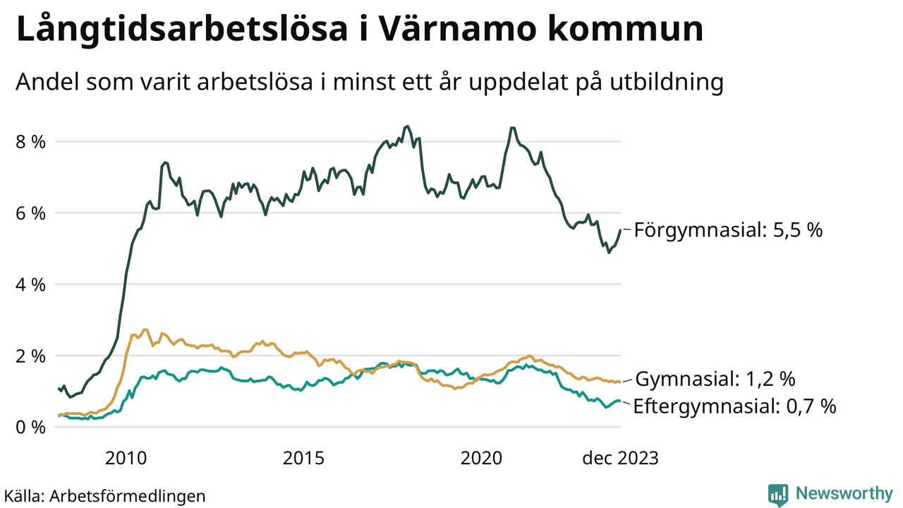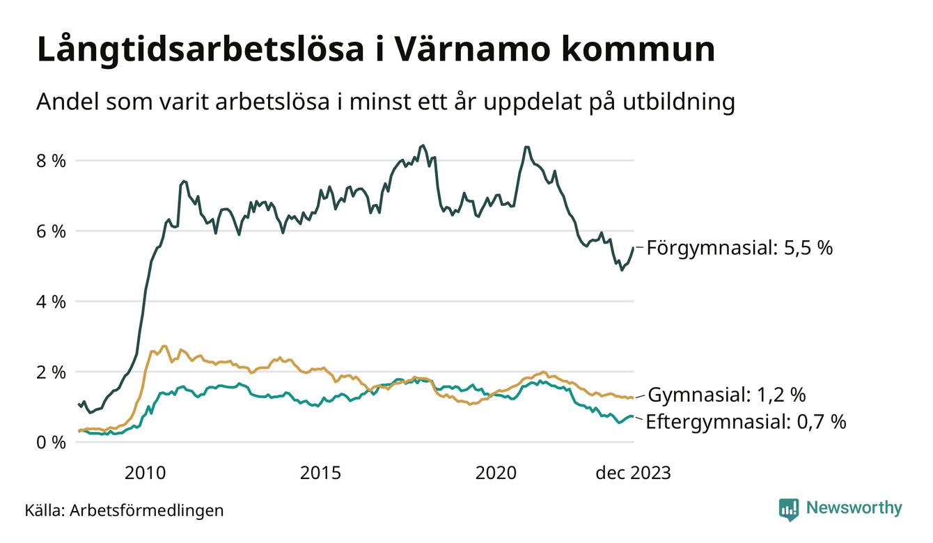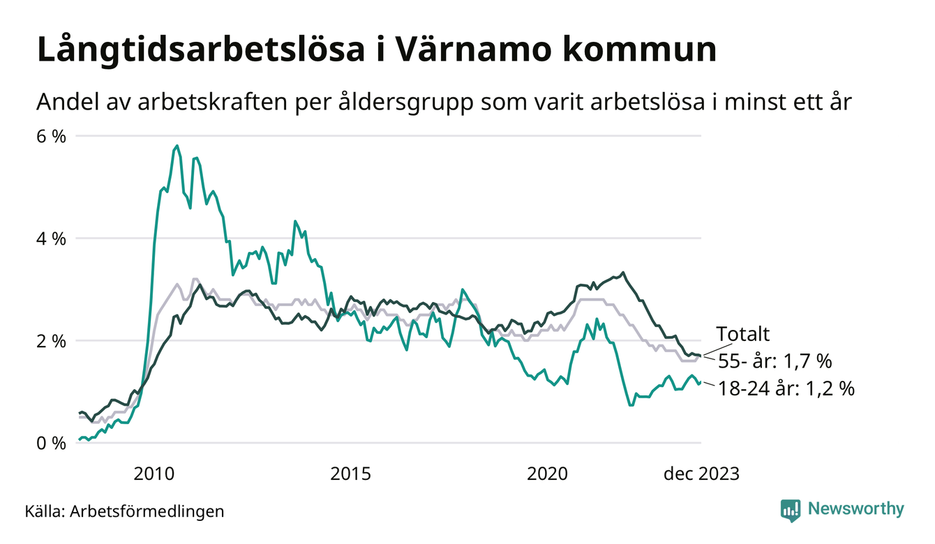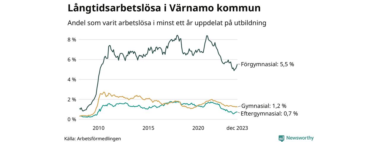 Av de 309 personerna som varit arbetslösa i mer än ett år i Värnamo kommun är 69 personer mellan 55 och 651 år och 22 är mellan 18 och 24 år. För den äldre gruppen är andelen arbetslösa 1,7 procent medan den i den yngre gruppen är 1,2 procent. Även i riket som helhet är långtidsarbetslösheten högre i gruppen äldre.