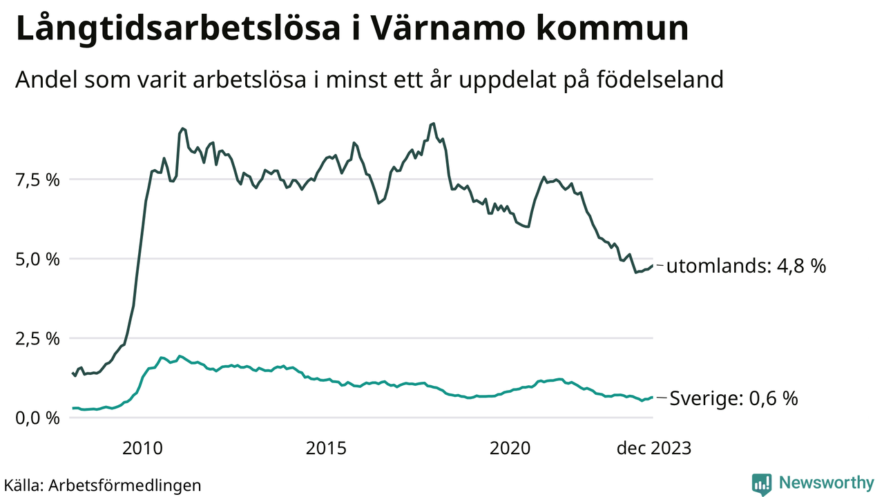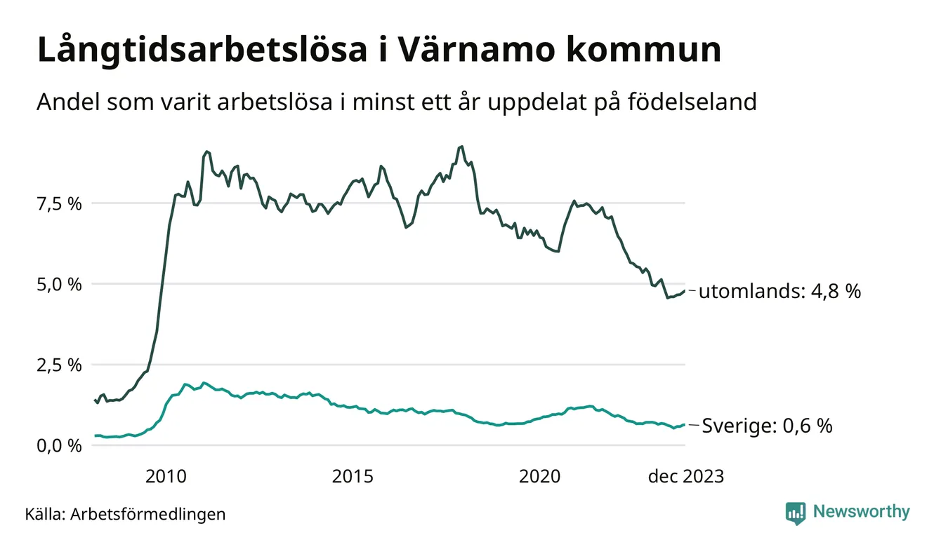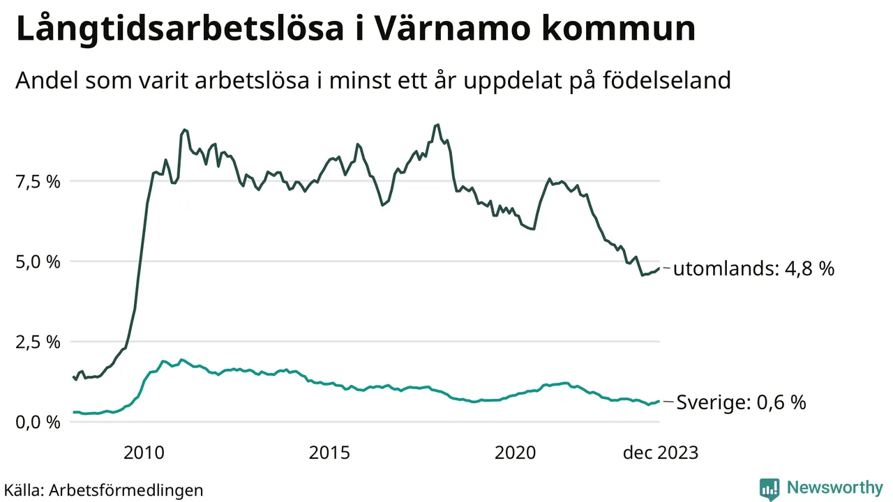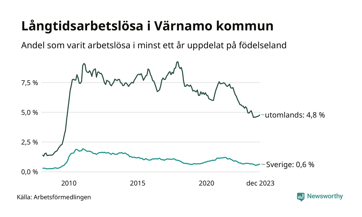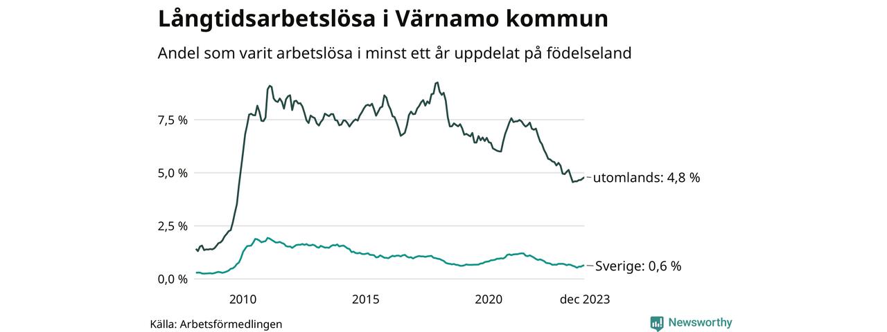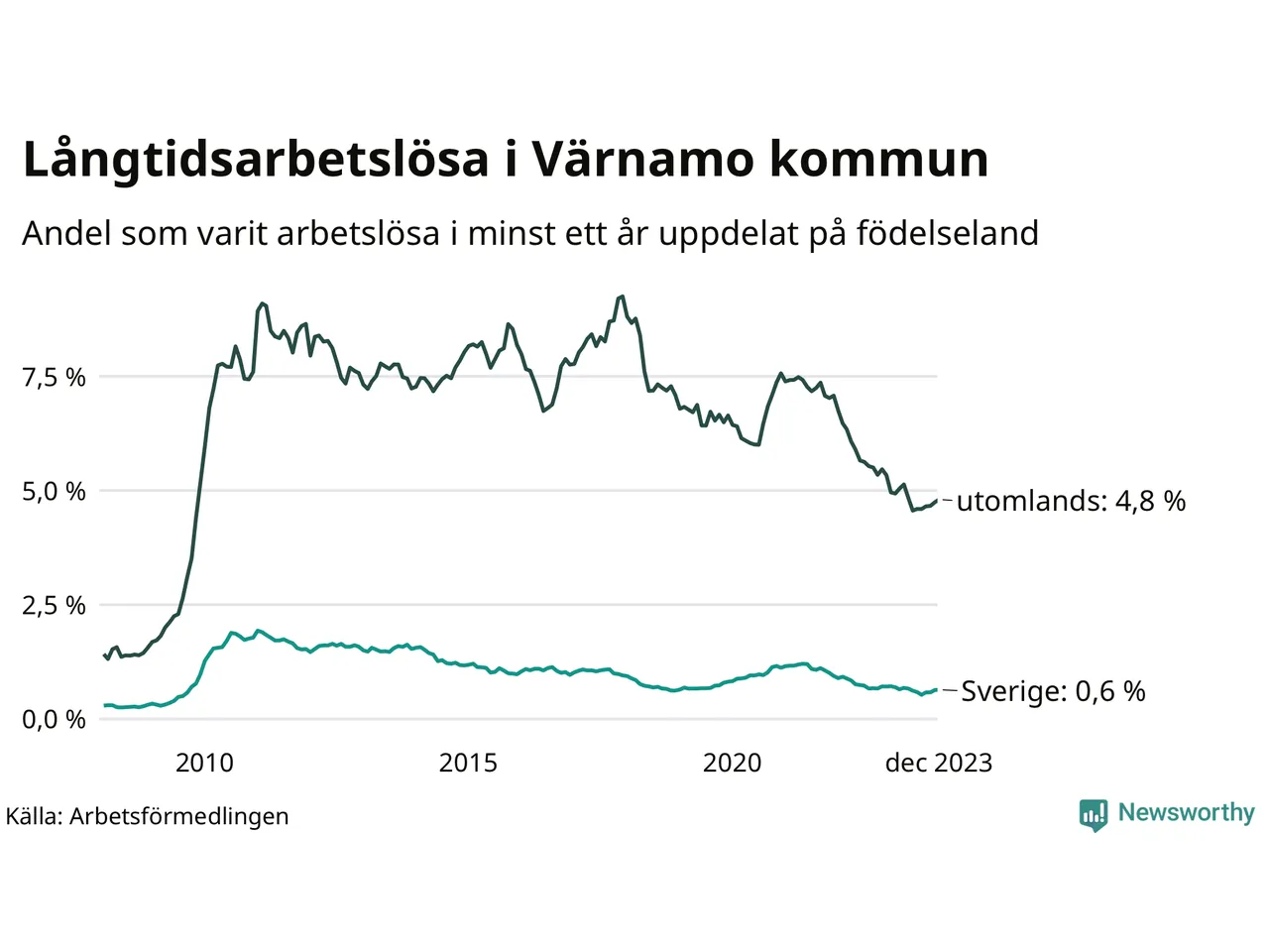 85 av de långtidsarbetslösa i Värnamo är födda i Sverige, medan 224 är födda utomlands. Det innebär att långtidsarbetslösheten bland Sverigefödda är 0,6 procent, medan den är åtta gånger så hög – 4,8 procent – bland födda utomlands. Även i riket som helhet är arbetslösheten högre bland utrikesfödda.