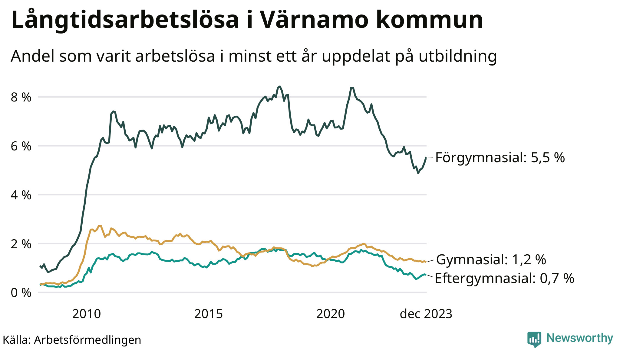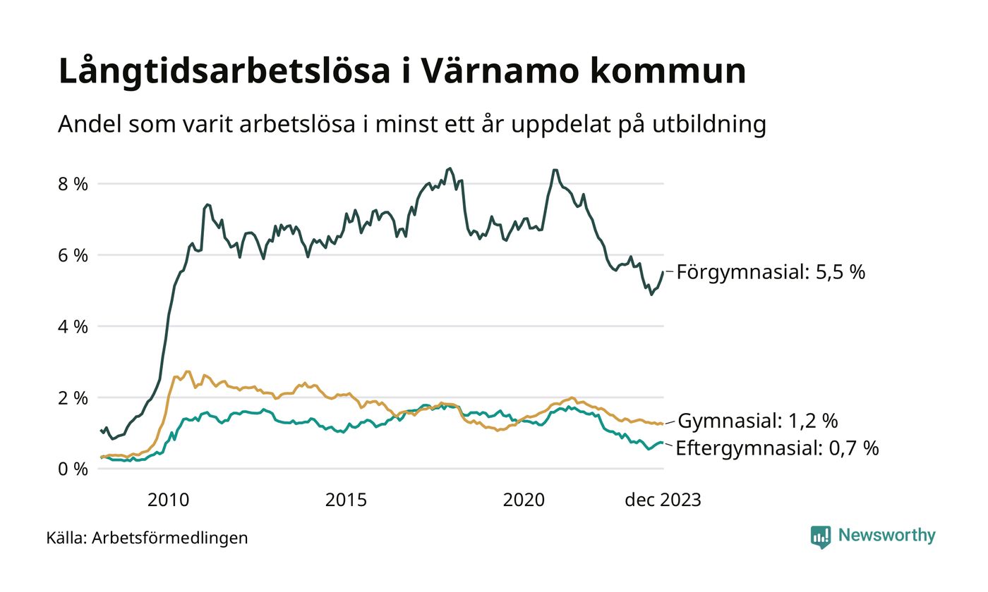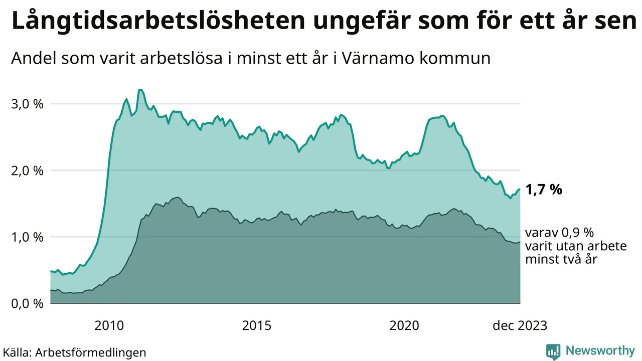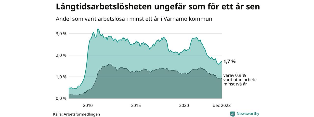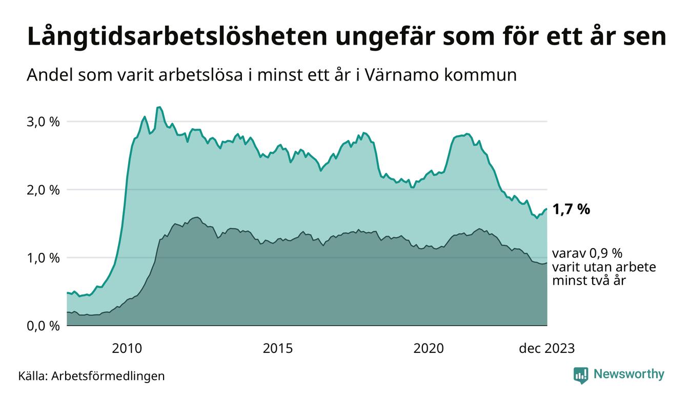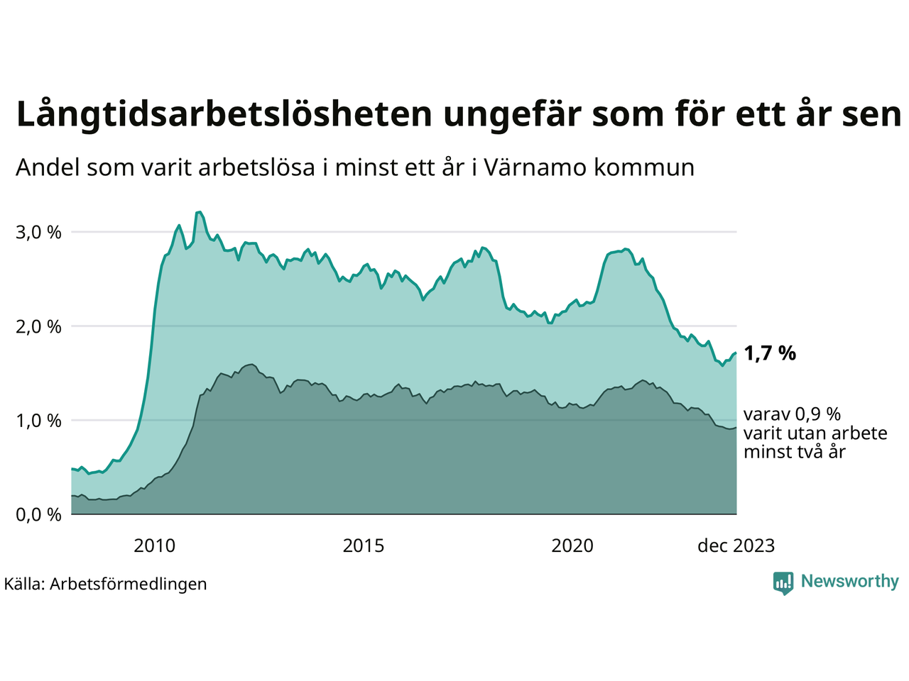 I december hade 309 Värnamobor varit arbetslösa i minst ett år, vilket är fem fler än månaden innan. Det är den fjärde månaden i rad med ökande antal långtidsarbetslösa. 309 personer motsvarar 1,7 procent av arbetskraften i kommunen – andelen långtidsarbetslösa är ungefär på samma nivå som för ett år sedan.