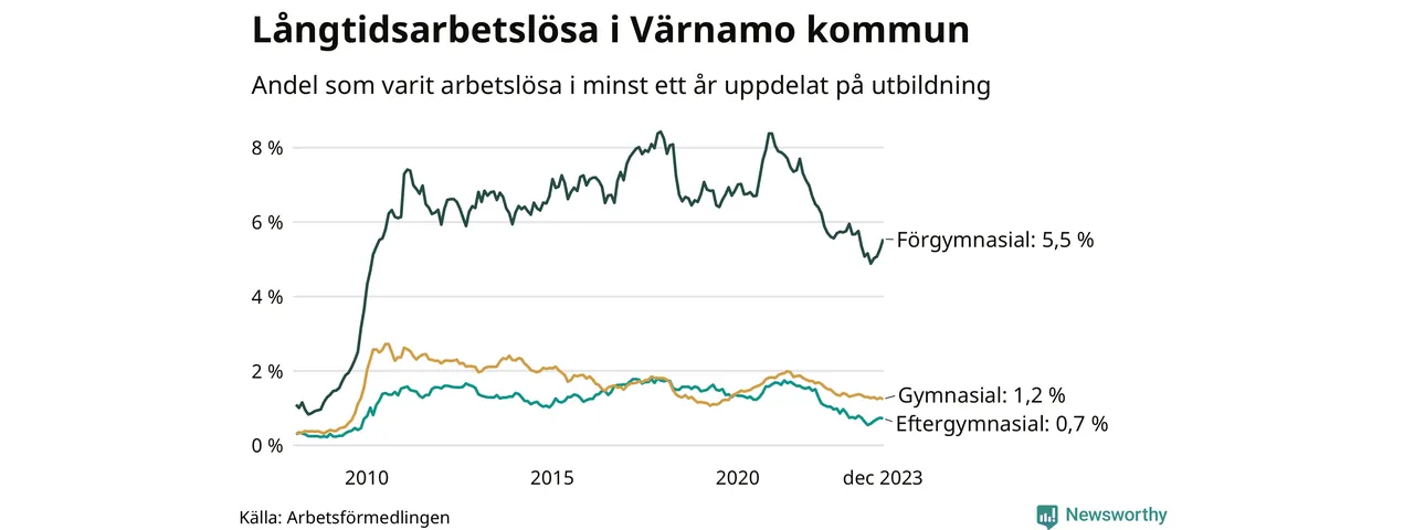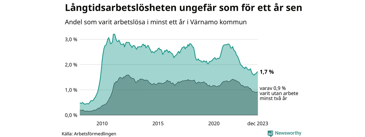 Andelen som varit utan arbete i minst ett år i Värnamo var ungefär lika stor i december jämfört med samma månad för ett år sedan. Det visar Arbetsfömedlingens senaste månadsstatistik.