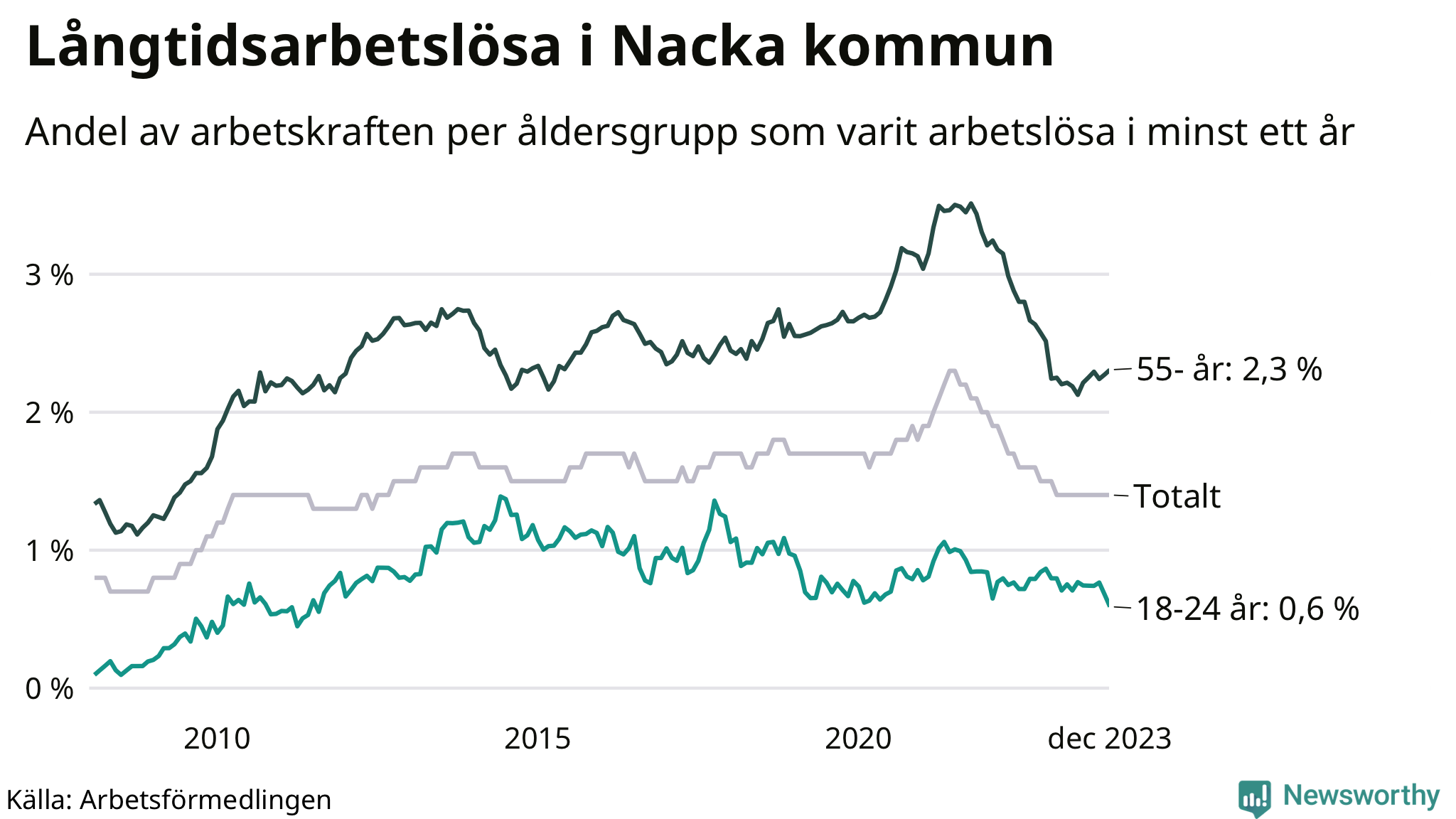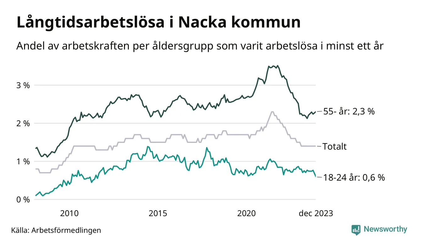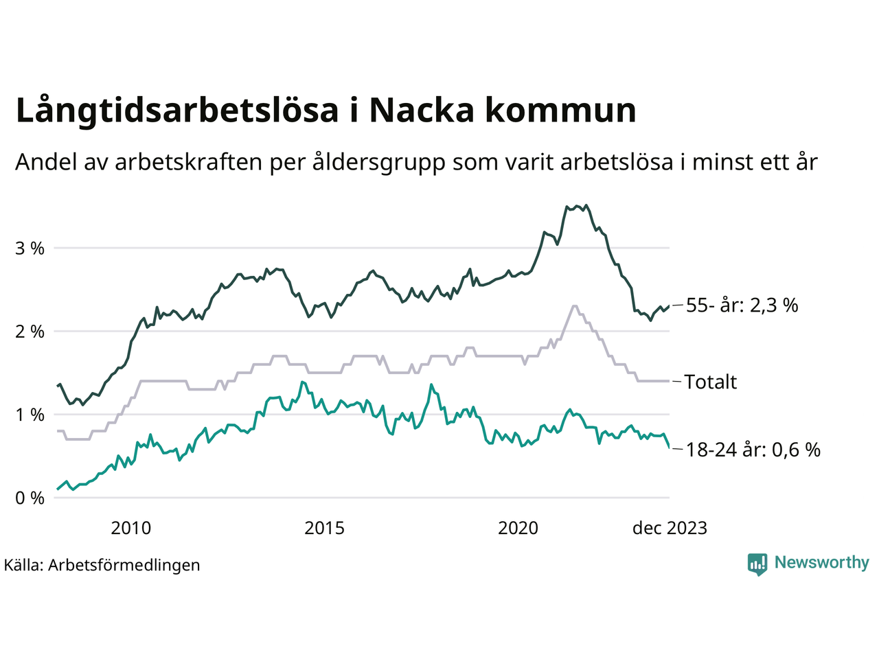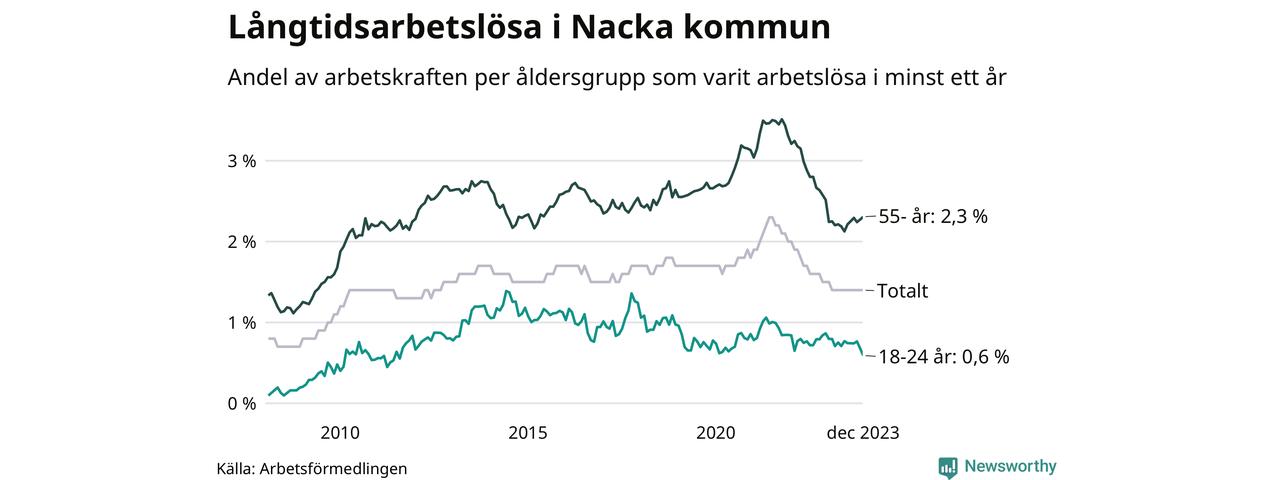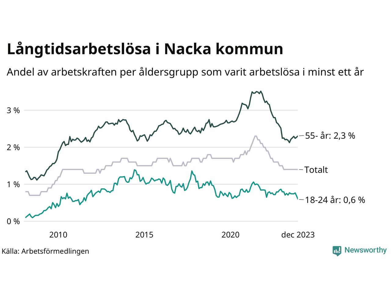 Av de 777 personerna som varit arbetslösa i mer än ett år i Nacka kommun är 250 personer mellan 55 och 651 år och 27 är mellan 18 och 24 år. För den äldre gruppen är andelen arbetslösa 2,3 procent medan den i den yngre gruppen är 0,6 procent. Även i riket som helhet är långtidsarbetslösheten högre i gruppen äldre.