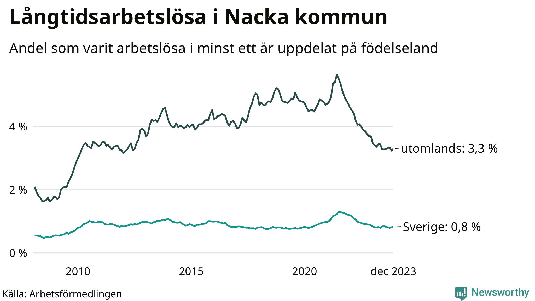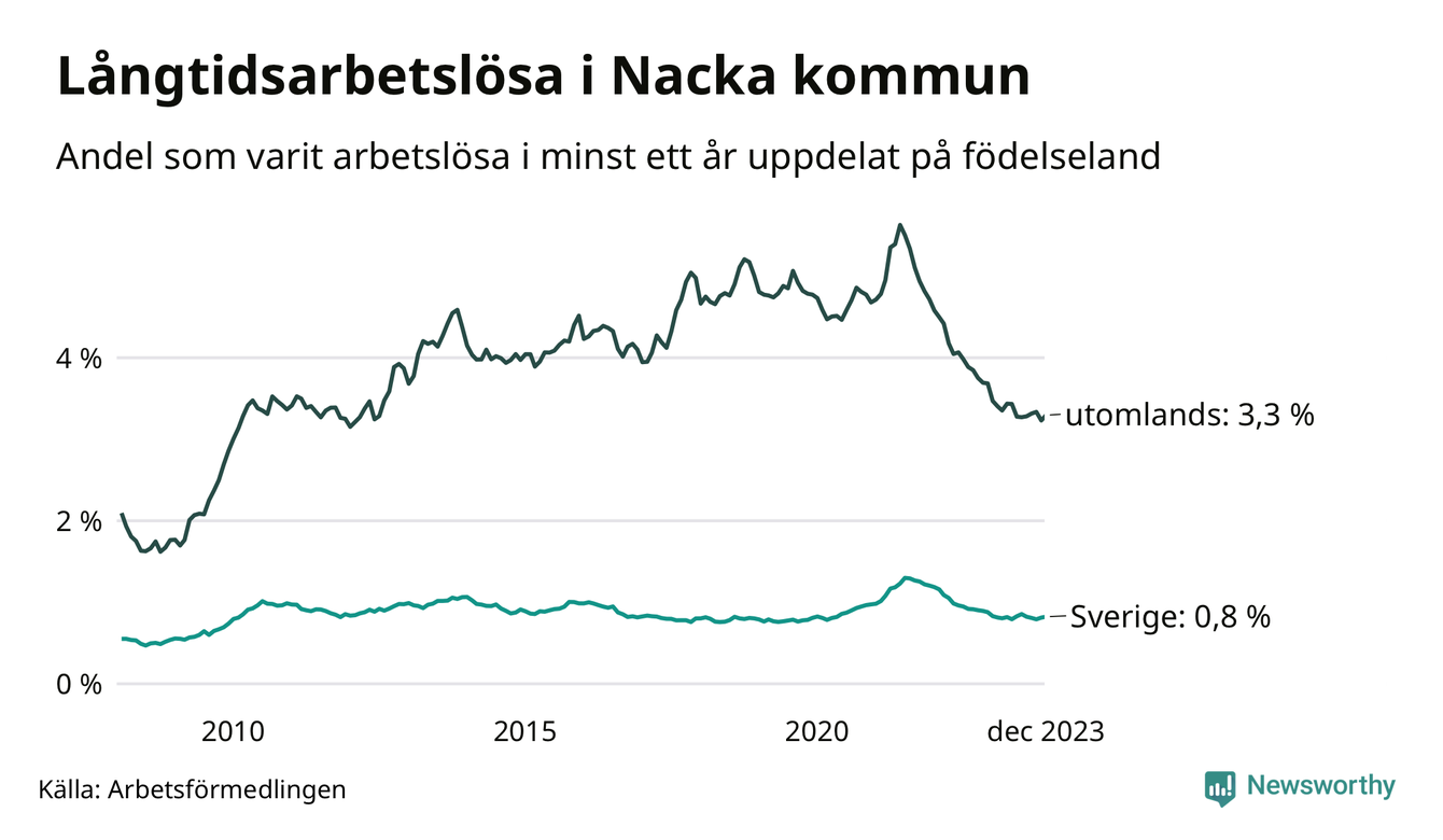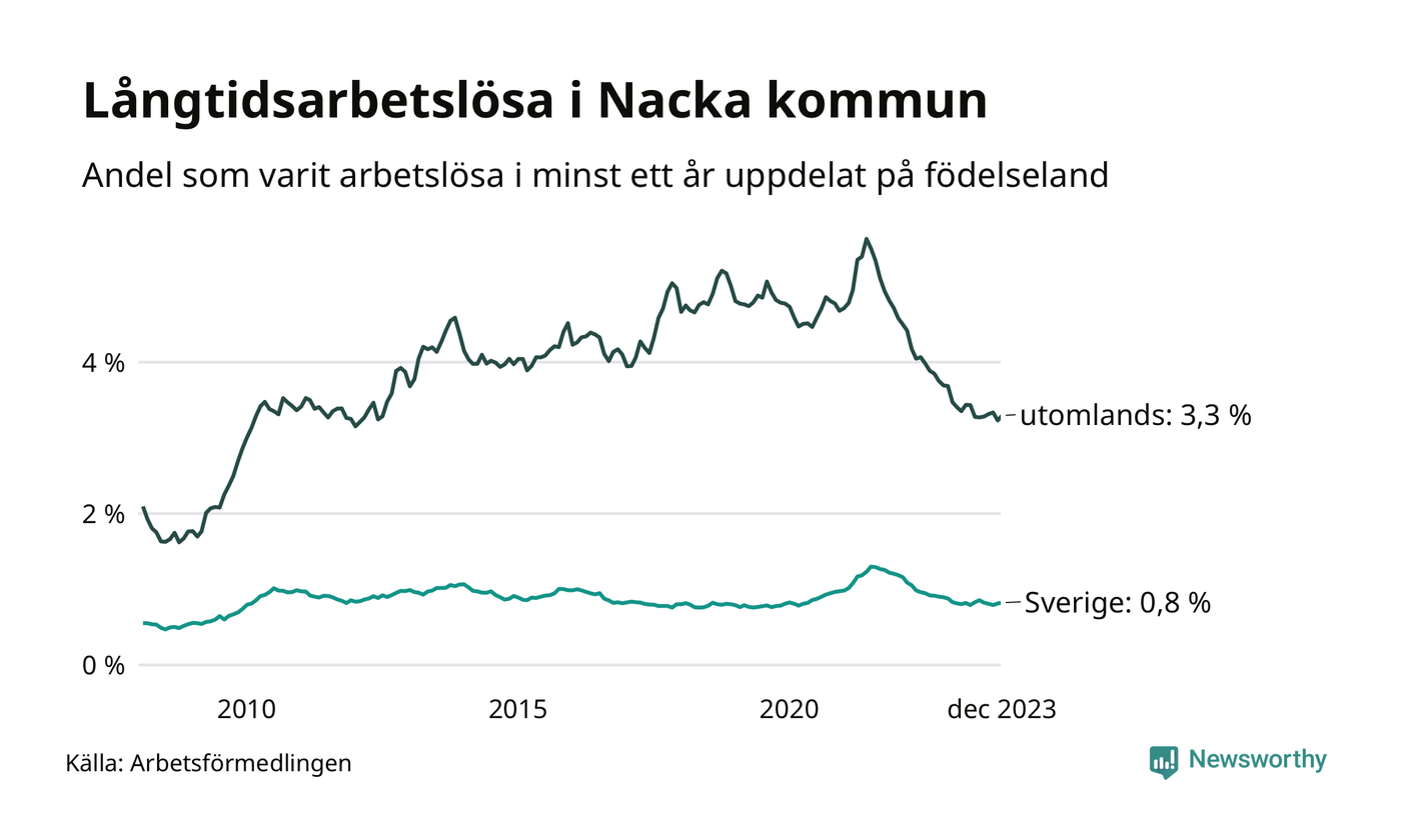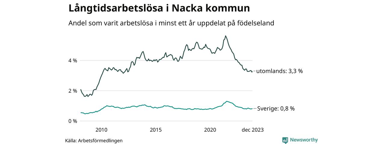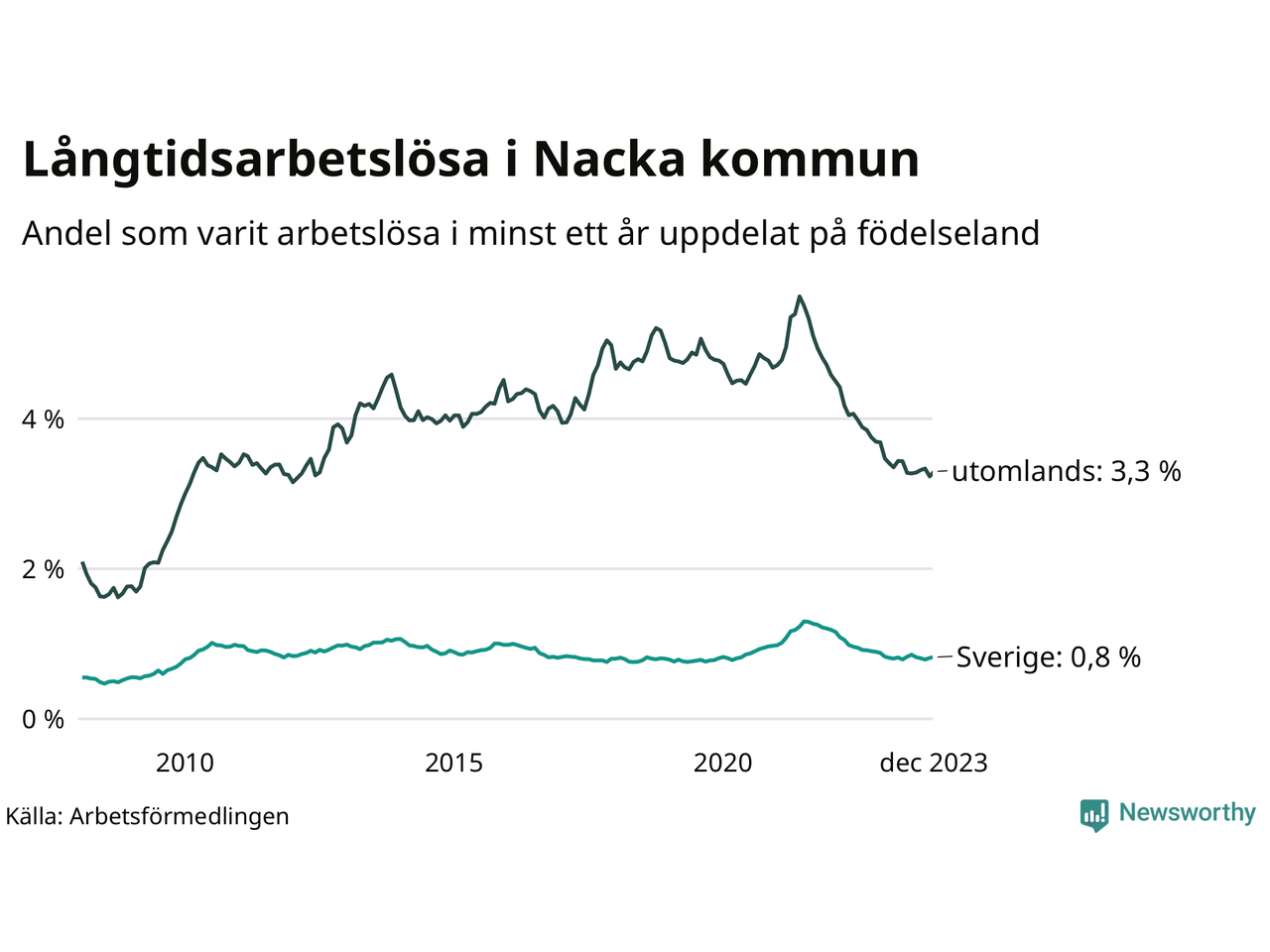 347 av de långtidsarbetslösa i Nacka är födda i Sverige, medan 430 är födda utomlands. Det innebär att långtidsarbetslösheten bland Sverigefödda är 0,8 procent, medan den är fyra gånger så hög – 3,3 procent – bland födda utomlands. Även i riket som helhet är arbetslösheten högre bland utrikesfödda.