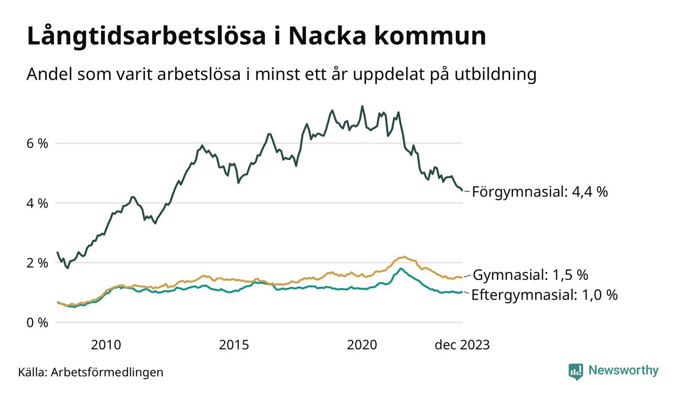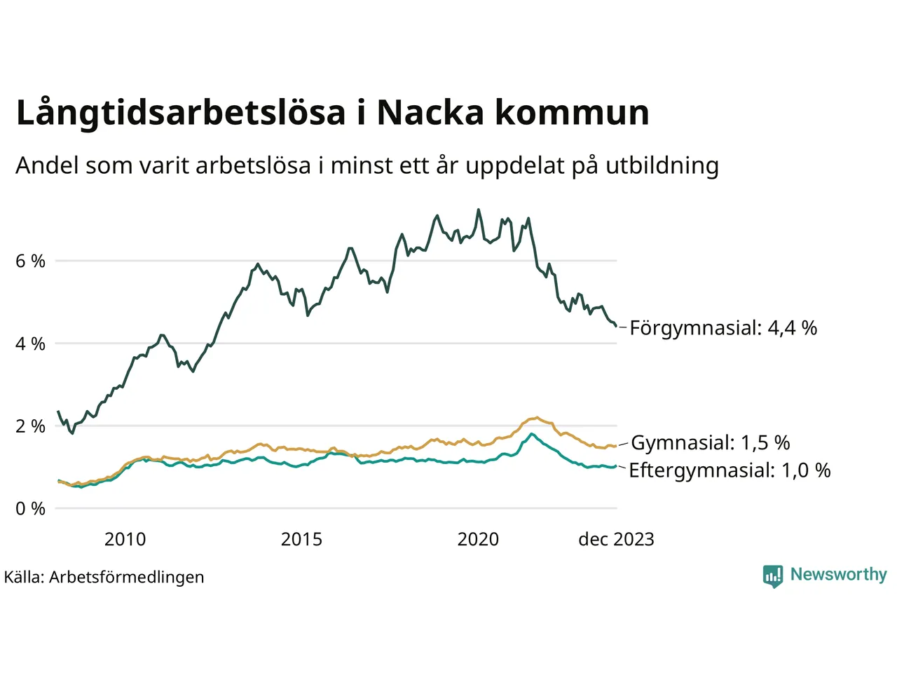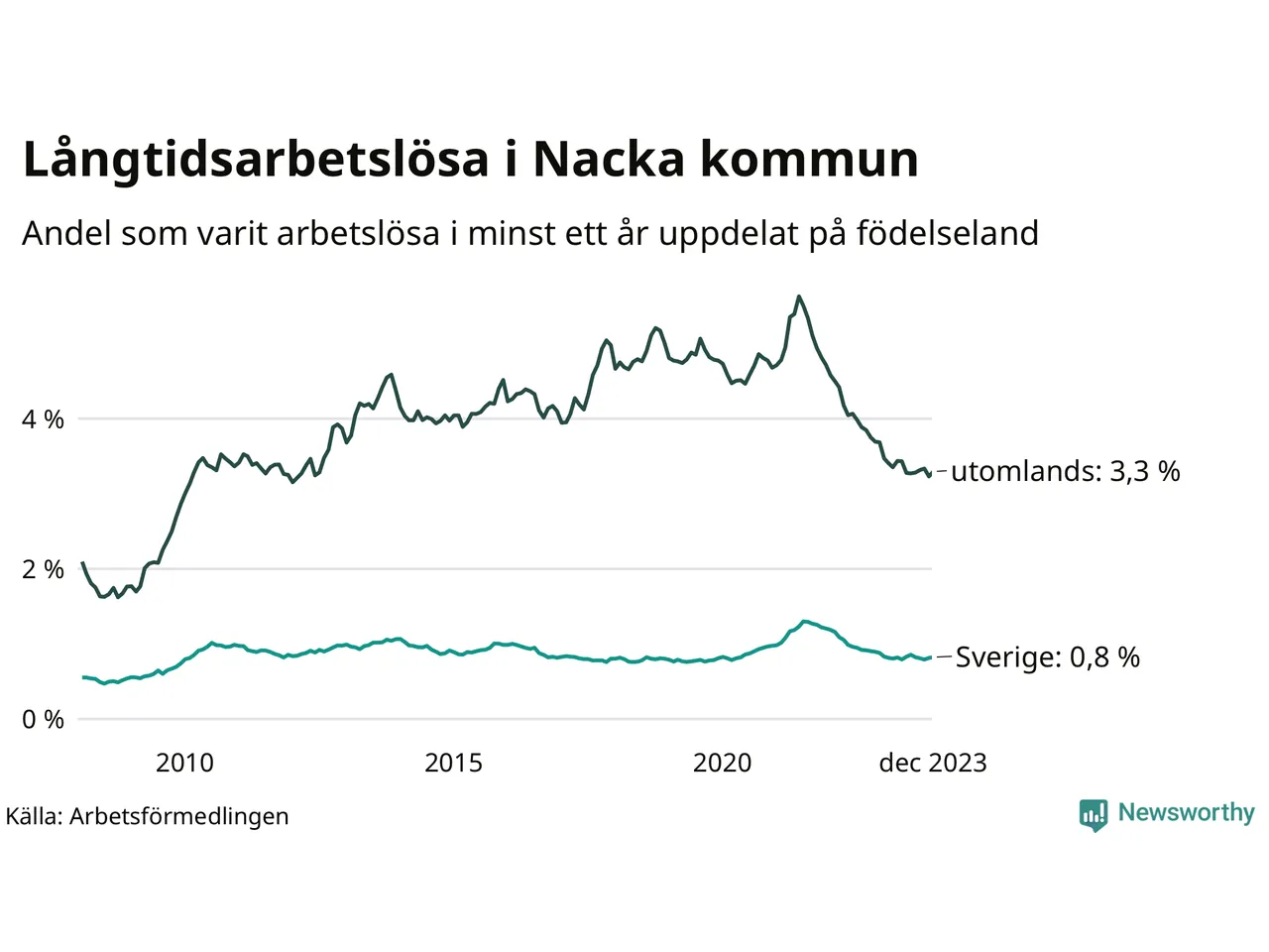 I december hade 777 Nackabor varit arbetslösa i minst ett år, vilket är 15 fler än månaden innan. Det är den första månaden sedan juli 2023 som antalet arbetslösa ökar. 777 personer motsvarar 1,4 procent av arbetskraften i kommunen – andelen långtidsarbetslösa är ungefär på samma nivå som för ett år sedan.