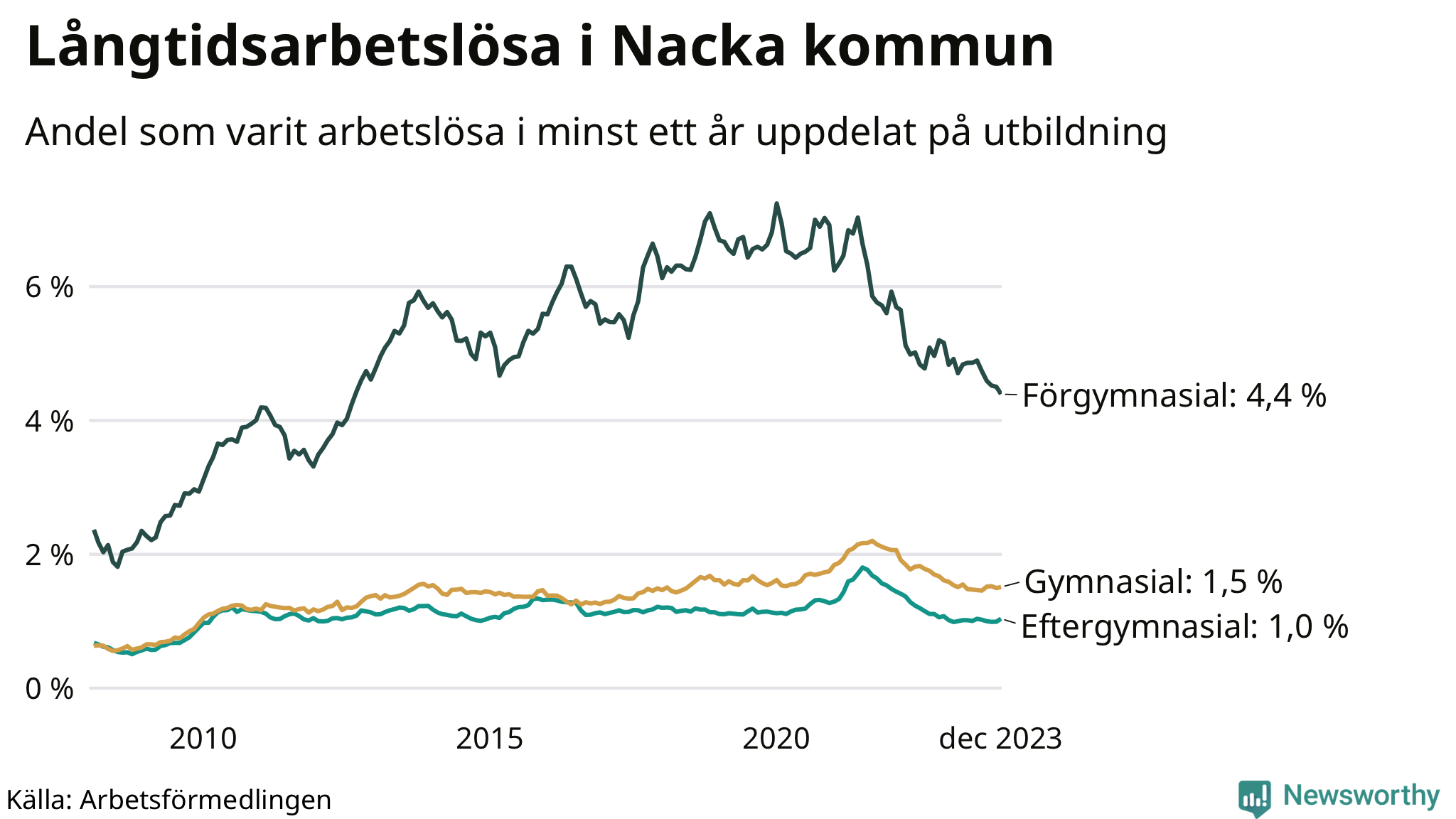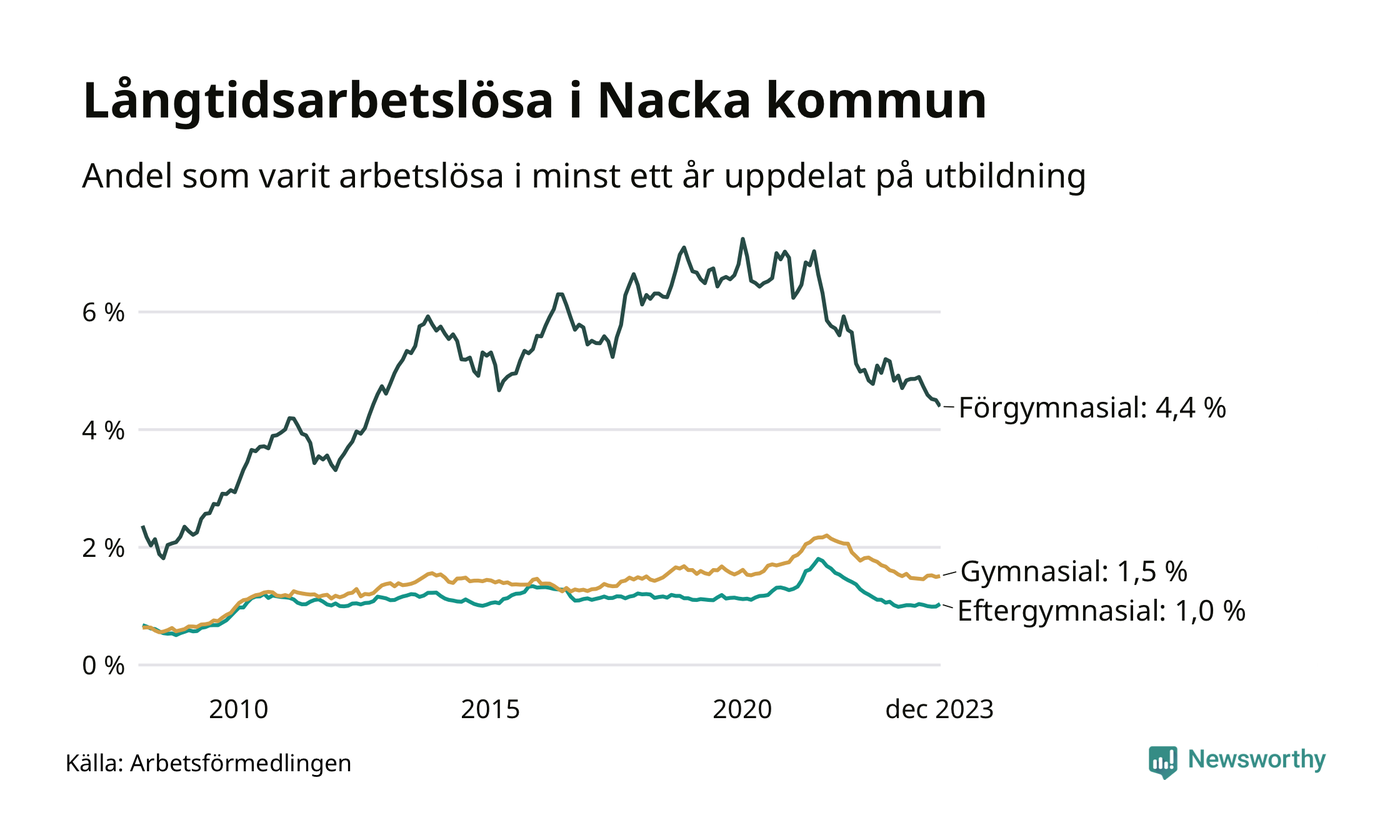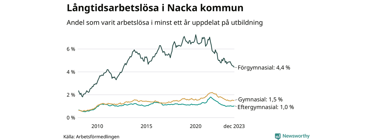 I december hade 777 Nackabor varit arbetslösa i minst ett år, vilket är 15 fler än månaden innan. Det är den första månaden sedan juli 2023 som antalet arbetslösa ökar. 777 personer motsvarar 1,4 procent av arbetskraften i kommunen – andelen långtidsarbetslösa är ungefär på samma nivå som för ett år sedan.