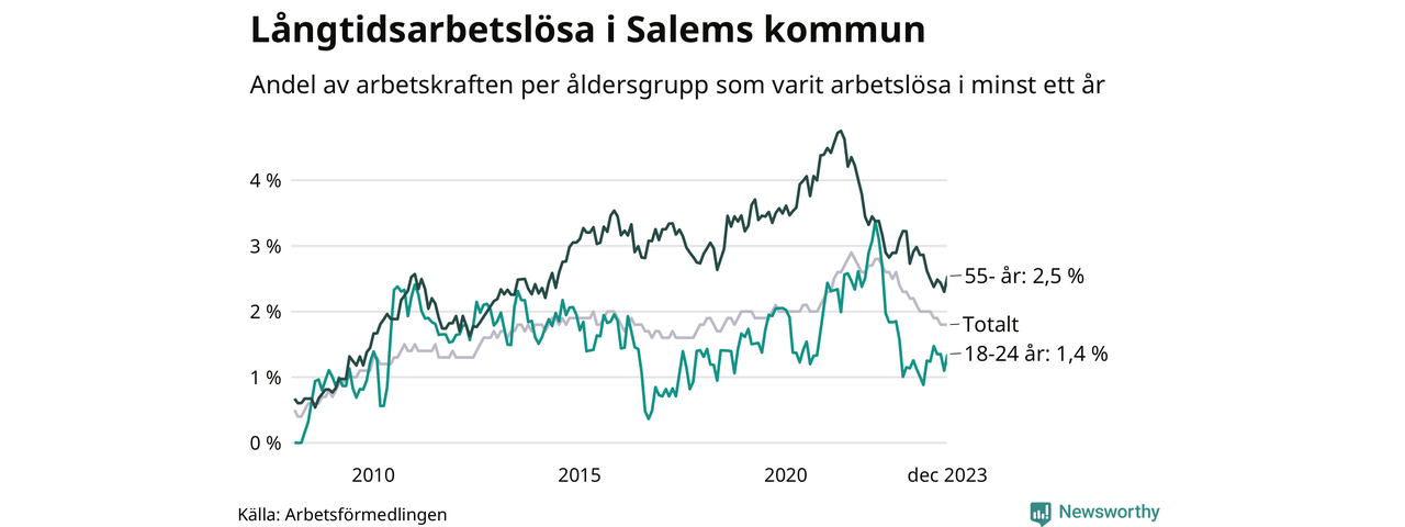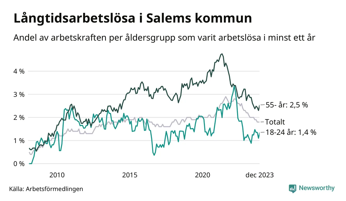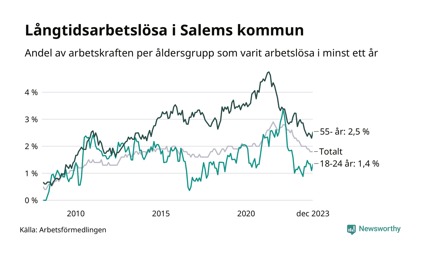 Av de 156 personerna som varit arbetslösa i mer än ett år i Salems kommun är 41 personer mellan 55 och 651 år och elva är mellan 18 och 24 år. För den äldre gruppen är andelen arbetslösa 2,5 procent medan den i den yngre gruppen är 1,4 procent. Även i riket som helhet är långtidsarbetslösheten högre i gruppen äldre.