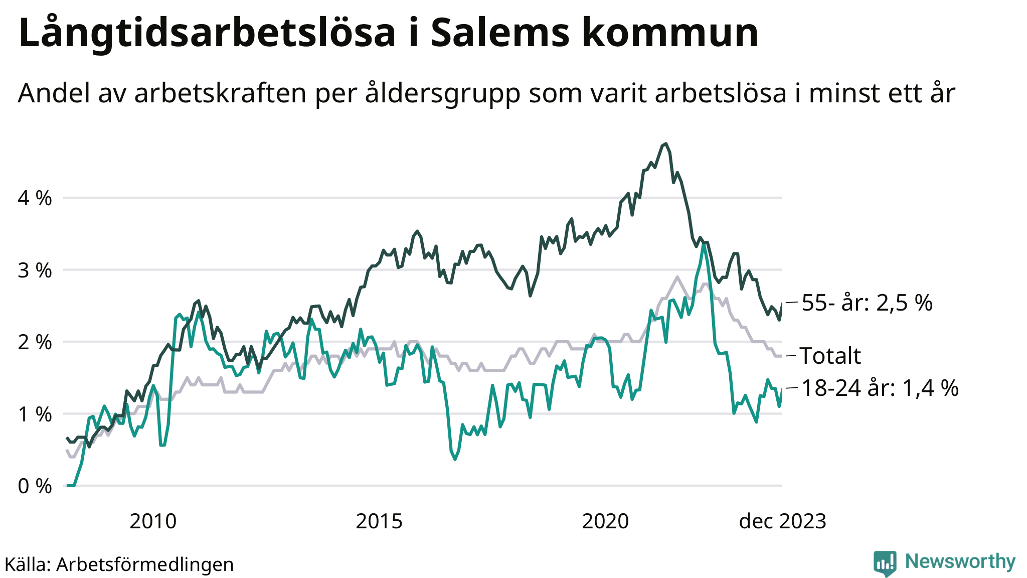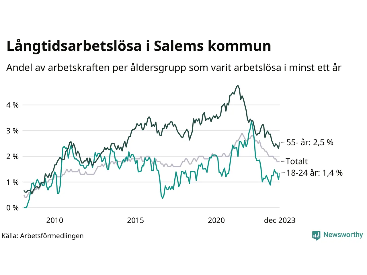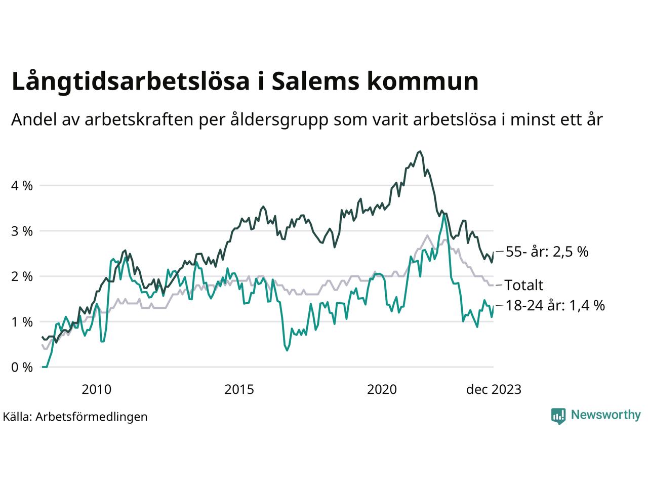 Av de 156 personerna som varit arbetslösa i mer än ett år i Salems kommun är 41 personer mellan 55 och 651 år och elva är mellan 18 och 24 år. För den äldre gruppen är andelen arbetslösa 2,5 procent medan den i den yngre gruppen är 1,4 procent. Även i riket som helhet är långtidsarbetslösheten högre i gruppen äldre.