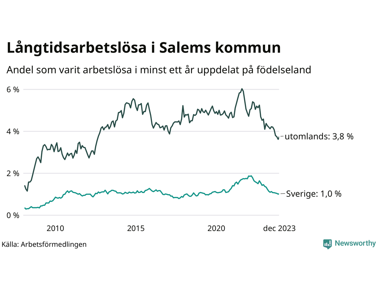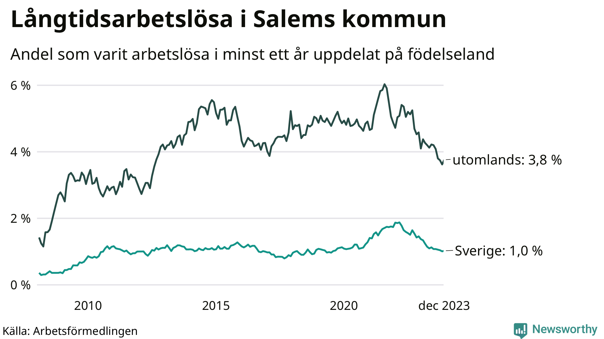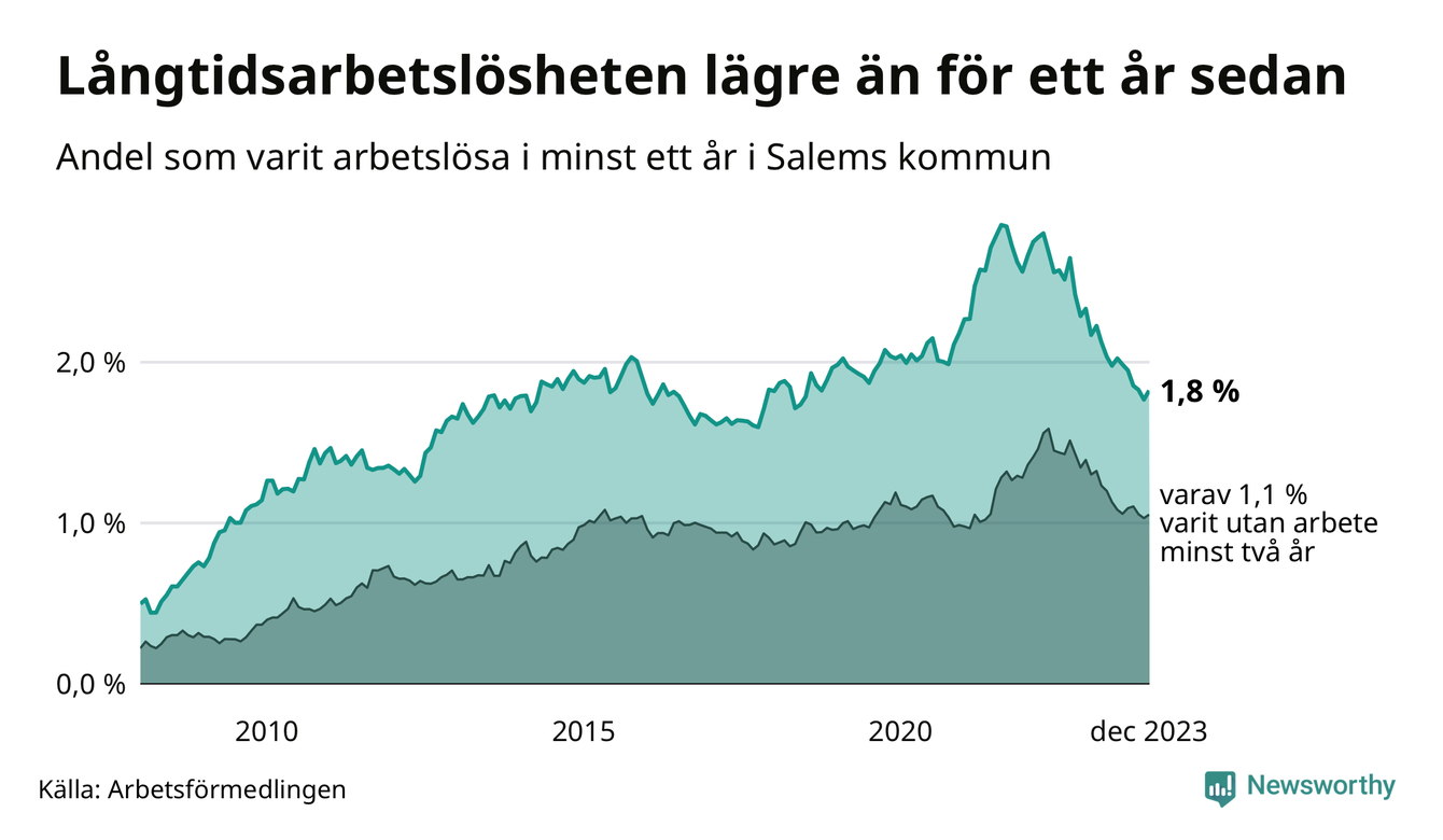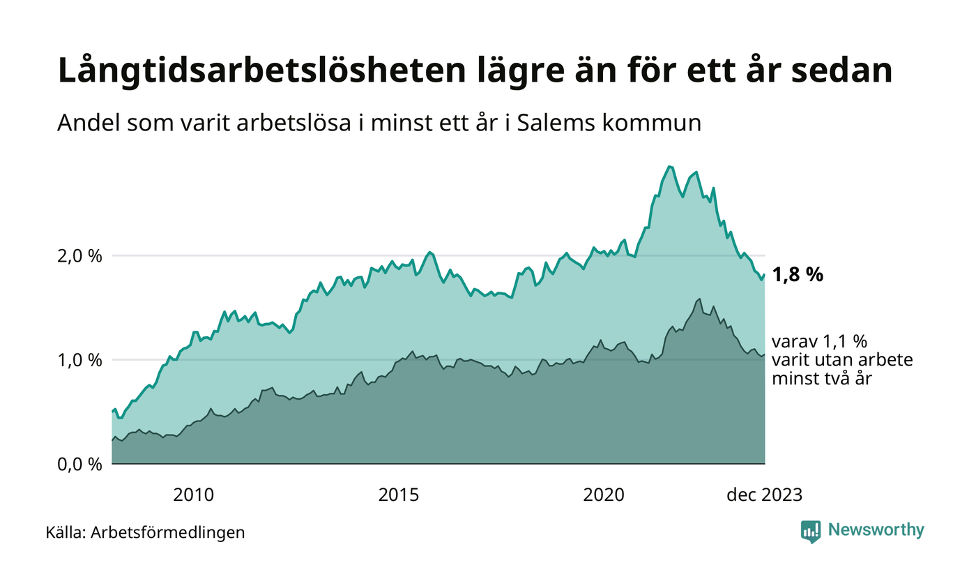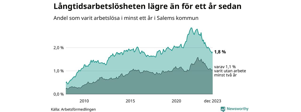 I december hade 156 Salembor varit arbetslösa i minst ett år, vilket är fem fler än månaden innan. Det är den första månaden sedan juni 2023 som antalet arbetslösa ökar. 156 personer motsvarar 1,8 procent av arbetskraften i kommunen – andelen långtidsarbetslösa är 0,5 procentenheter lägre än samma månad för ett år sedan.