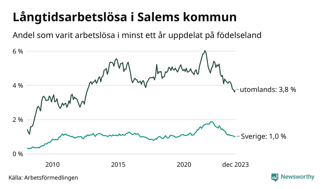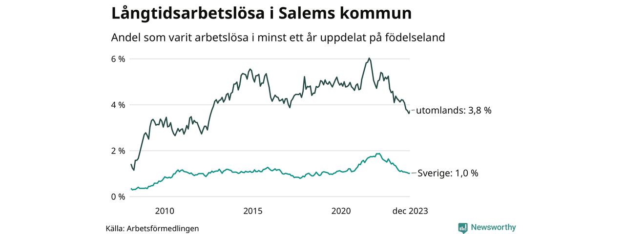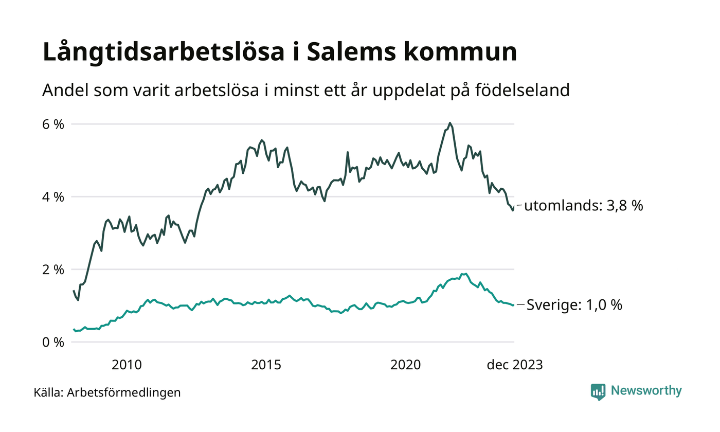 62 av de långtidsarbetslösa i Salem är födda i Sverige, medan 94 är födda utomlands. Det innebär att långtidsarbetslösheten bland Sverigefödda är 1,0 procent, medan den är fyra gånger så hög – 3,8 procent – bland födda utomlands. Även i riket som helhet är arbetslösheten högre bland utrikesfödda.