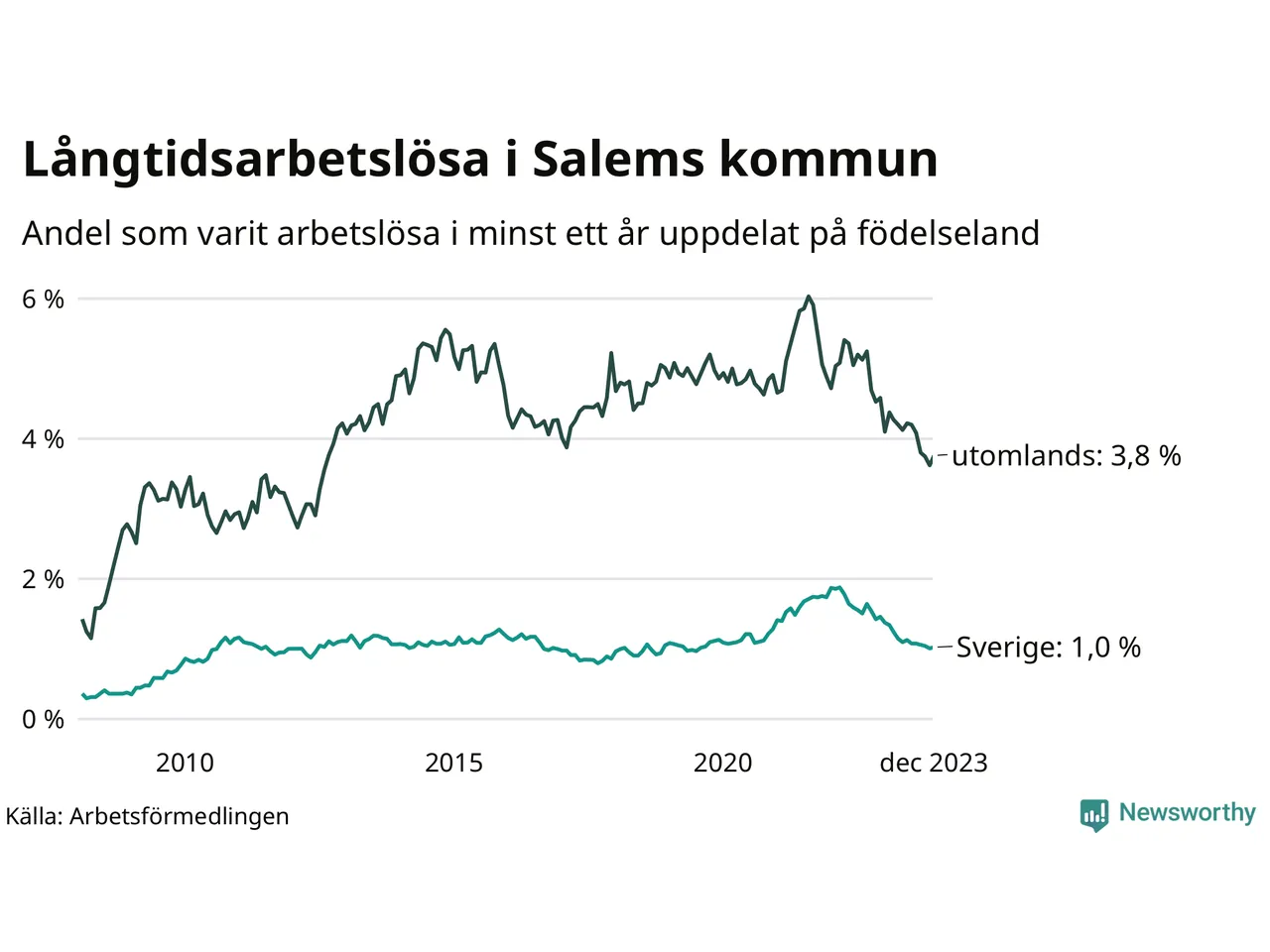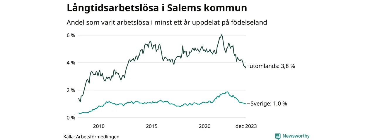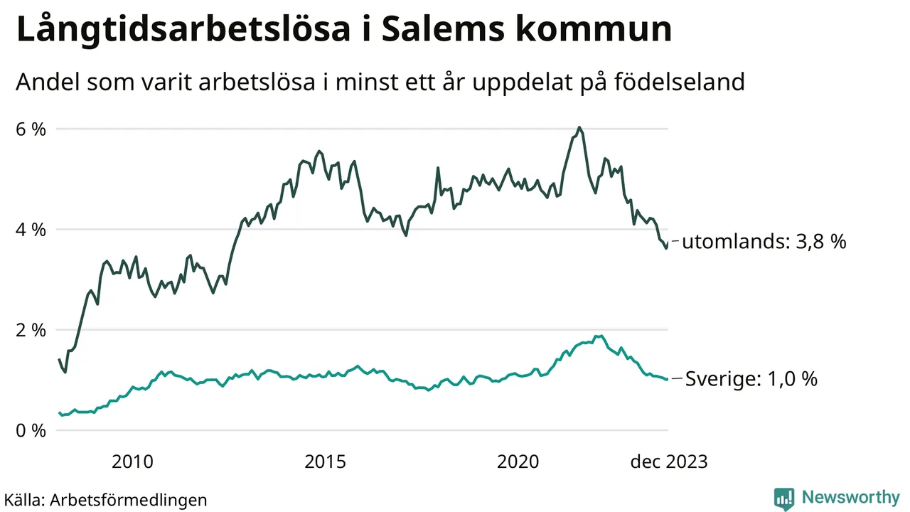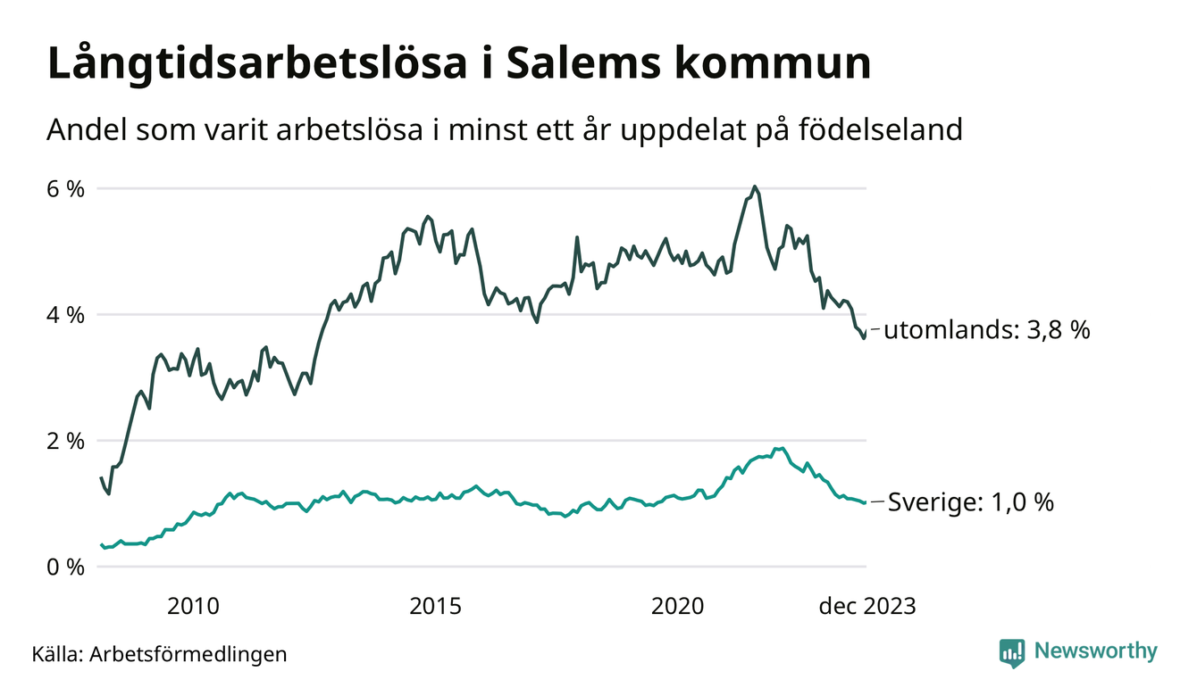 62 av de långtidsarbetslösa i Salem är födda i Sverige, medan 94 är födda utomlands. Det innebär att långtidsarbetslösheten bland Sverigefödda är 1,0 procent, medan den är fyra gånger så hög – 3,8 procent – bland födda utomlands. Även i riket som helhet är arbetslösheten högre bland utrikesfödda.