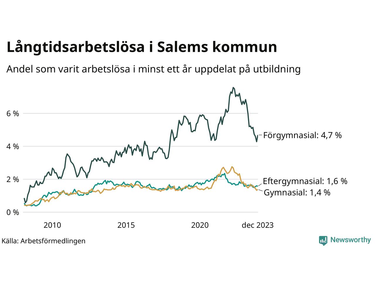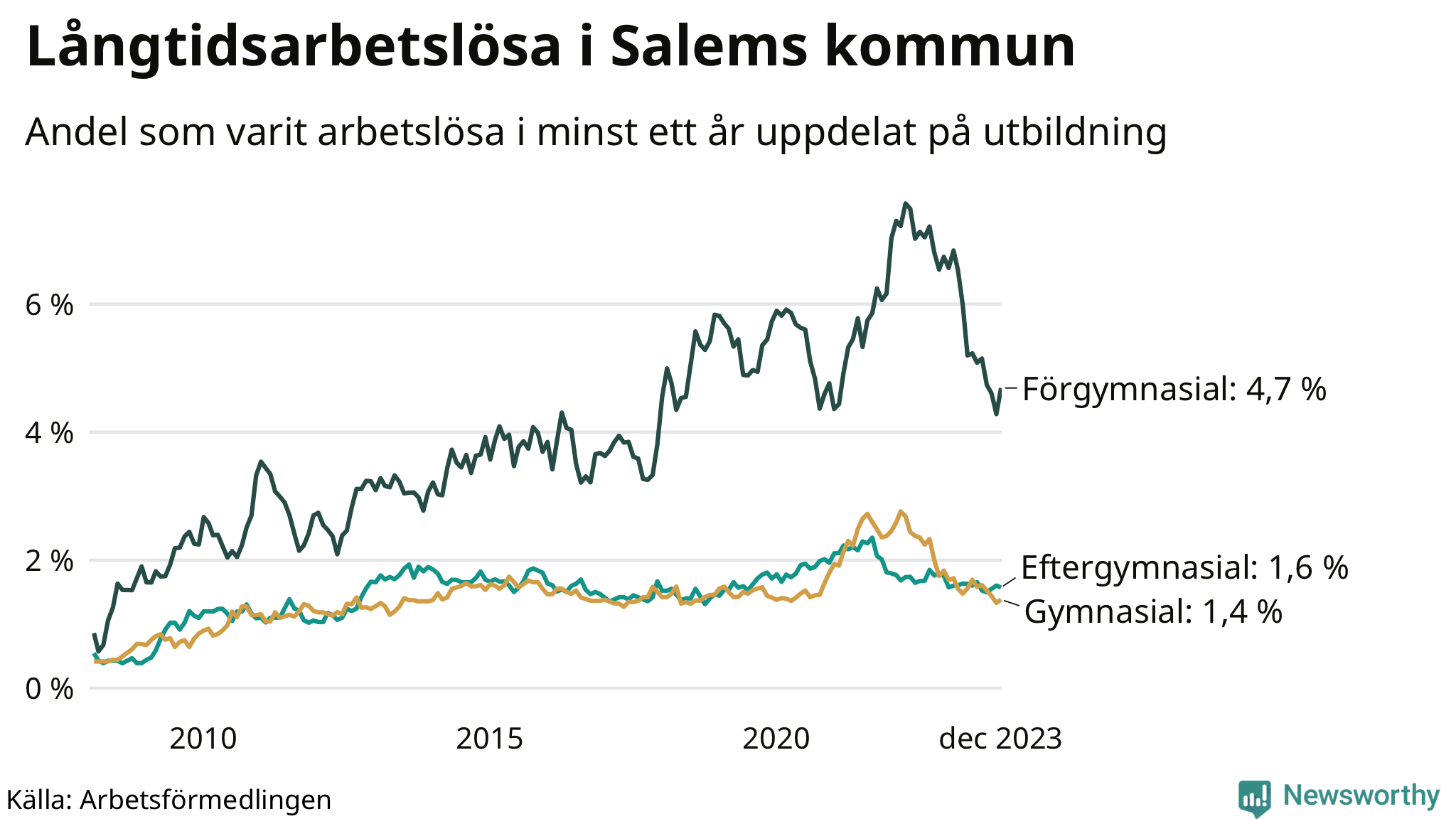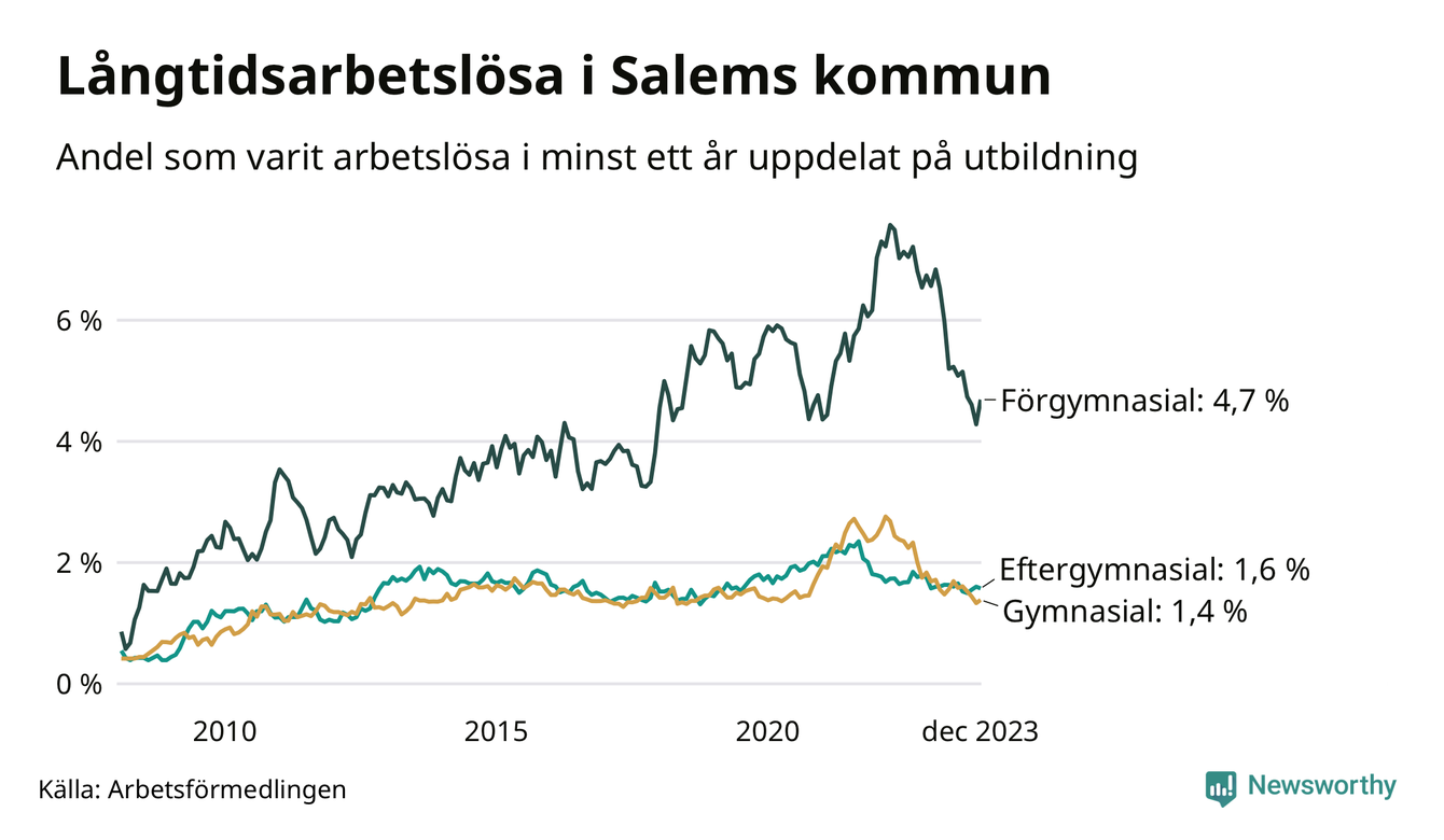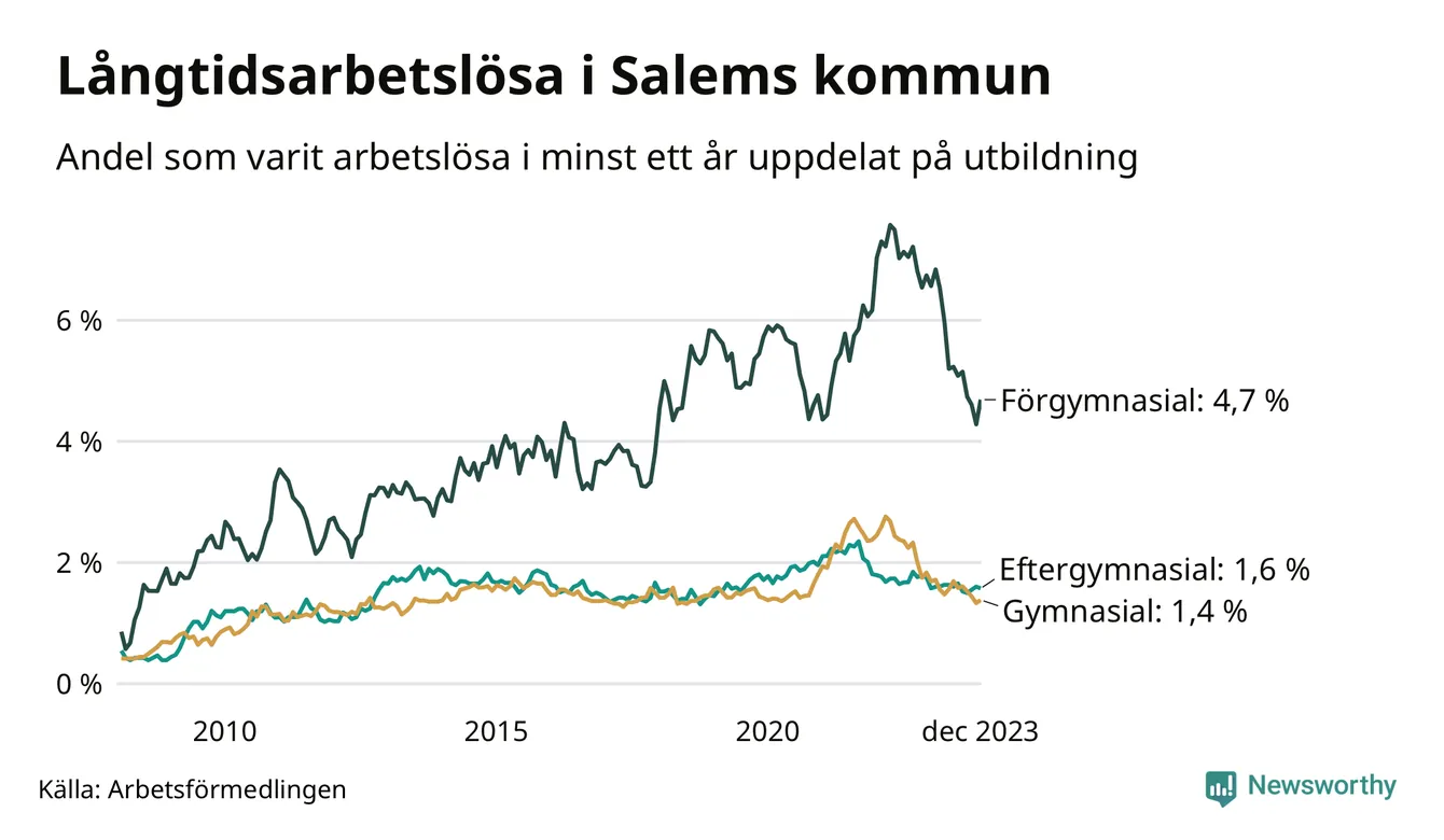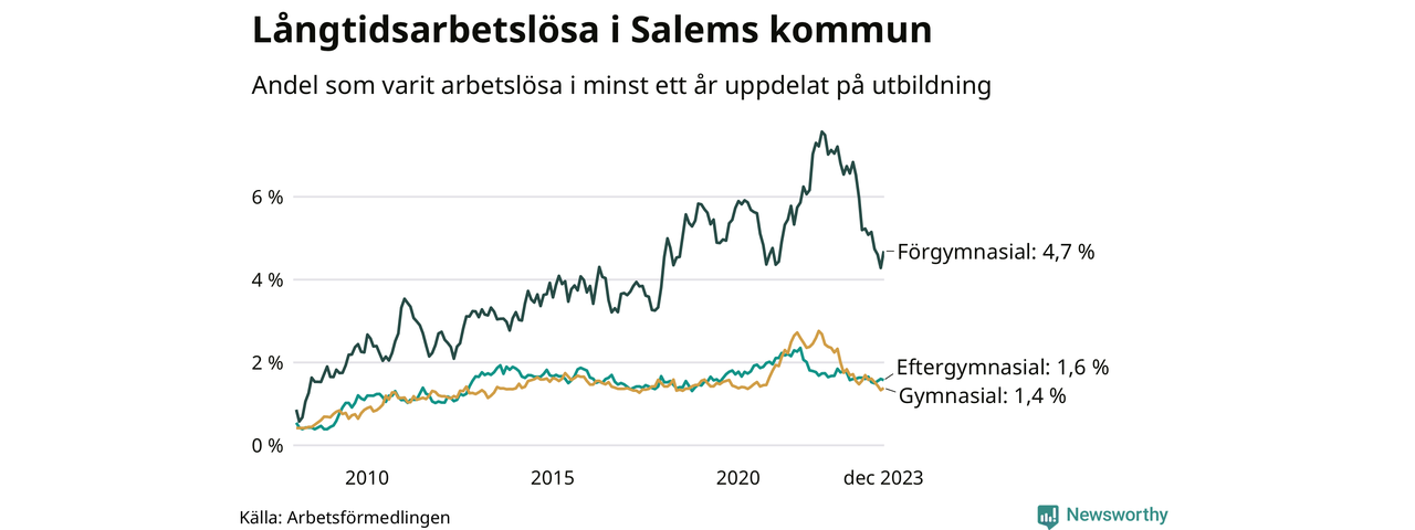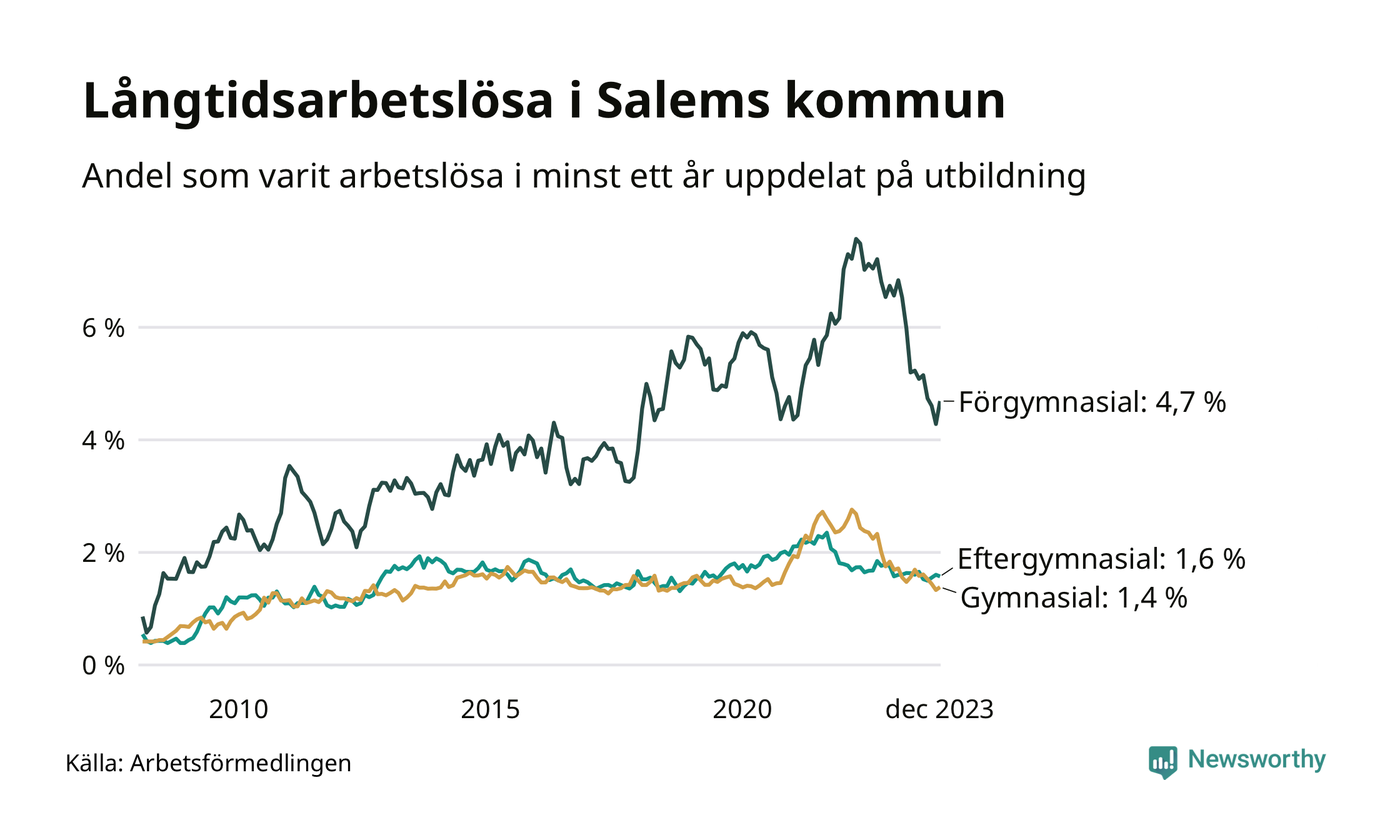 Graf över andel långtidsarbetslösa i Salem uppdelat på utbildningsnivå