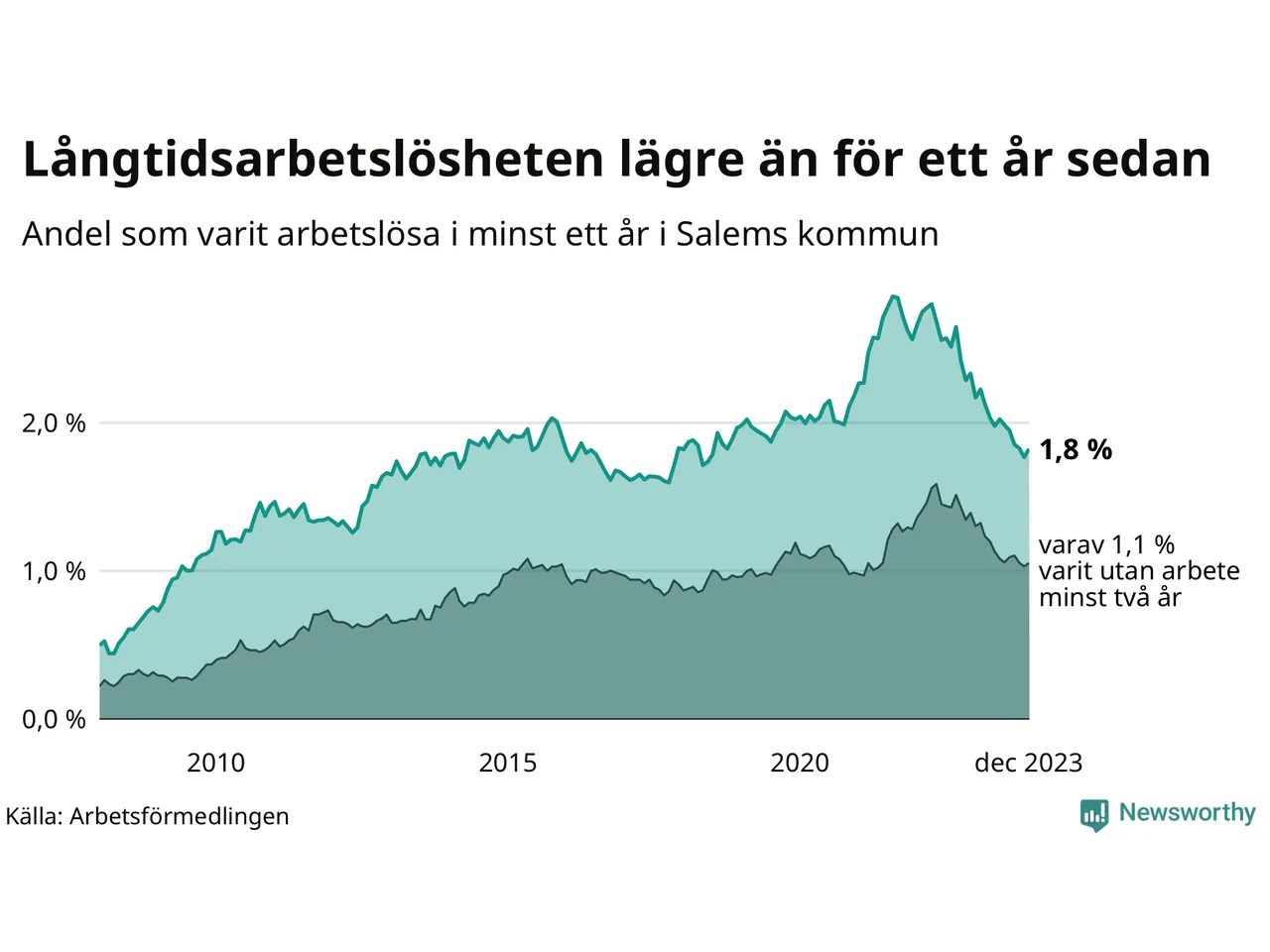 Totalt i riket hade drygt 139 000 personer varit utan arbete i minst ett år i december. Det motsvarar 2,7 procent av arbetskraften, vilket är en minskning med 0,2 procentenheter jämfört med ett år sedan.