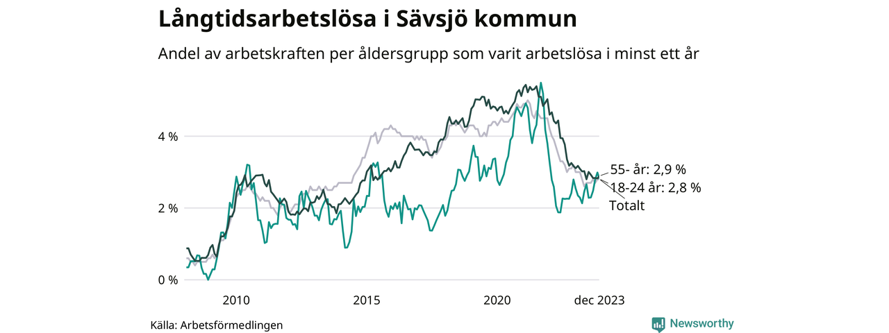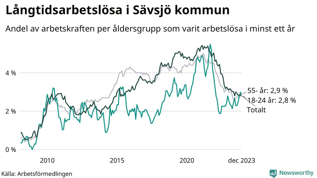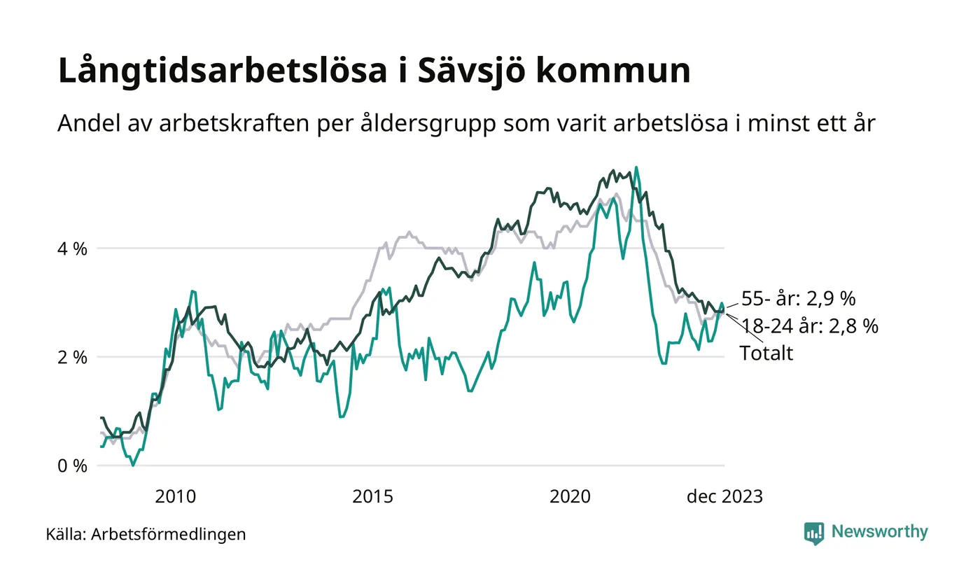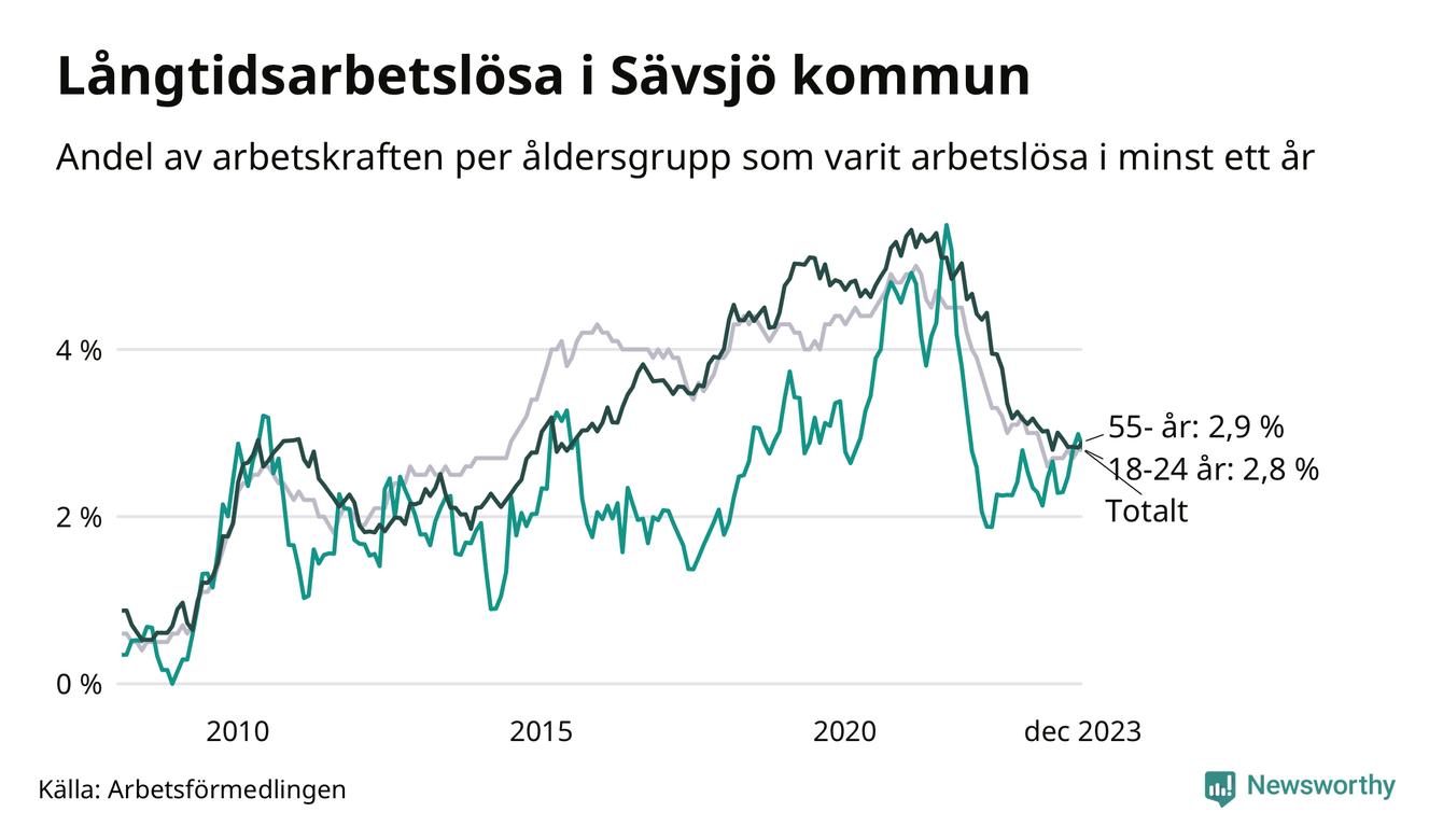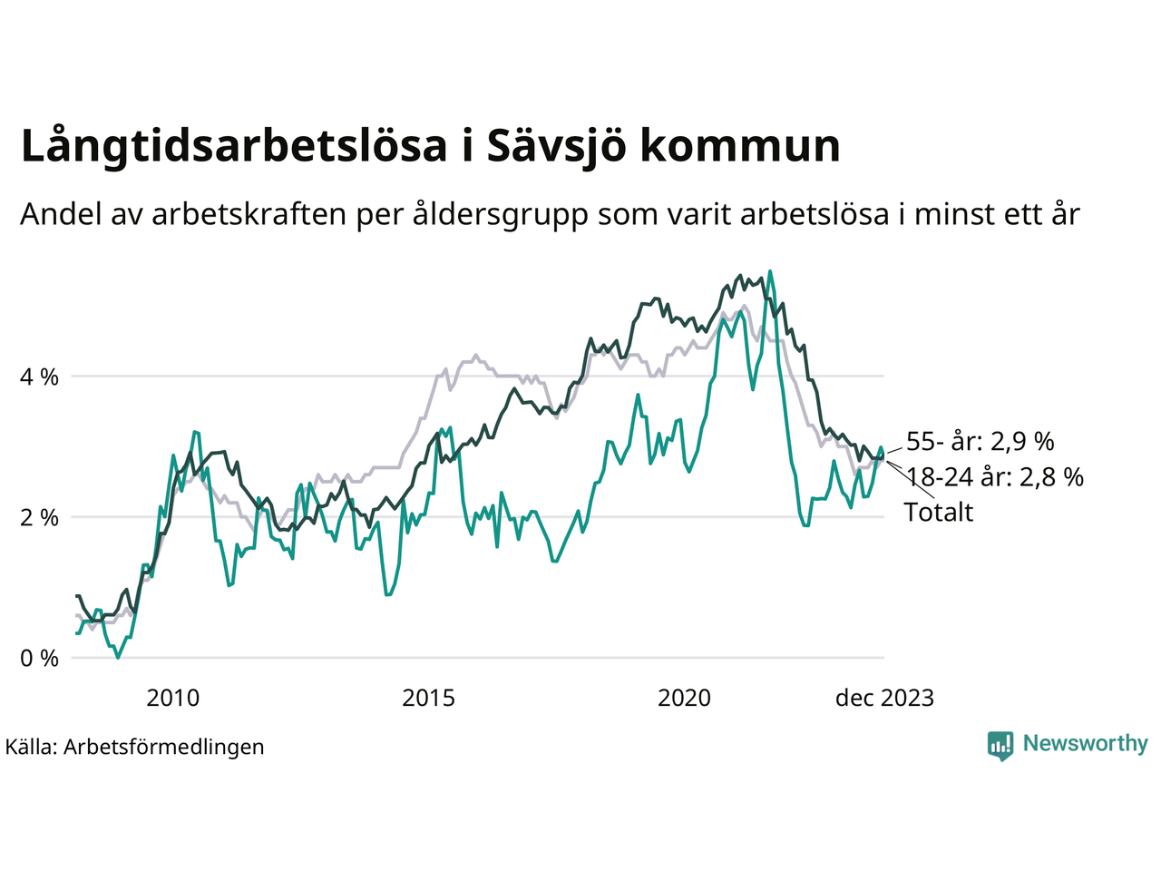 Av de 158 personerna som varit arbetslösa i mer än ett år i Sävsjö kommun är 38 personer mellan 55 och 651 år och 16 är mellan 18 och 24 år. För den äldre gruppen är andelen arbetslösa 2,9 procent medan den i den yngre gruppen är 2,8 procent. Även i riket som helhet är långtidsarbetslösheten högre i gruppen äldre.
