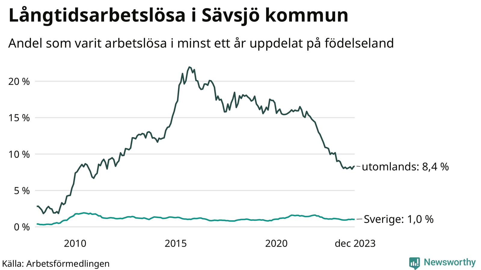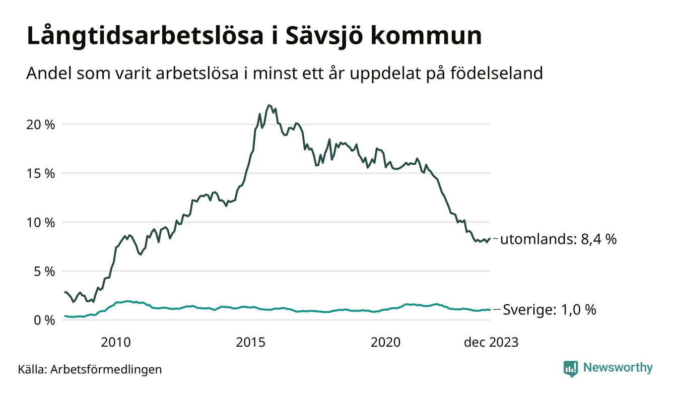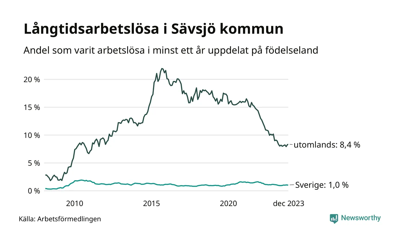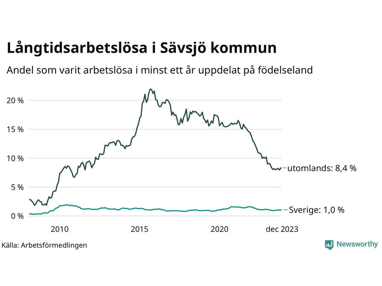 44 av de långtidsarbetslösa i Sävsjö är födda i Sverige, medan 114 är födda utomlands. Det innebär att långtidsarbetslösheten bland Sverigefödda är 1,0 procent, medan den är åtta gånger så hög – 8,4 procent – bland födda utomlands. Även i riket som helhet är arbetslösheten högre bland utrikesfödda.