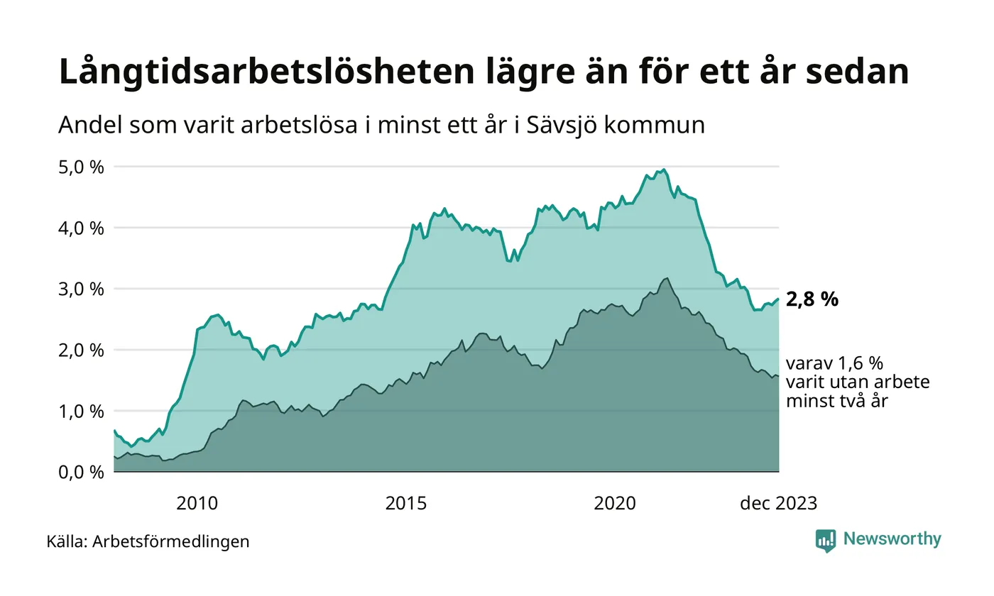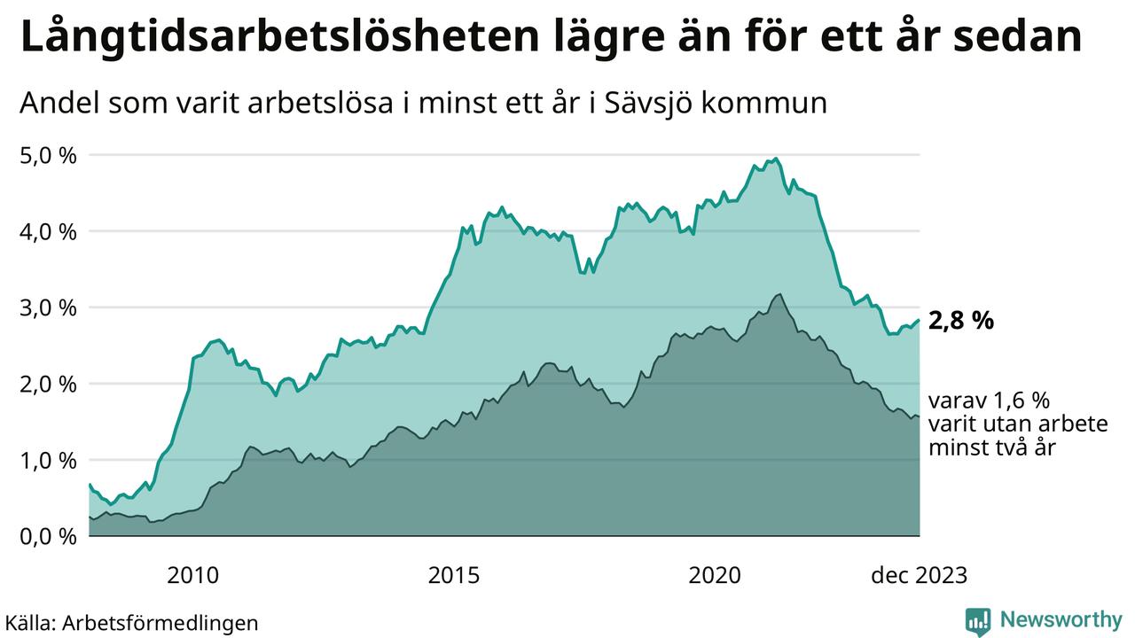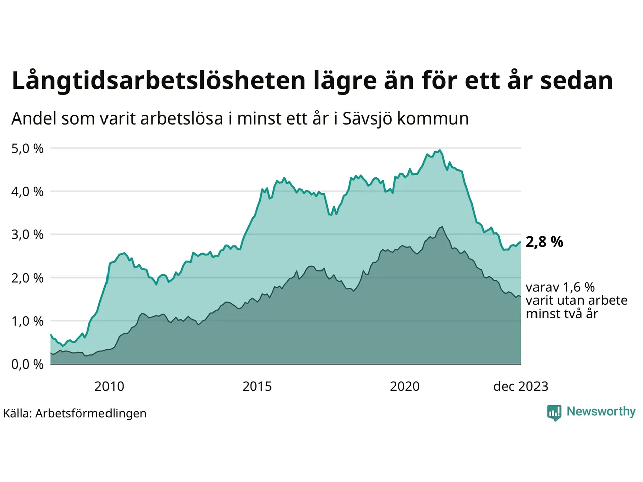 Andelen långtidsarbetslösa i Sävsjö är den näst högsta i Jönköpings län, bara i Nässjö är andelen högre 3,3 procent.I Habo finns länets lägsta långtidsarbetslöshet, 1,1 procent. I Jönköpings län som helhet hade 3 816 personer (2,1 procent) varit arbetslösa i minst ett år i december. Det är 108 personer fler än månaden innan.