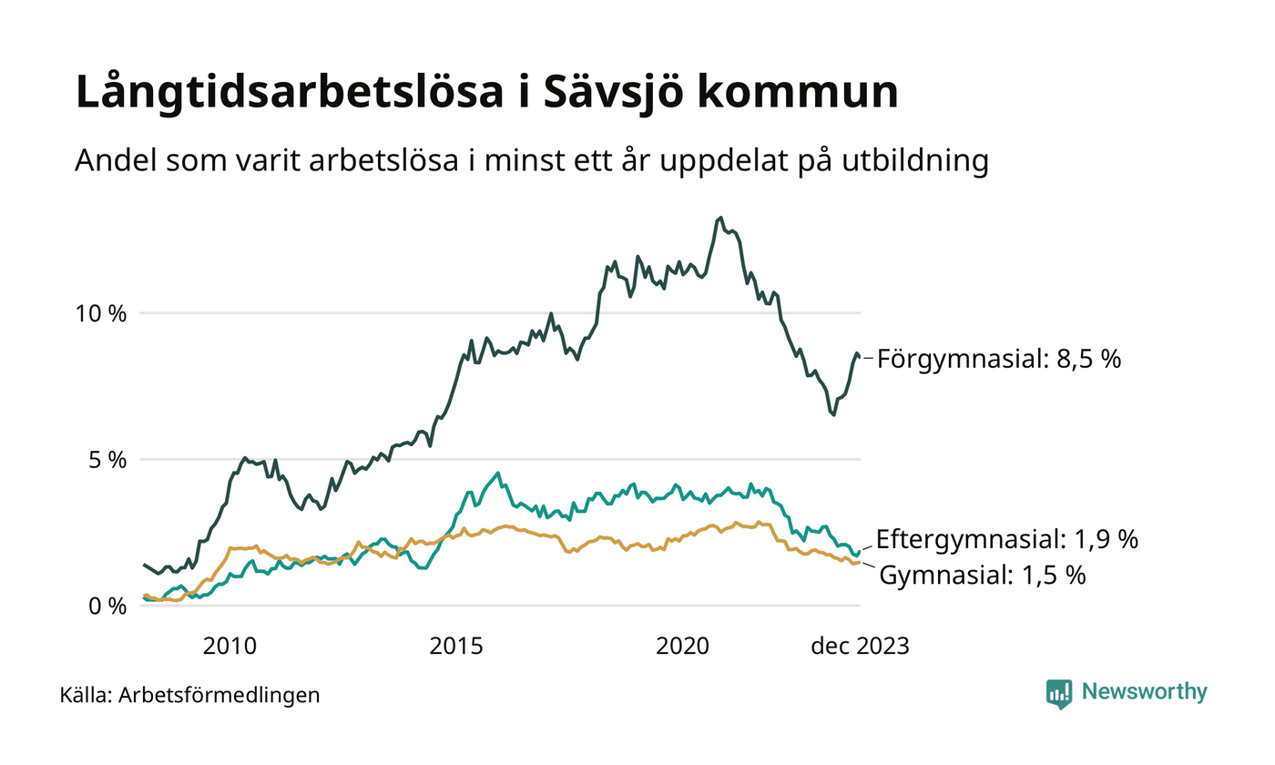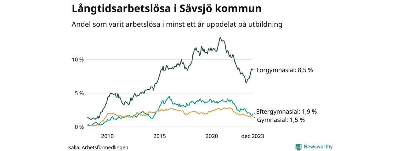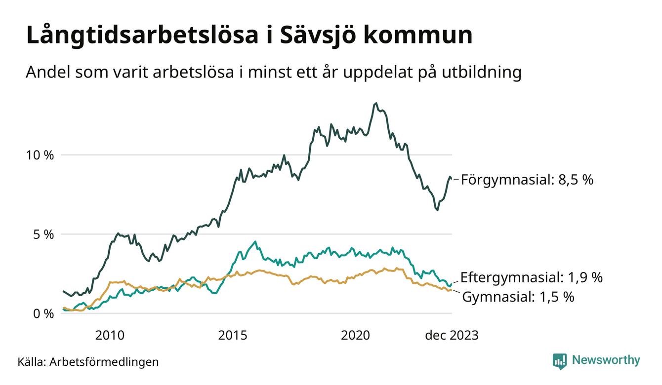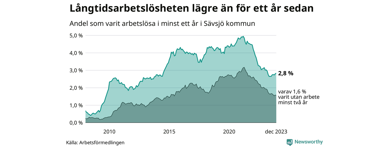 Andelen långtidsarbetslösa i Sävsjö är den näst högsta i Jönköpings län, bara i Nässjö är andelen högre 3,3 procent.I Habo finns länets lägsta långtidsarbetslöshet, 1,1 procent. I Jönköpings län som helhet hade 3 816 personer (2,1 procent) varit arbetslösa i minst ett år i december. Det är 108 personer fler än månaden innan.