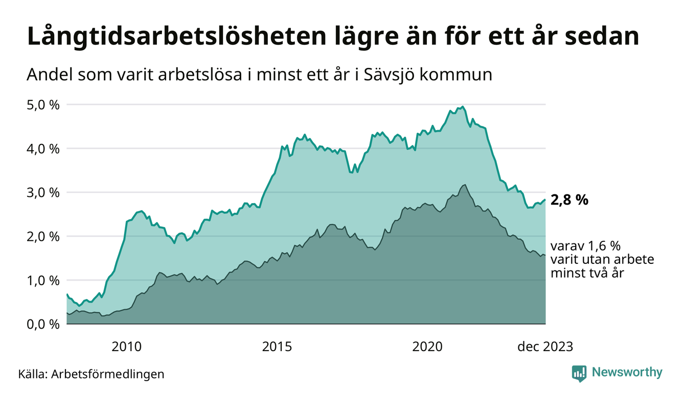 I december hade 158 Sävsjöbor varit arbetslösa i minst ett år, vilket är tre fler än månaden innan. 158 personer motsvarar 2,8 procent av arbetskraften i kommunen – andelen långtidsarbetslösa är 0,4 procentenheter lägre än samma månad för ett år sedan.