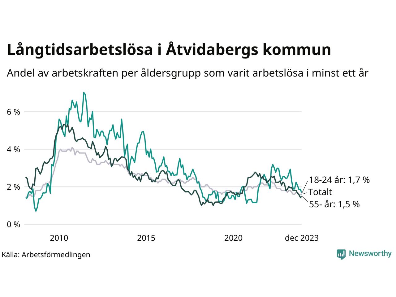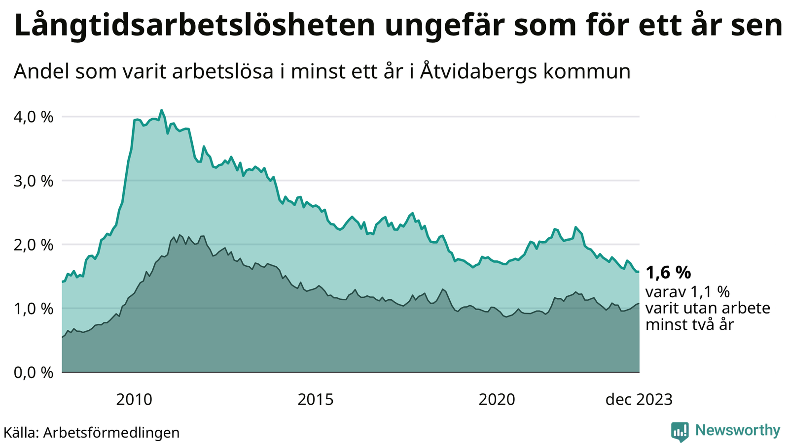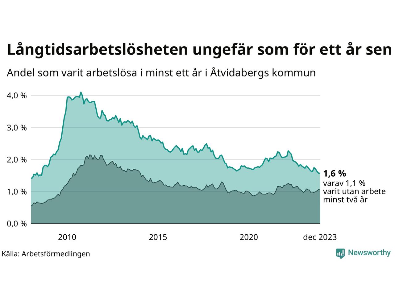 | Andel arbetslösa i minst två år | 1,1 % | 1,8 % | 1,5 % |