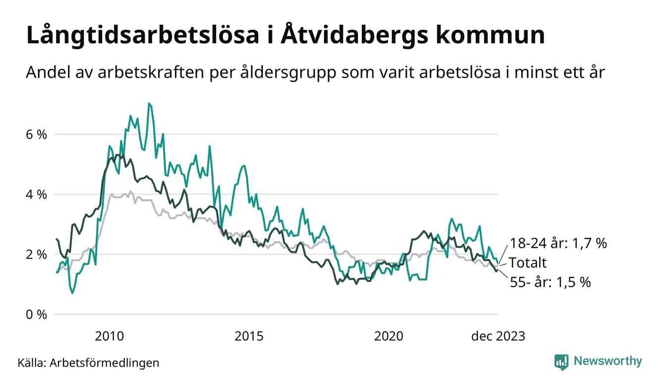 Antalet som står allra längst från arbetsmarknaden – som varit utan arbete utan i minst två år – har minskat jämfört med samma månad för ett år sedan: från 64 till 59, eller 1,1 procent av arbetskraften i december 2023.