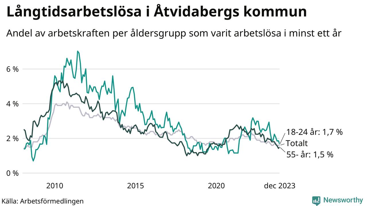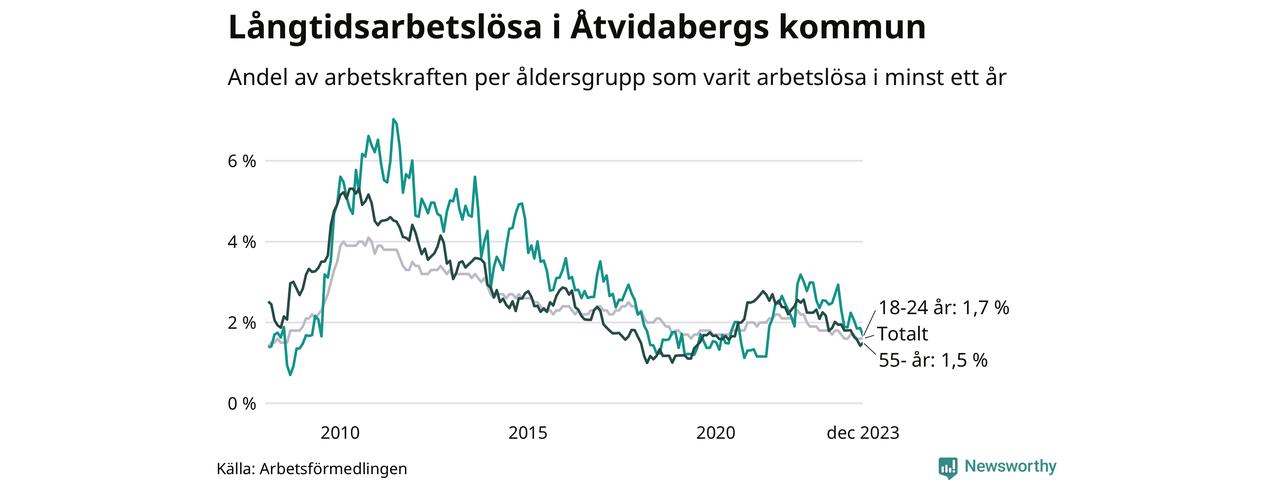 Av de 86 personerna som varit arbetslösa i mer än ett år i Åtvidabergs kommun är 20 personer mellan 55 och 651 år och åtta är mellan 18 och 24 år.