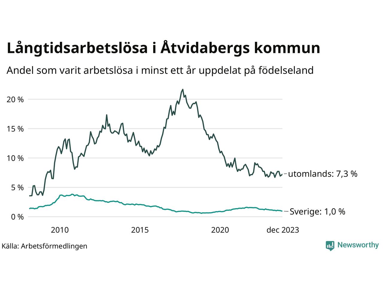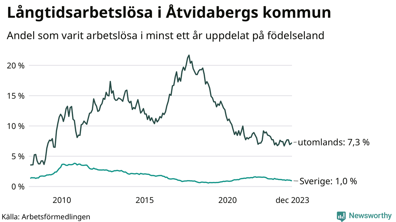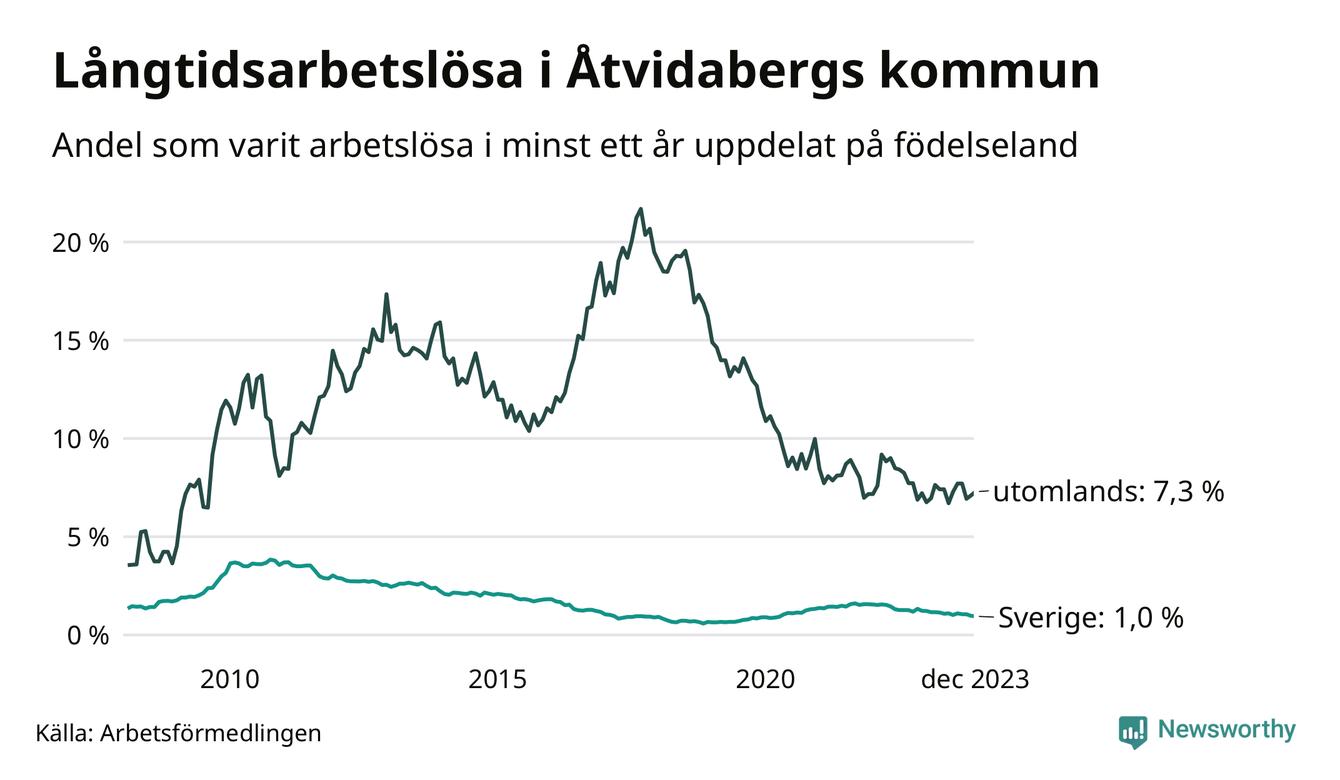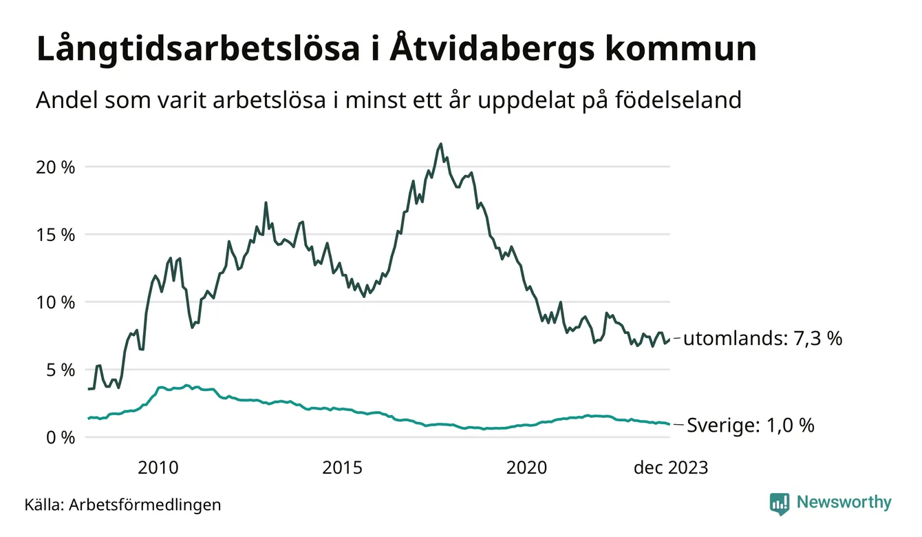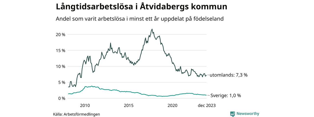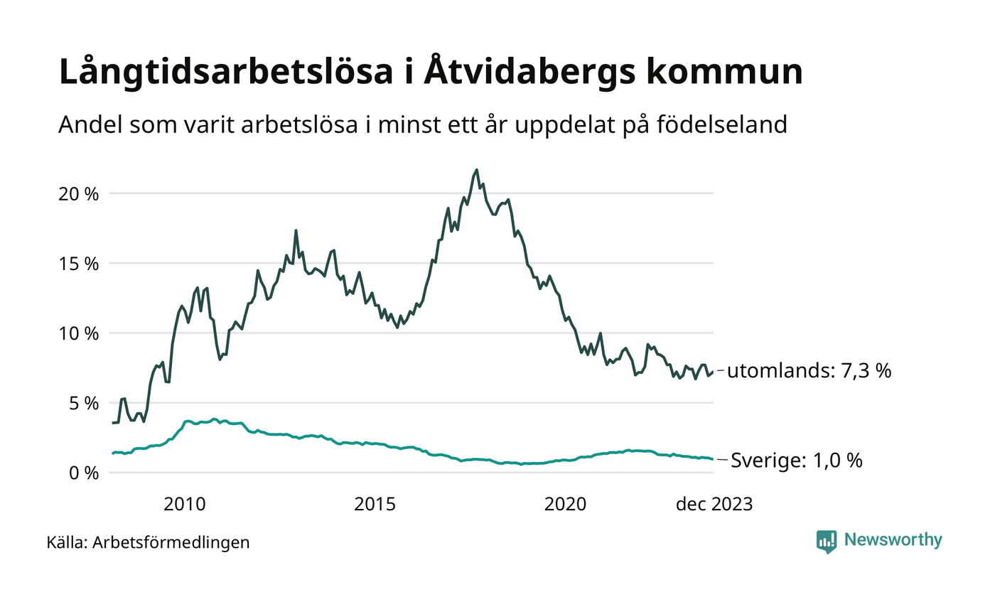 47 av de långtidsarbetslösa i Åtvidaberg är födda i Sverige, medan 39 är födda utomlands. Det innebär att långtidsarbetslösheten bland Sverigefödda är 1,0 procent, medan den är sju gånger så hög – 7,3 procent – bland födda utomlands. Även i riket som helhet är arbetslösheten högre bland utrikesfödda.
