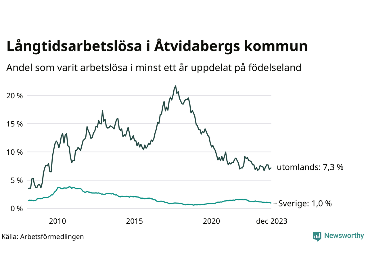Totalt i riket hade drygt 139 000 personer varit utan arbete i minst ett år i december. Det motsvarar 2,7 procent av arbetskraften, vilket är en minskning med 0,2 procentenheter jämfört med ett år sedan.