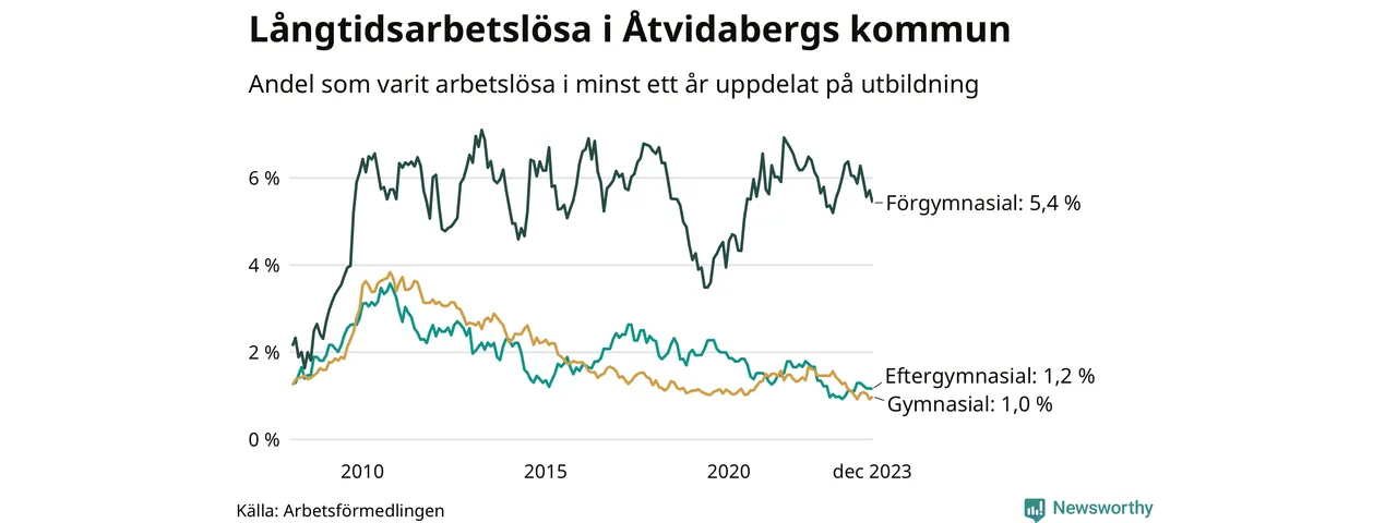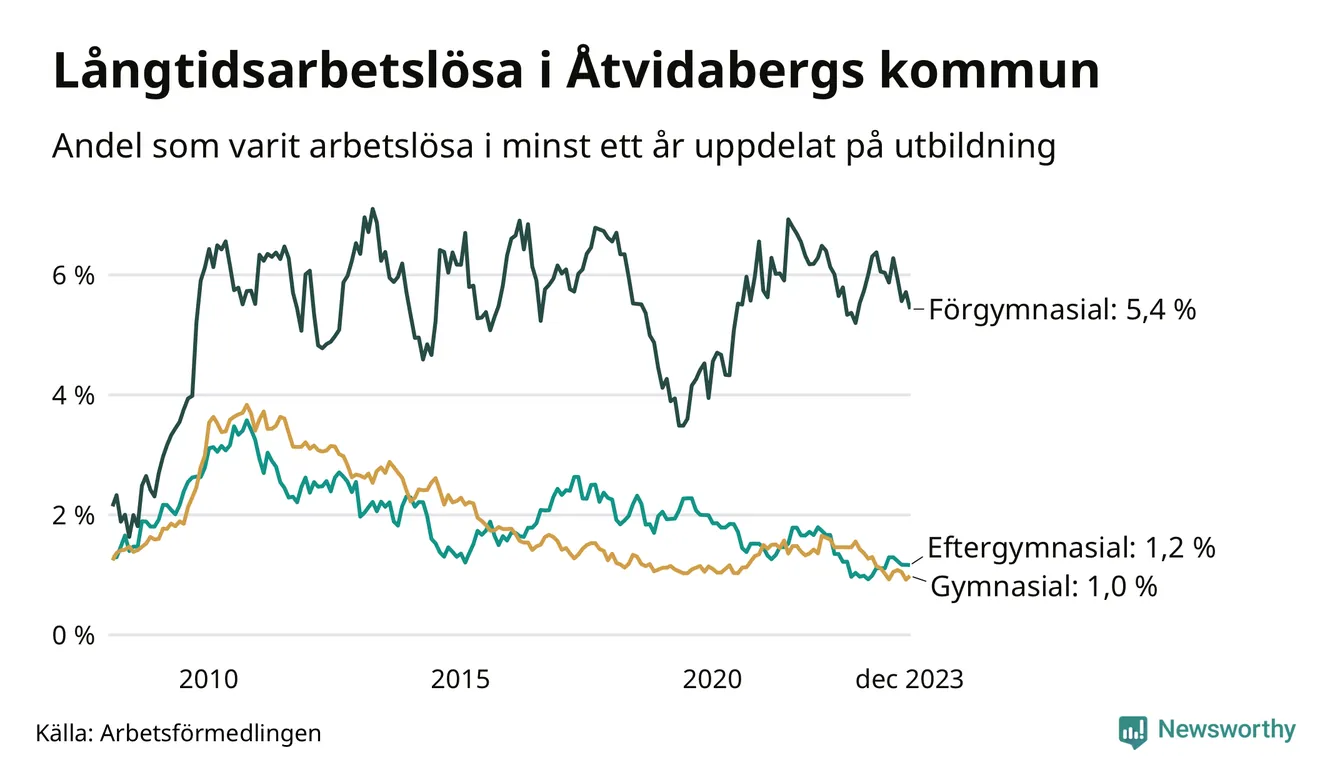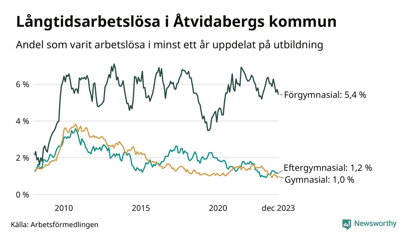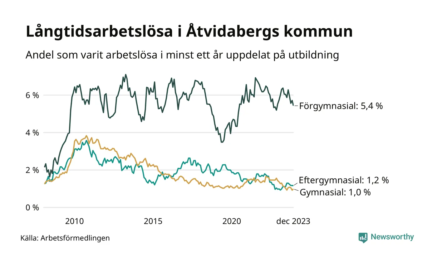 Även när det gäller utbildningsnivå är skillnaderna stora. 36 av de som varit arbetslösa i minst ett år har inte någon gymnasieutbildning, vilket motsvarar en långtidsarbetslöhet på 5,4 procent i den gruppen. Det kan jämföras med 1,0 procent bland dem som gått ut gymnasiet och 1,2 procent bland dem som studerat vidare efter gymnasiet.