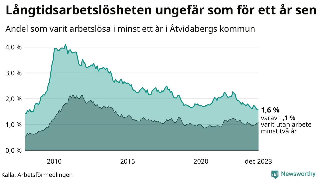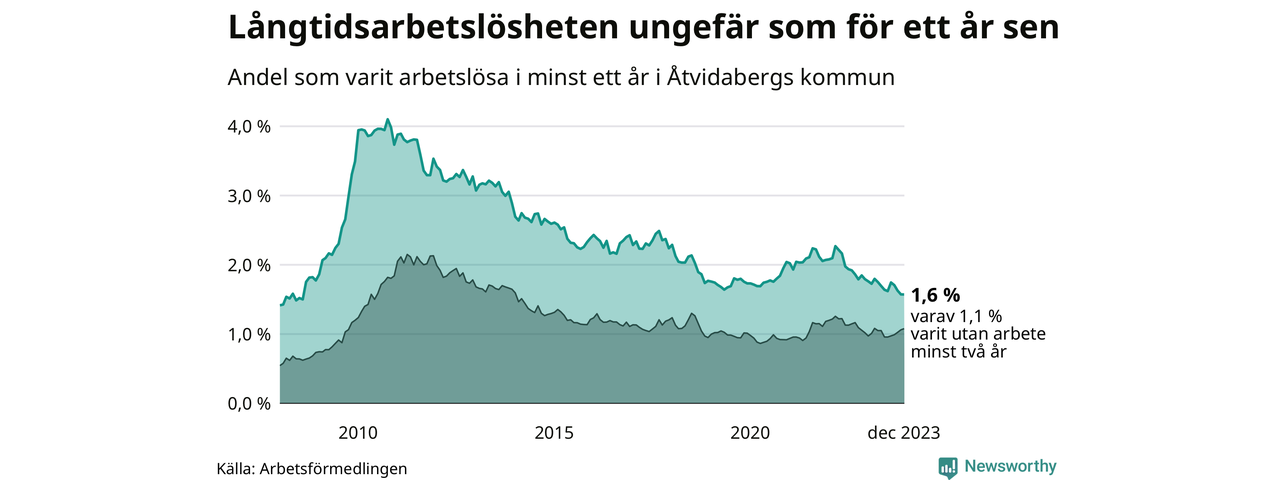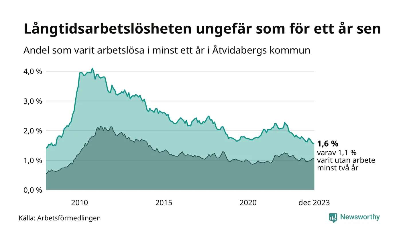 I december hade 86 Åtvidabergsbor varit arbetslösa i minst ett år, vilket är lika många som månaden innan. Det är den fjärde månaden i rad med minskande eller oförändrat antal långtidsarbetslösa. 86 personer motsvarar 1,6 procent av arbetskraften i kommunen – andelen långtidsarbetslösa är ungefär på samma nivå som för ett år sedan.