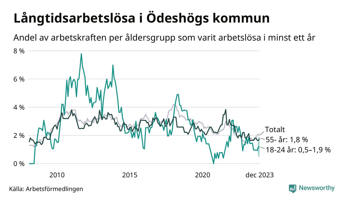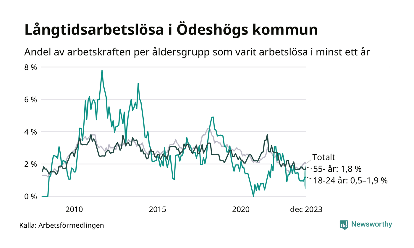Av de 49 personerna som varit arbetslösa i mer än ett år i Ödeshögs kommun är elva personer mellan 55 och 651 år och mellan en och fyra är mellan 18 och 24 år. Som andel av arbetskraften innebär det att långtidsarbetslöheten är lägre i de båda grupperna än i arbetskraften totalt. I riket som helhet är andelen långtidsarbetslösa högre i den äldre gruppen.