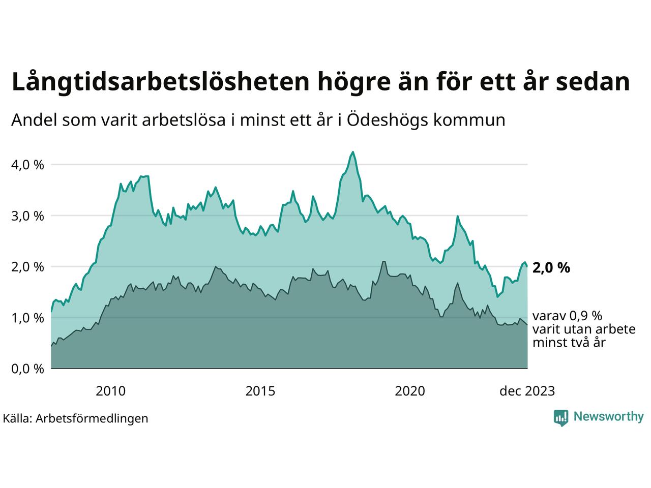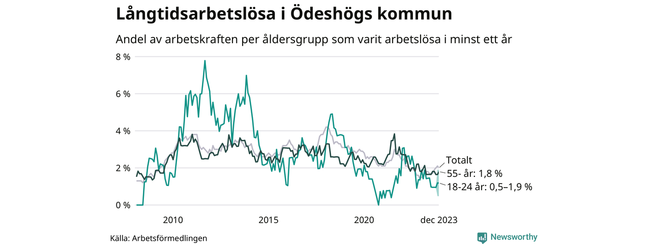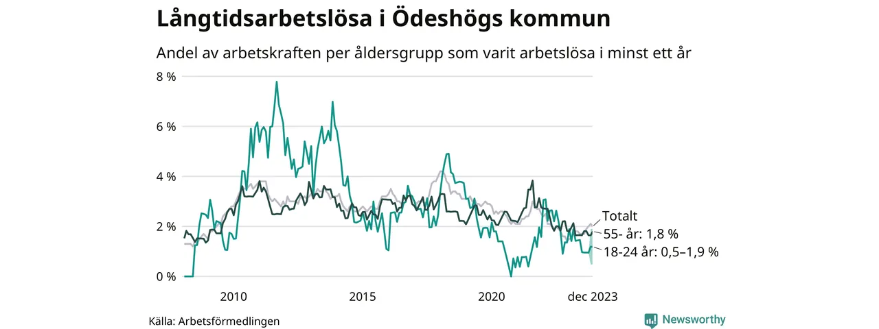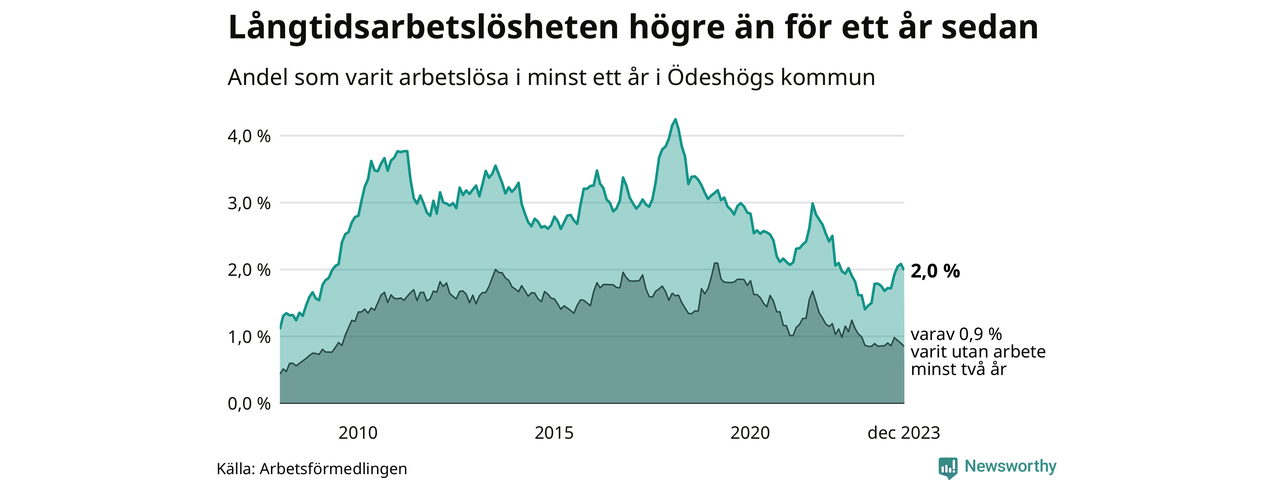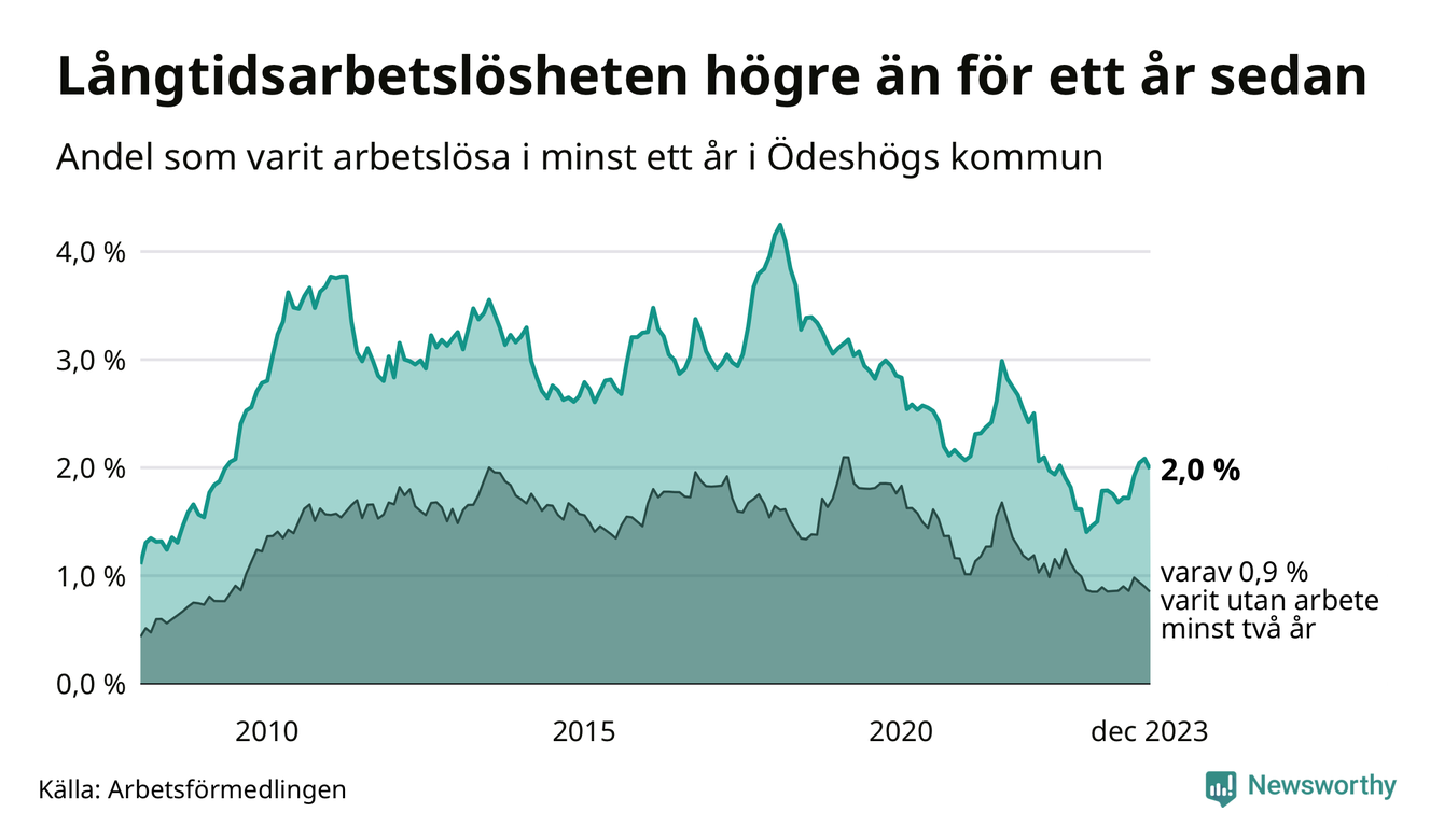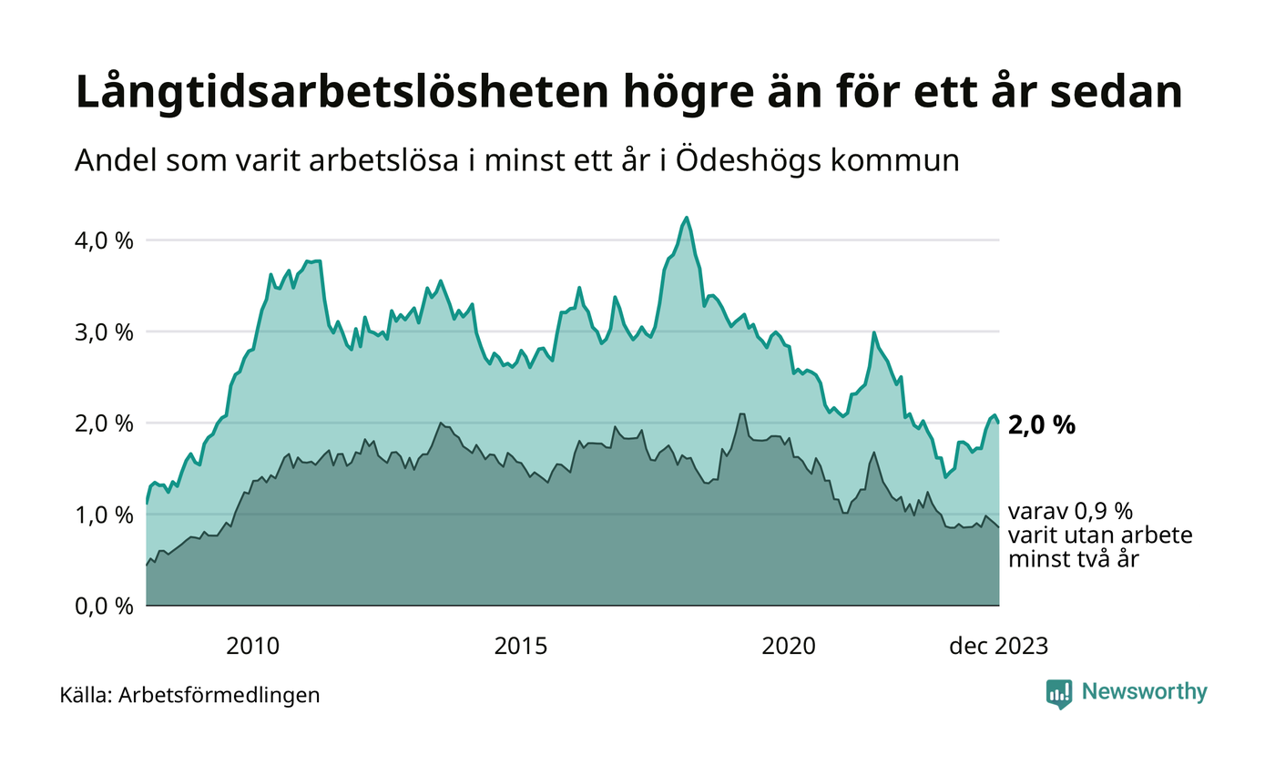 I december hade 49 Ödeshögsbor varit arbetslösa i minst ett år, vilket är två färre än månaden innan. Det är den första månaden sedan juni 2023 som antalet arbetslösa minskar. 49 personer motsvarar 2,0 procent av arbetskraften i kommunen – andelen långtidsarbetslösa är 0,6 procentenheter högre än samma månad för ett år sedan.