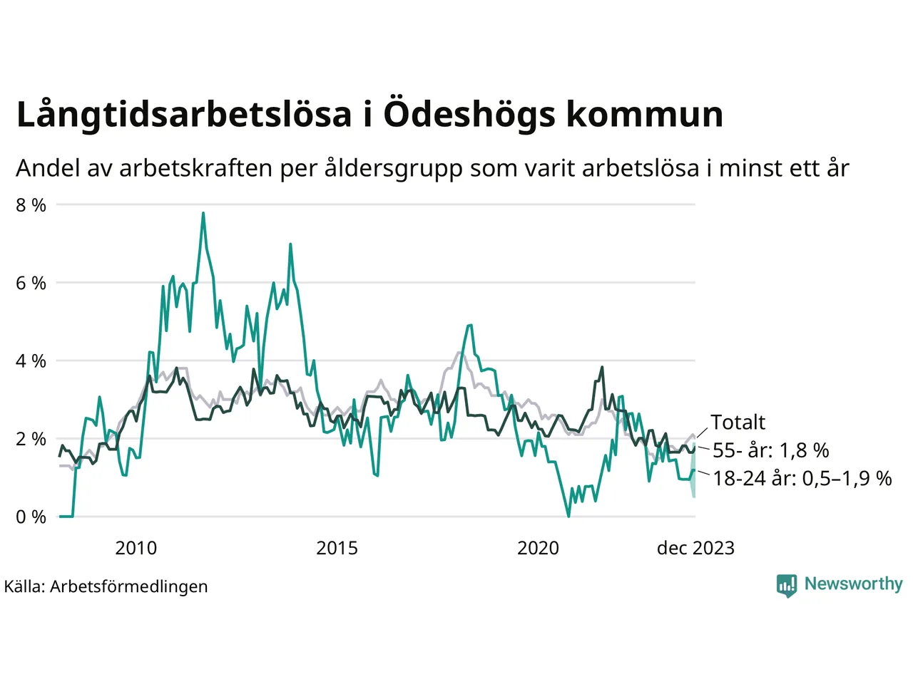 Graf: Andel arbetslösa uppdelat i åldersgrupper i Ödeshög