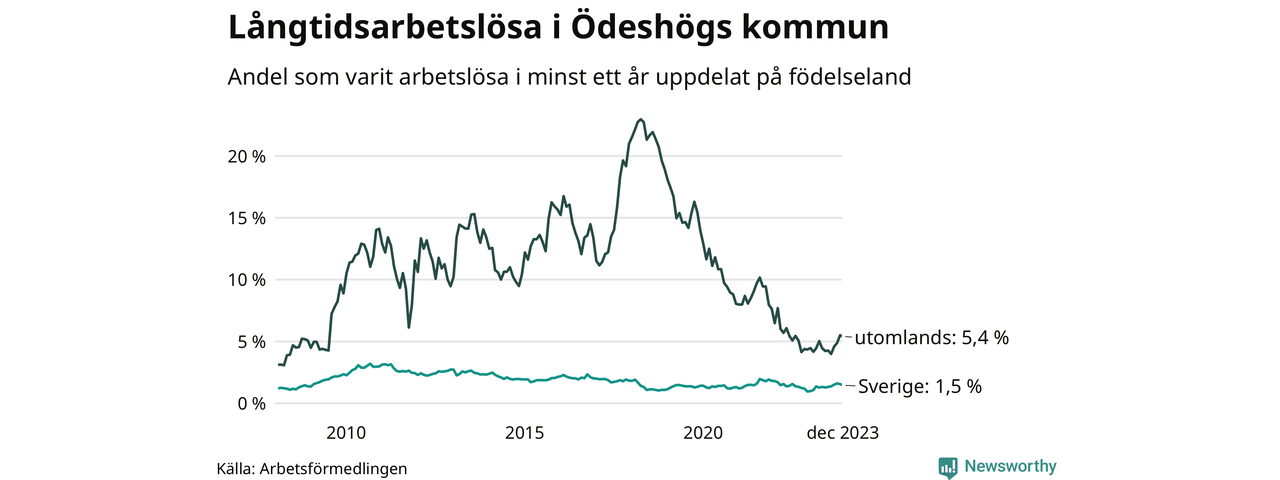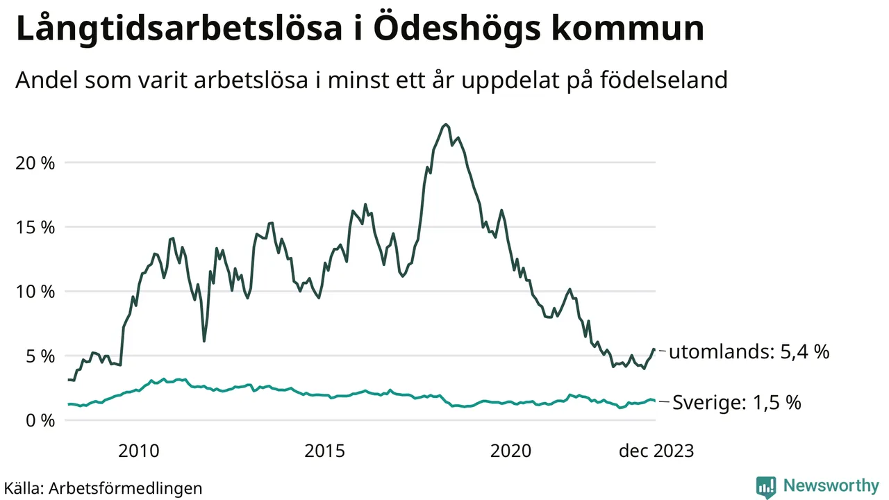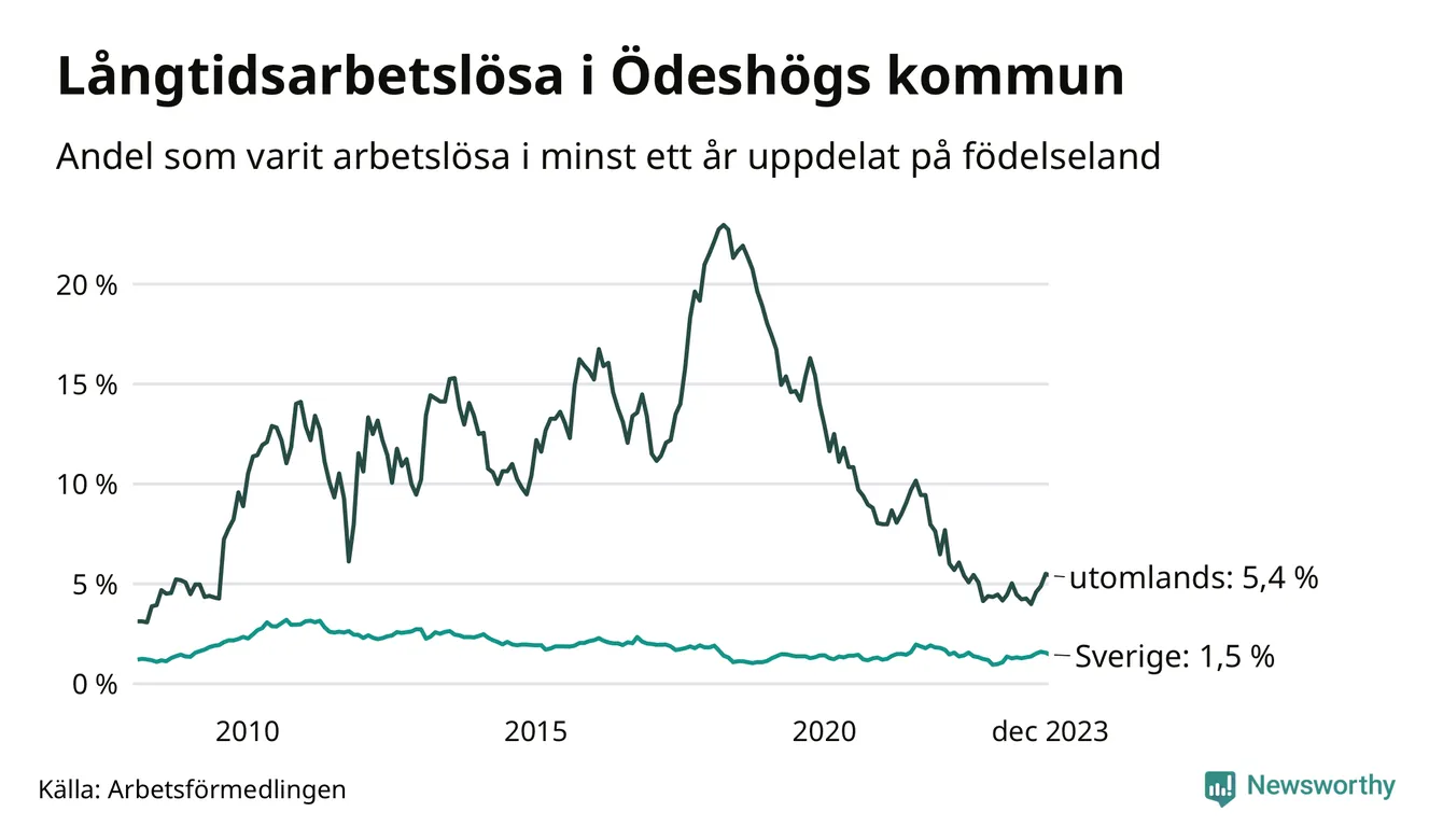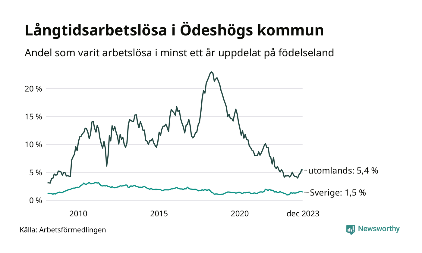 31 av de långtidsarbetslösa i Ödeshög är födda i Sverige, medan 18 är födda utomlands. Det innebär att långtidsarbetslösheten bland Sverigefödda är 1,5 procent, medan den är fyra gånger så hög – 5,4 procent – bland födda utomlands. Även i riket som helhet är arbetslösheten högre bland utrikesfödda.