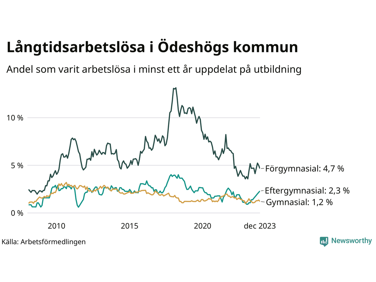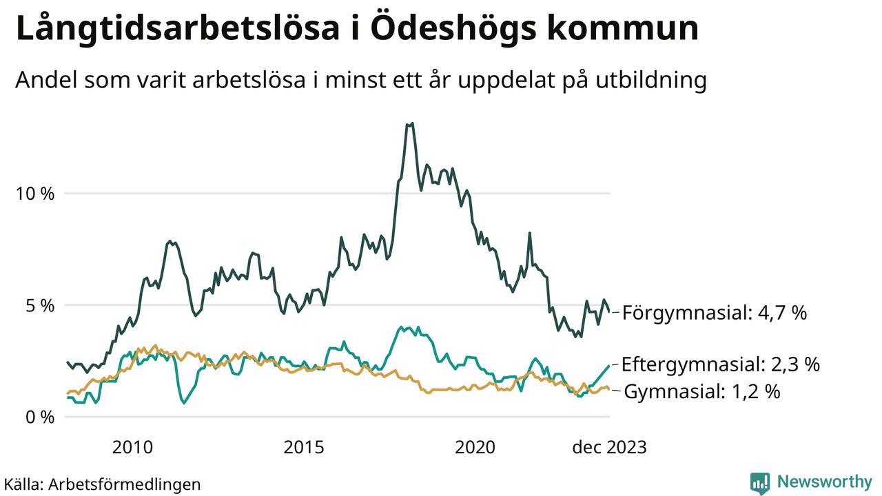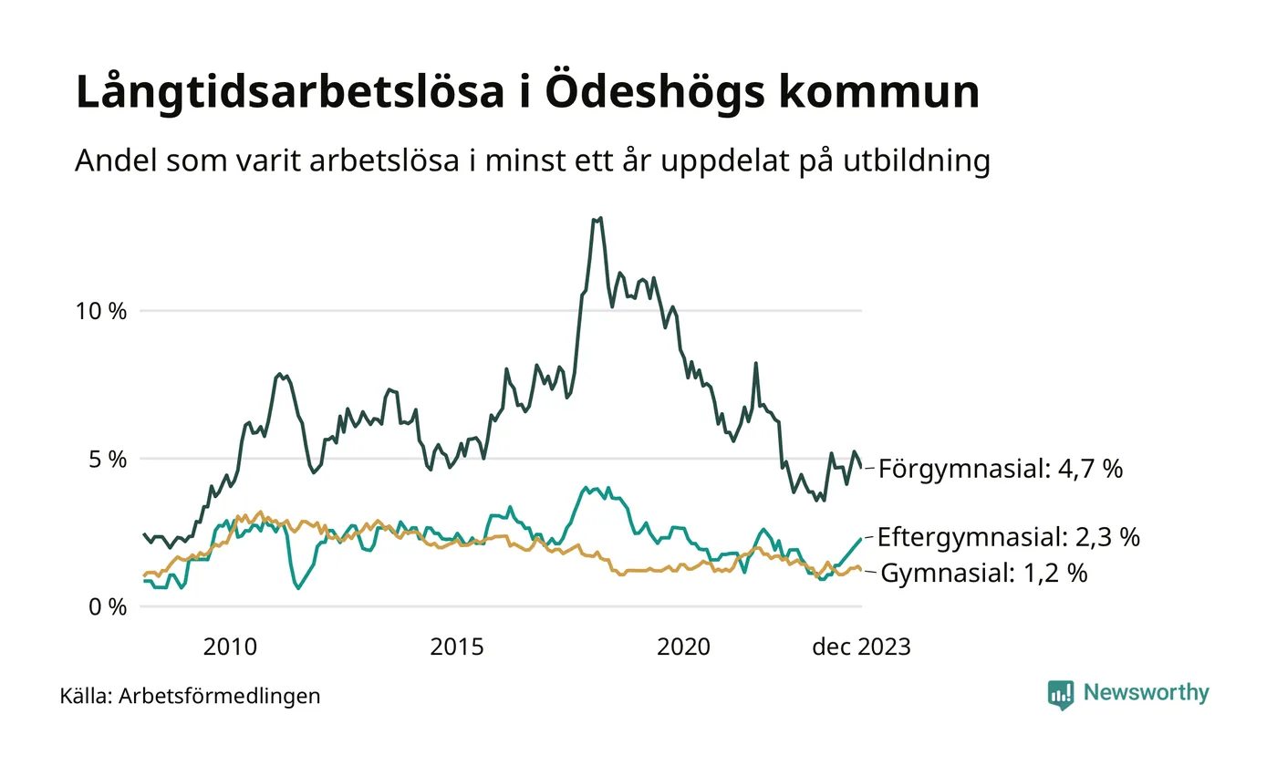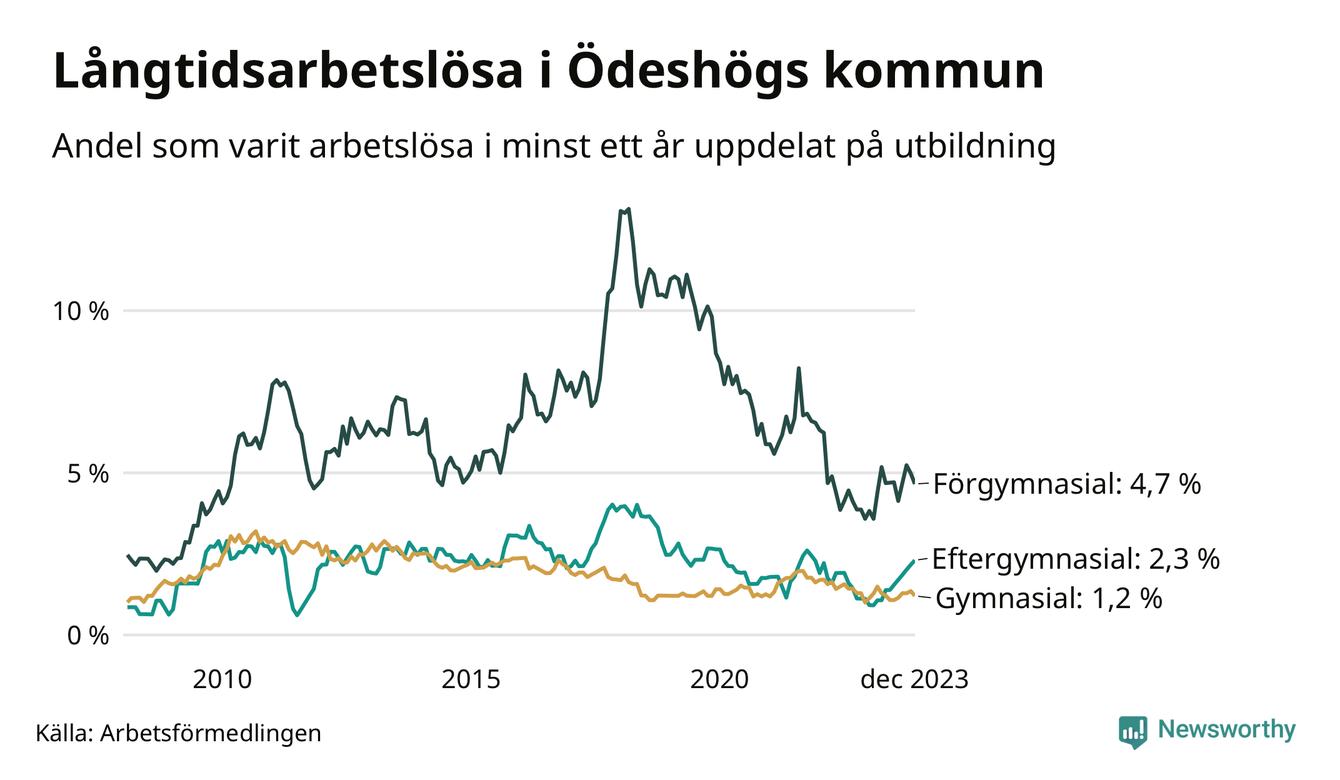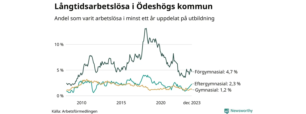 Graf: Andel arbetslösa i Ödeshög som varit utan arbete i minst 12 månader