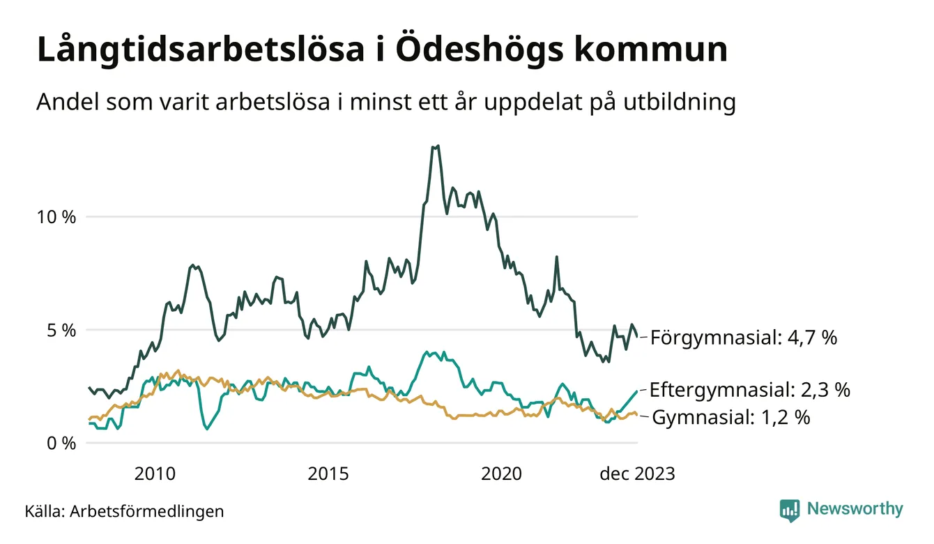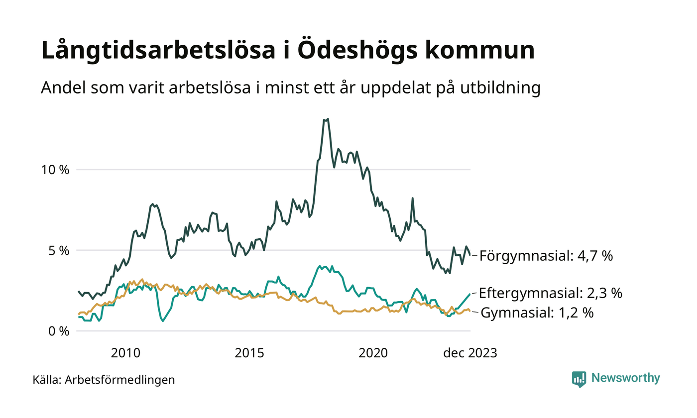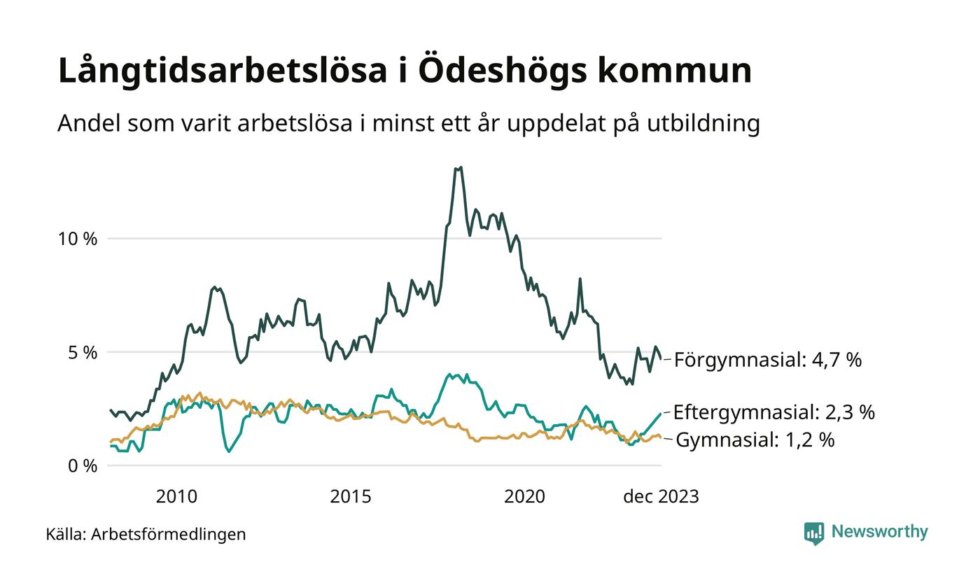 Graf över andel långtidsarbetslösa i Ödeshög uppdelat på utbildningsnivå