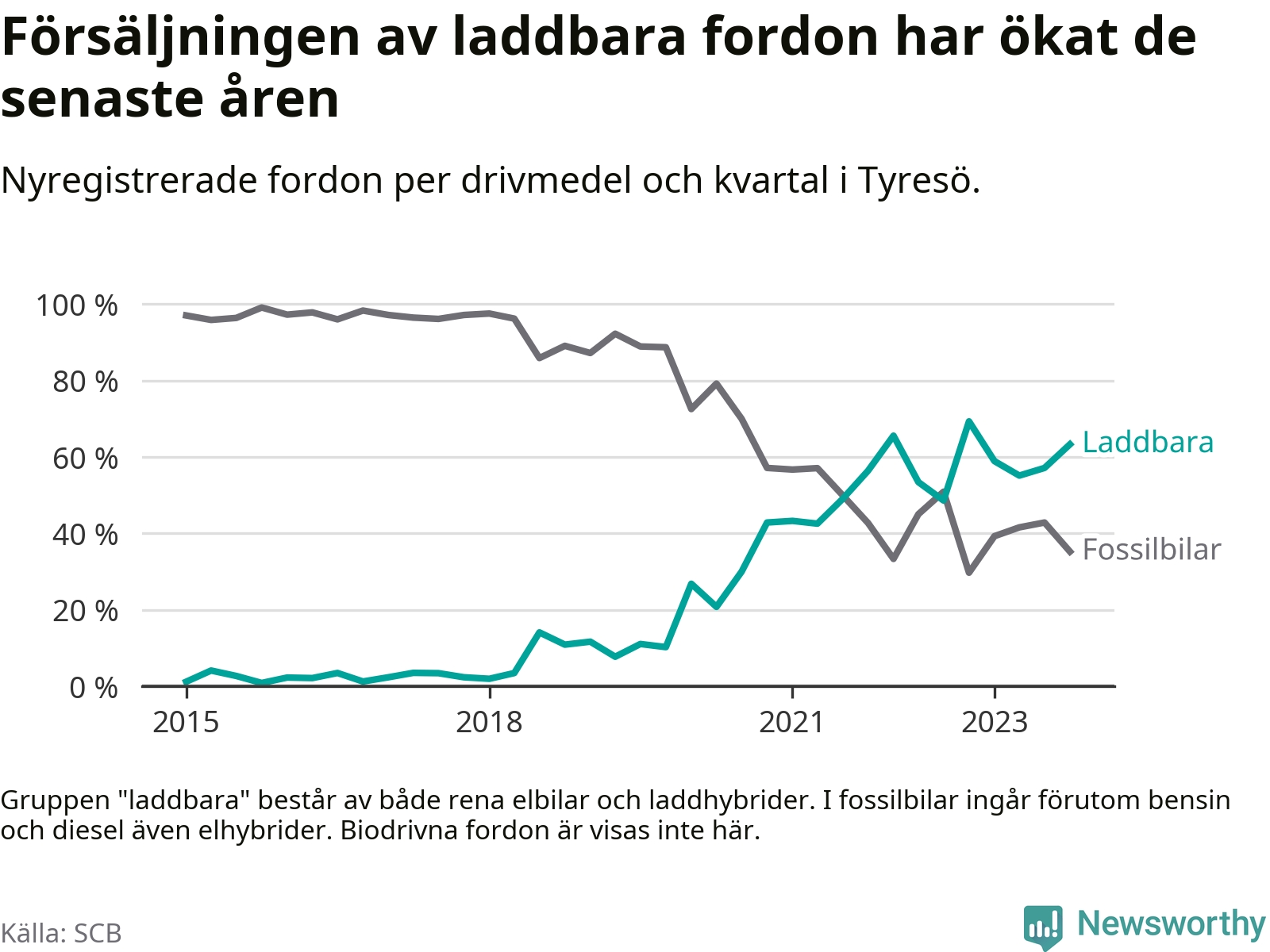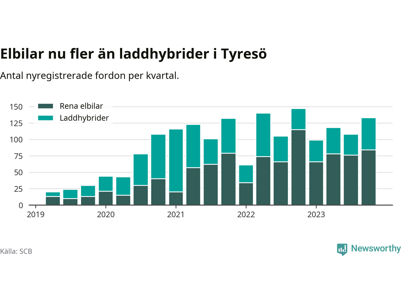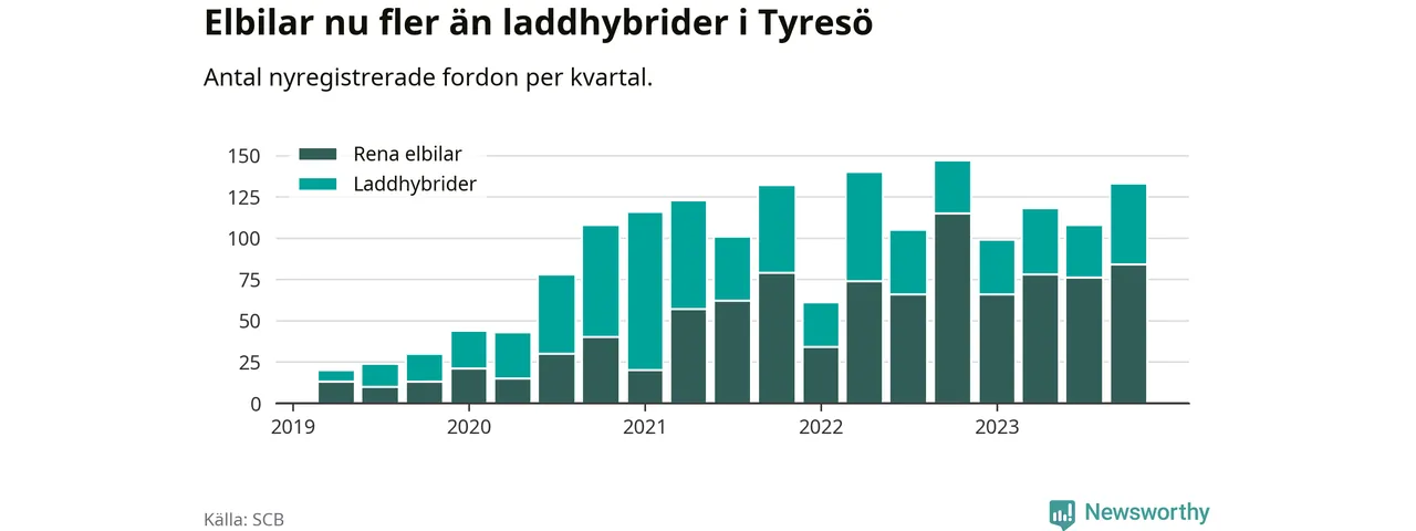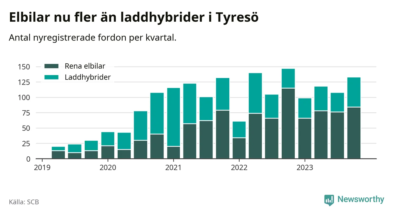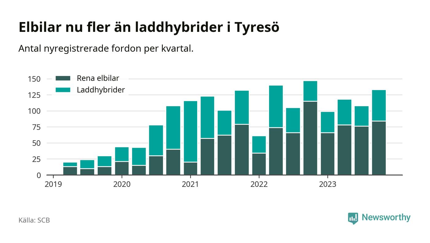 Under fjärde kvartalet 2023 var 63 procent av alla nyregistrerade personbilar i Tyresö laddbara (sammanlagt registrerades 210 nya bilar). Merparten av de laddbara bilarna var rena elbilar (40 procent av alla).