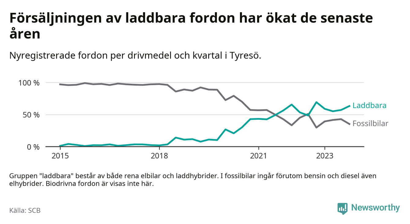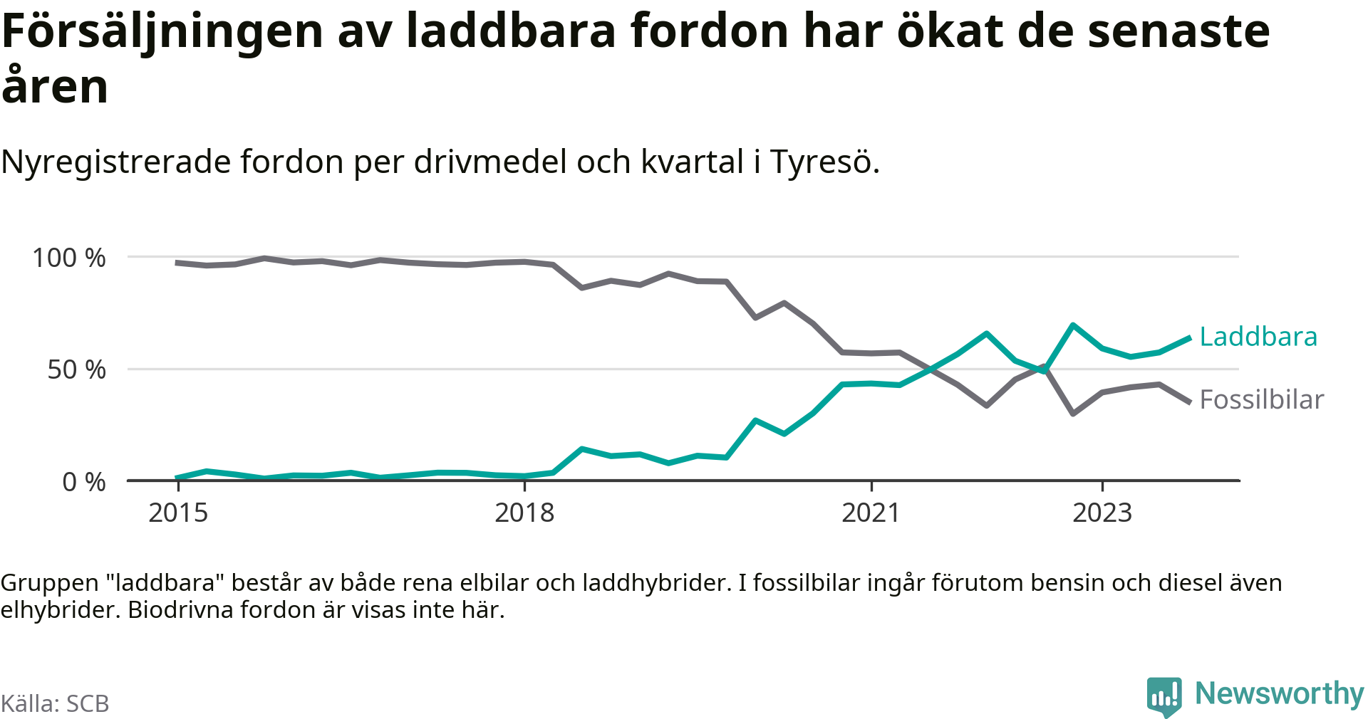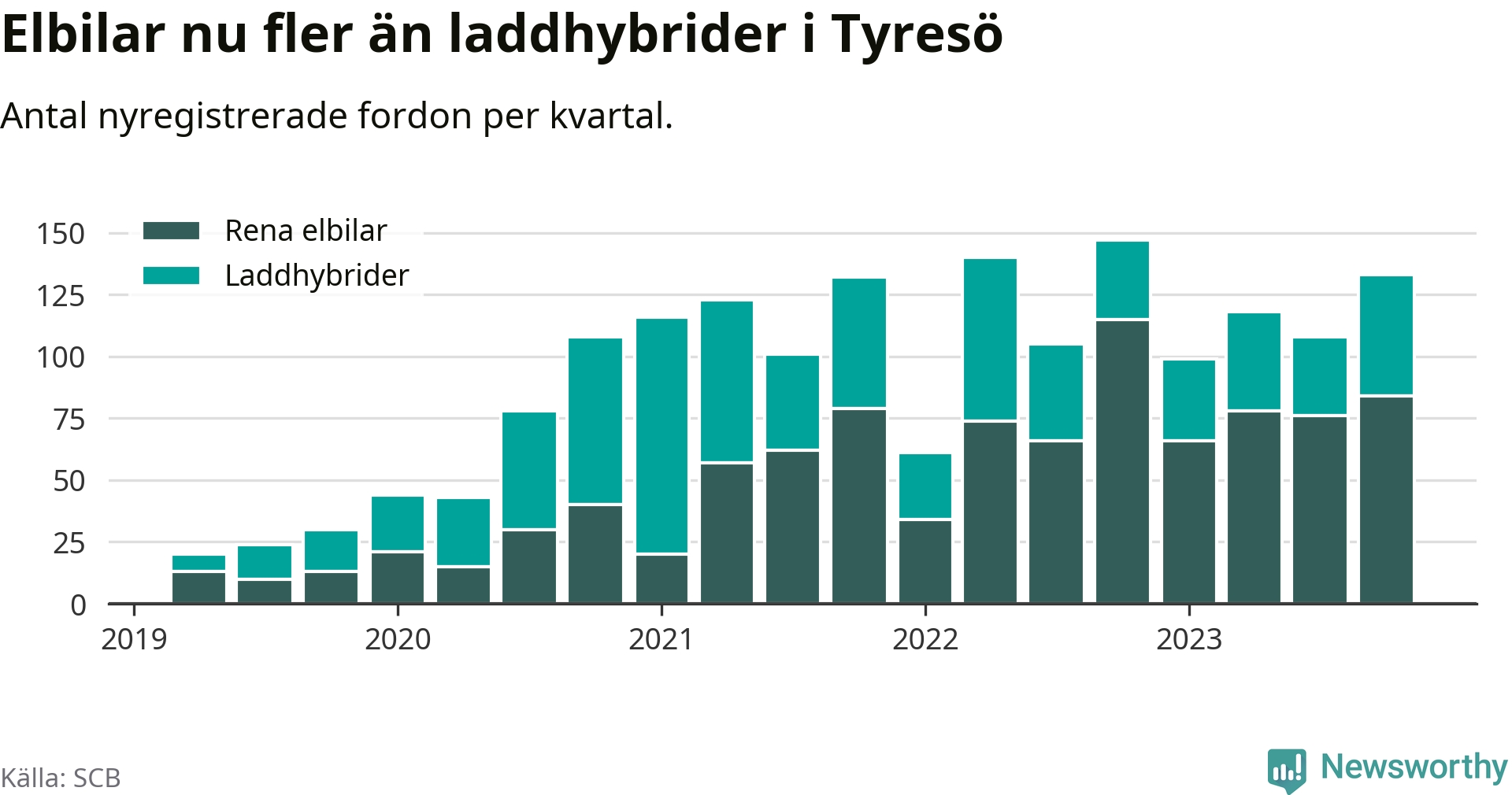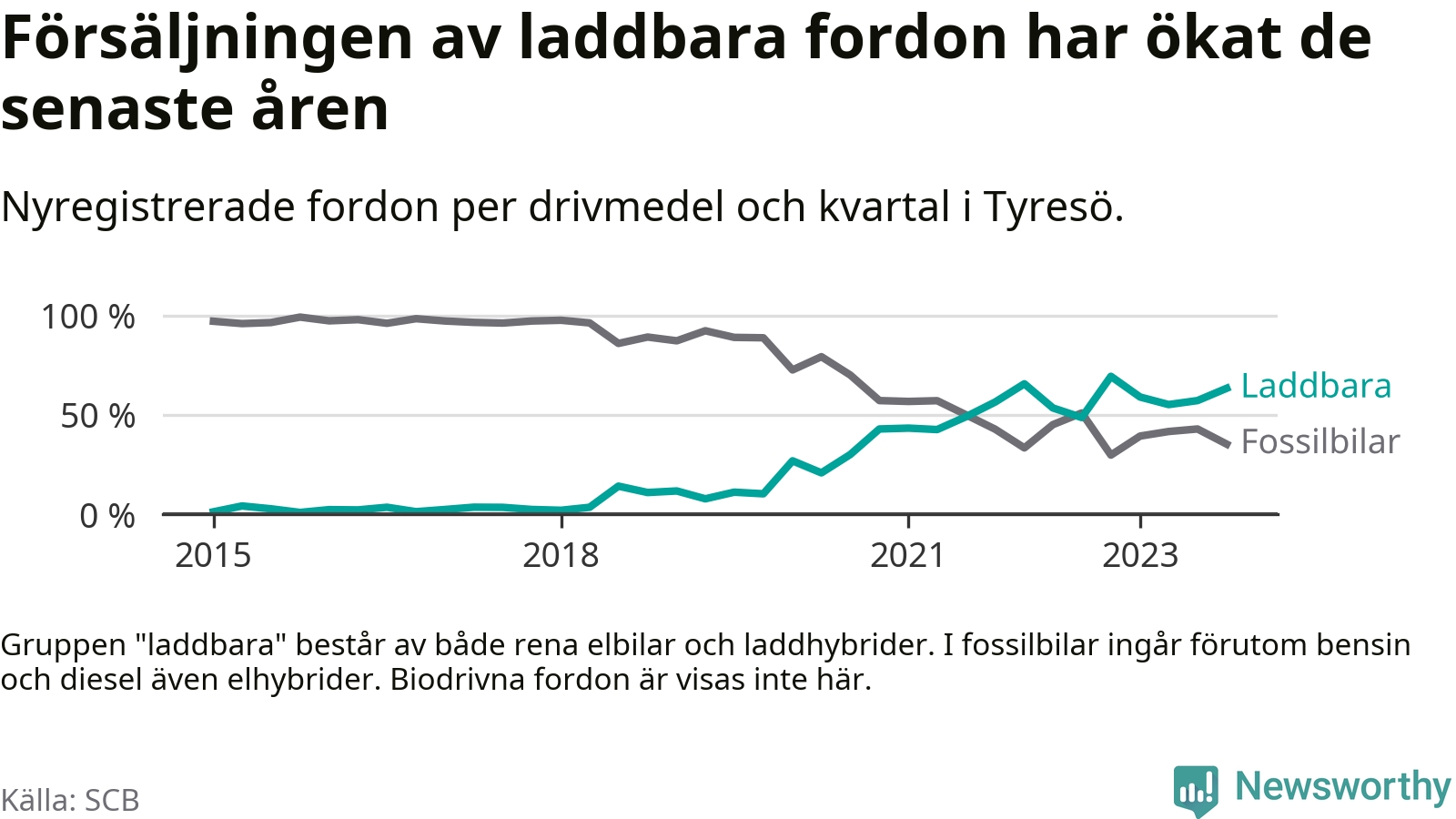 Under fjärde kvartalet 2023 var 63 procent av alla nyregistrerade personbilar i Tyresö laddbara (sammanlagt registrerades 210 nya bilar). Merparten av de laddbara bilarna var rena elbilar (40 procent av alla).