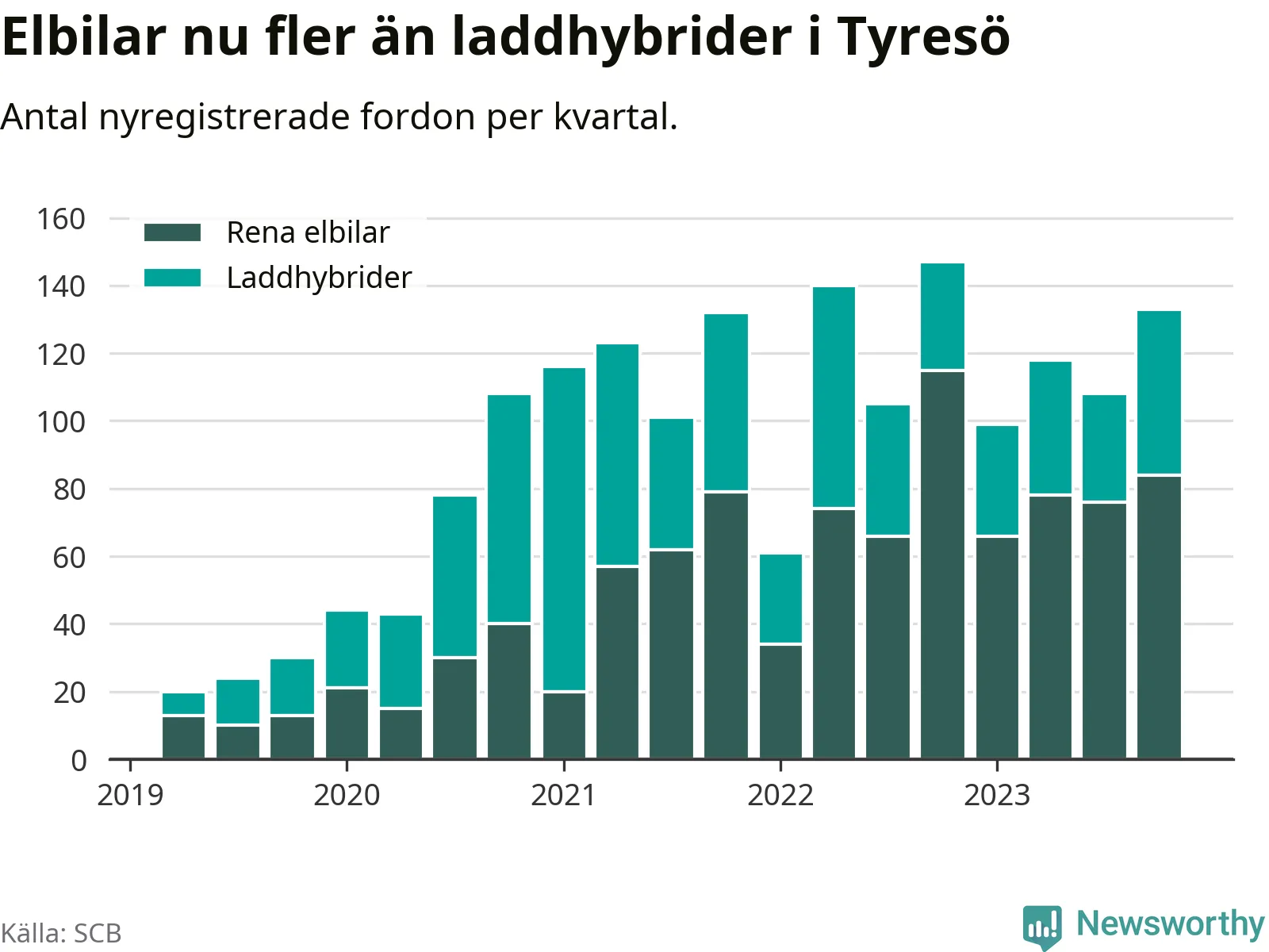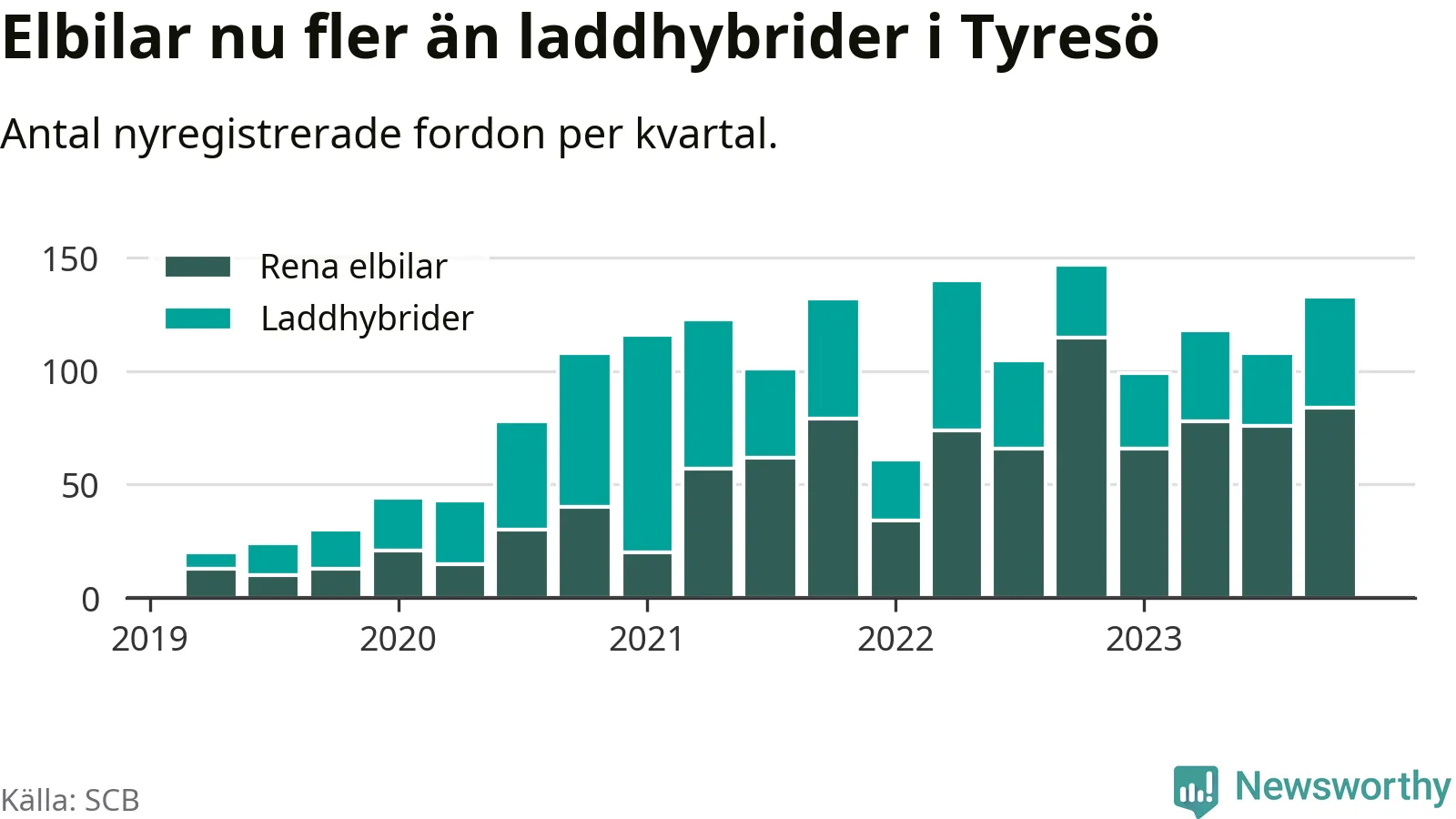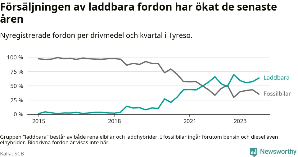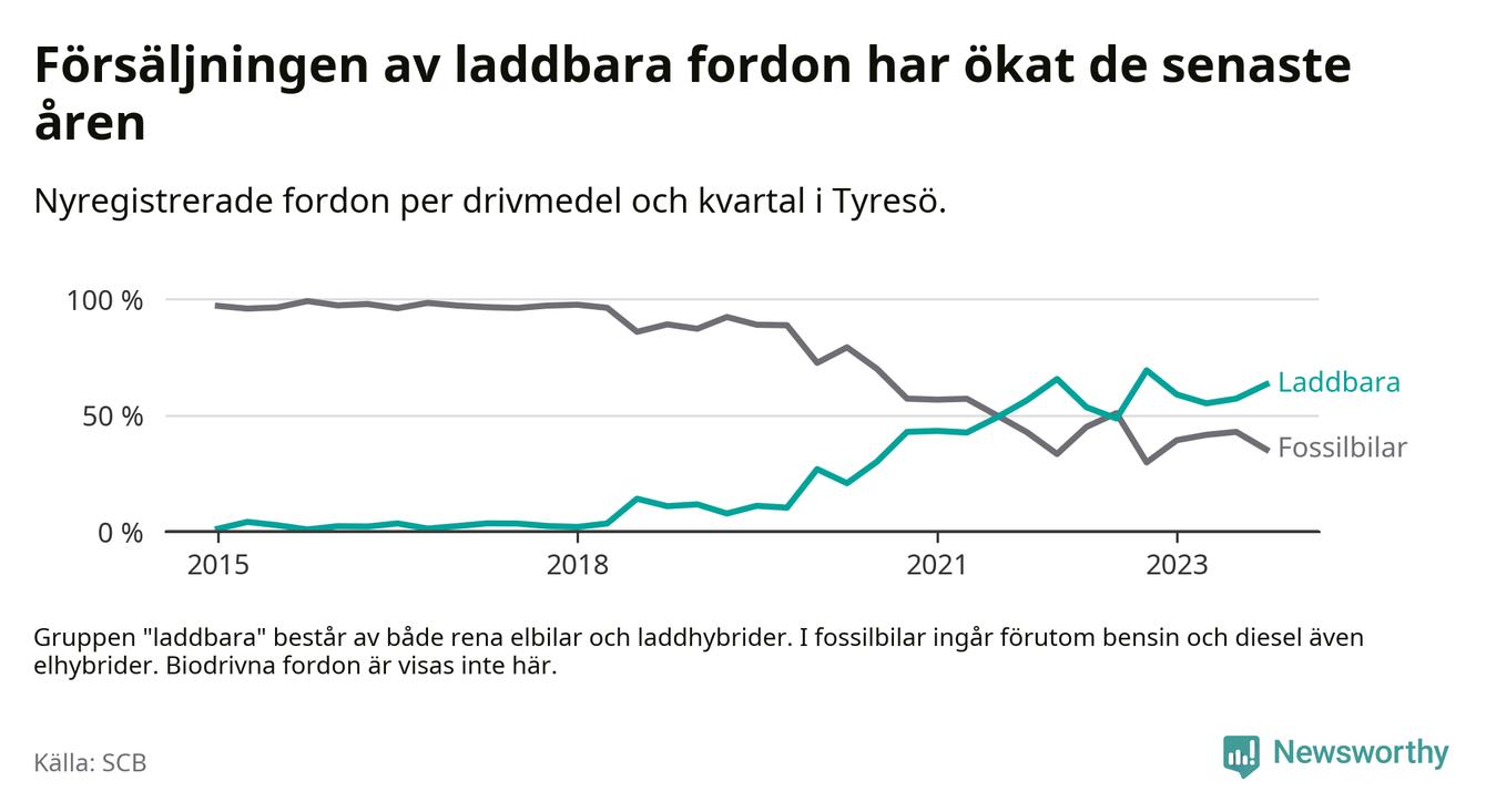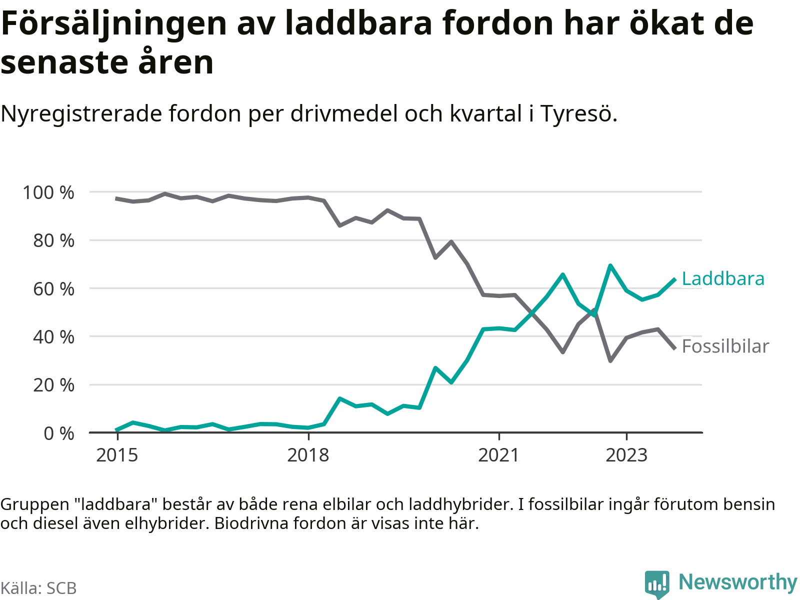 Under fjärde kvartalet 2023 var 63 procent av alla nyregistrerade personbilar i Tyresö laddbara (sammanlagt registrerades 210 nya bilar). Merparten av de laddbara bilarna var rena elbilar (40 procent av alla).