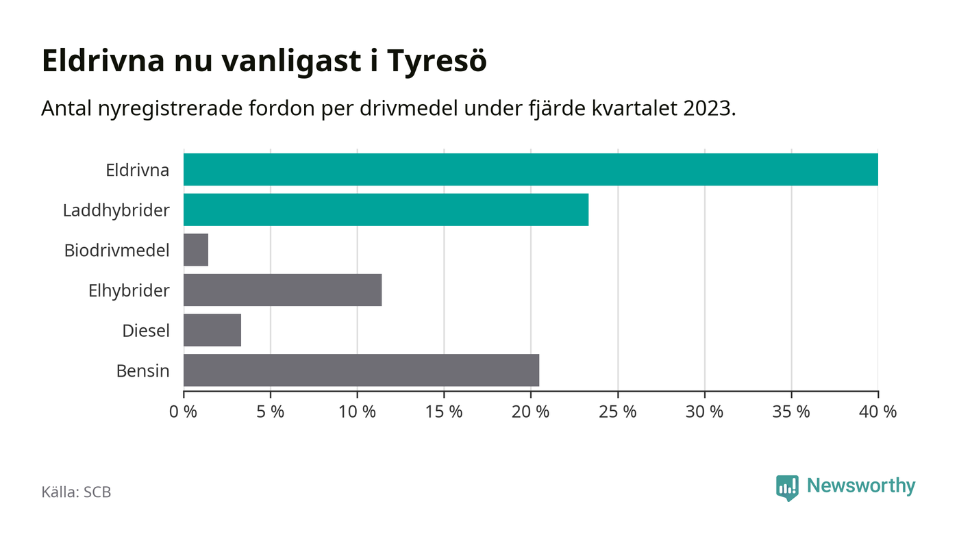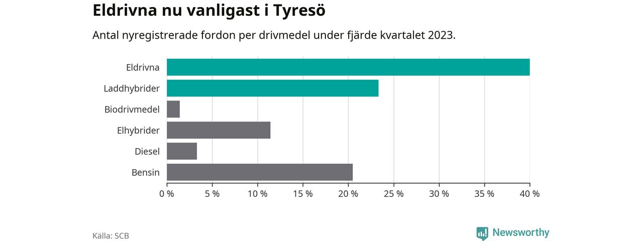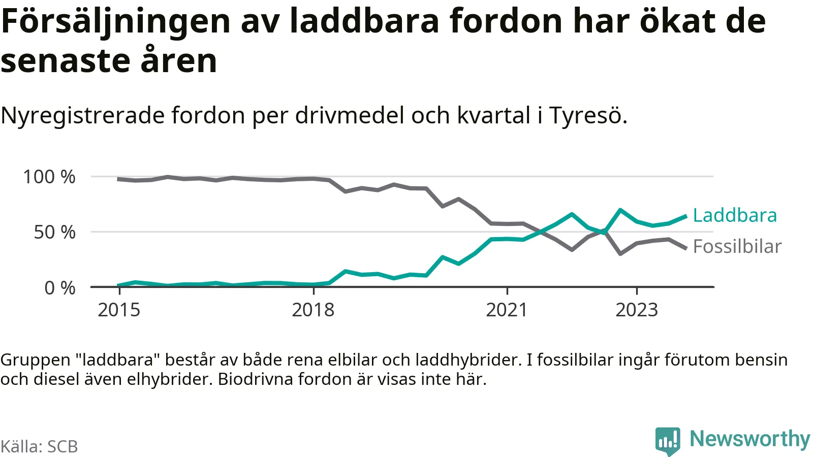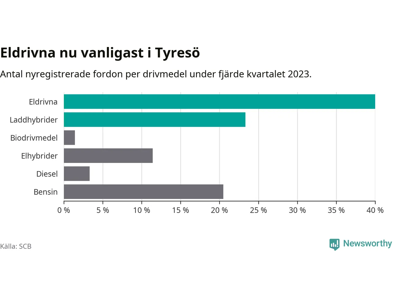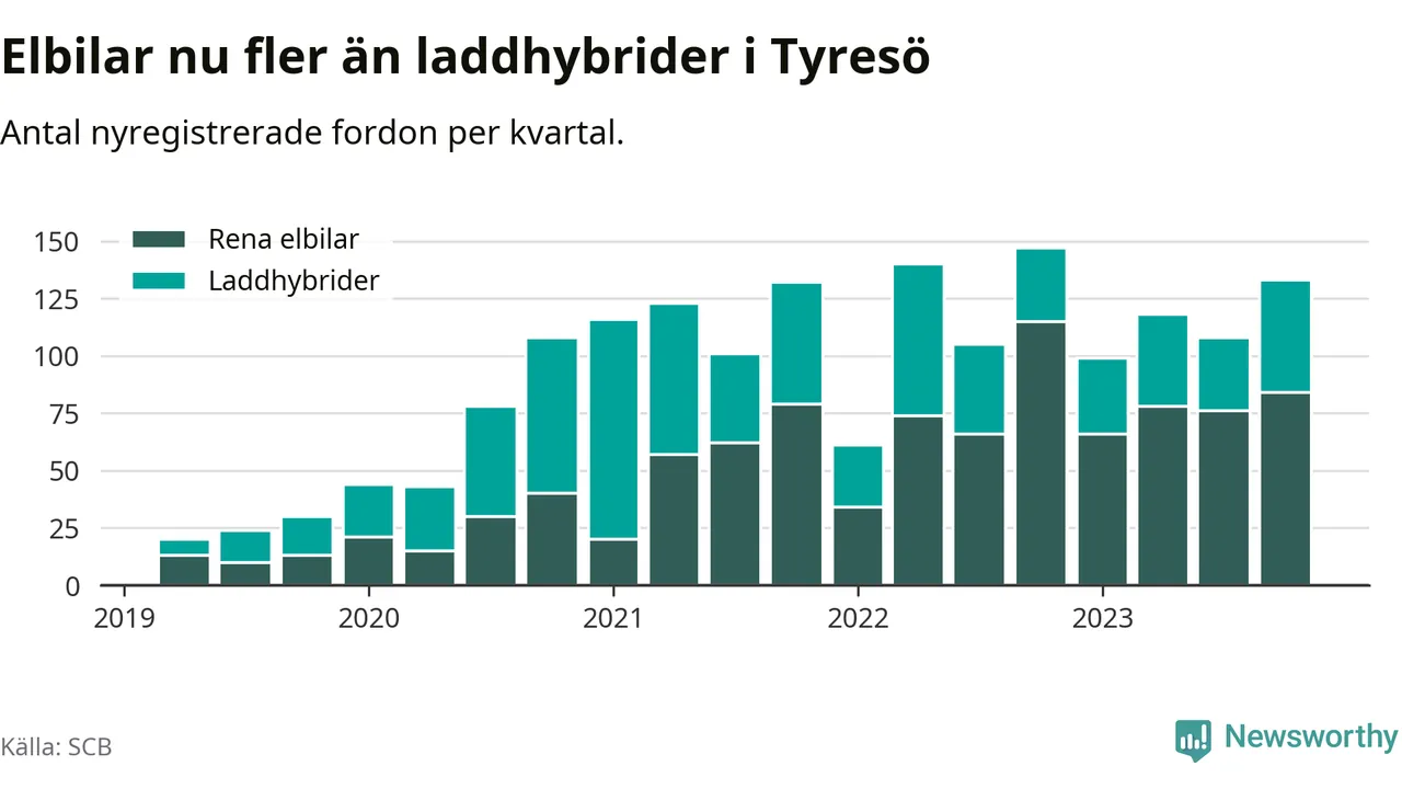 Under fjärde kvartalet 2023 var 63 procent av alla nyregistrerade personbilar i Tyresö laddbara (sammanlagt registrerades 210 nya bilar). Merparten av de laddbara bilarna var rena elbilar (40 procent av alla).