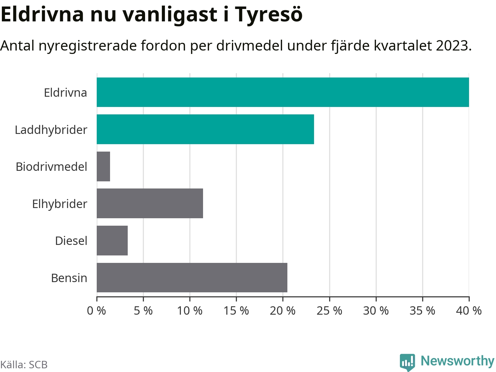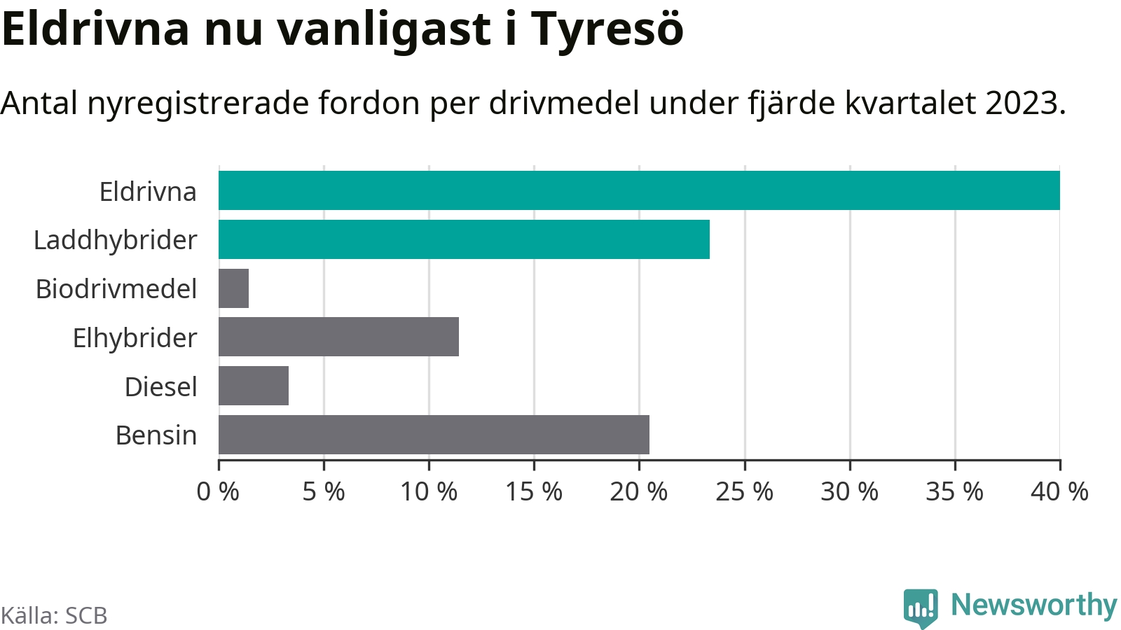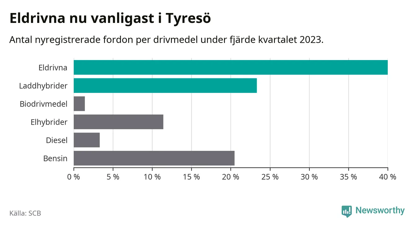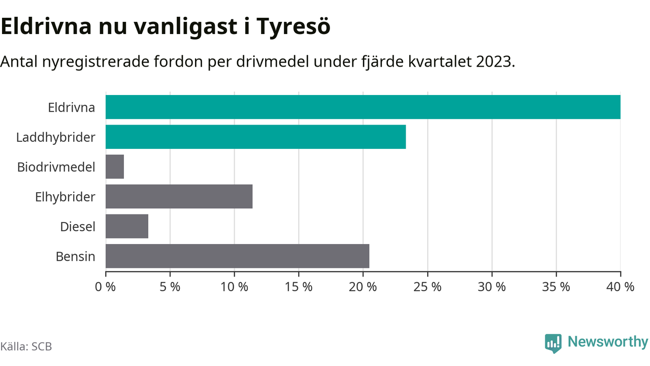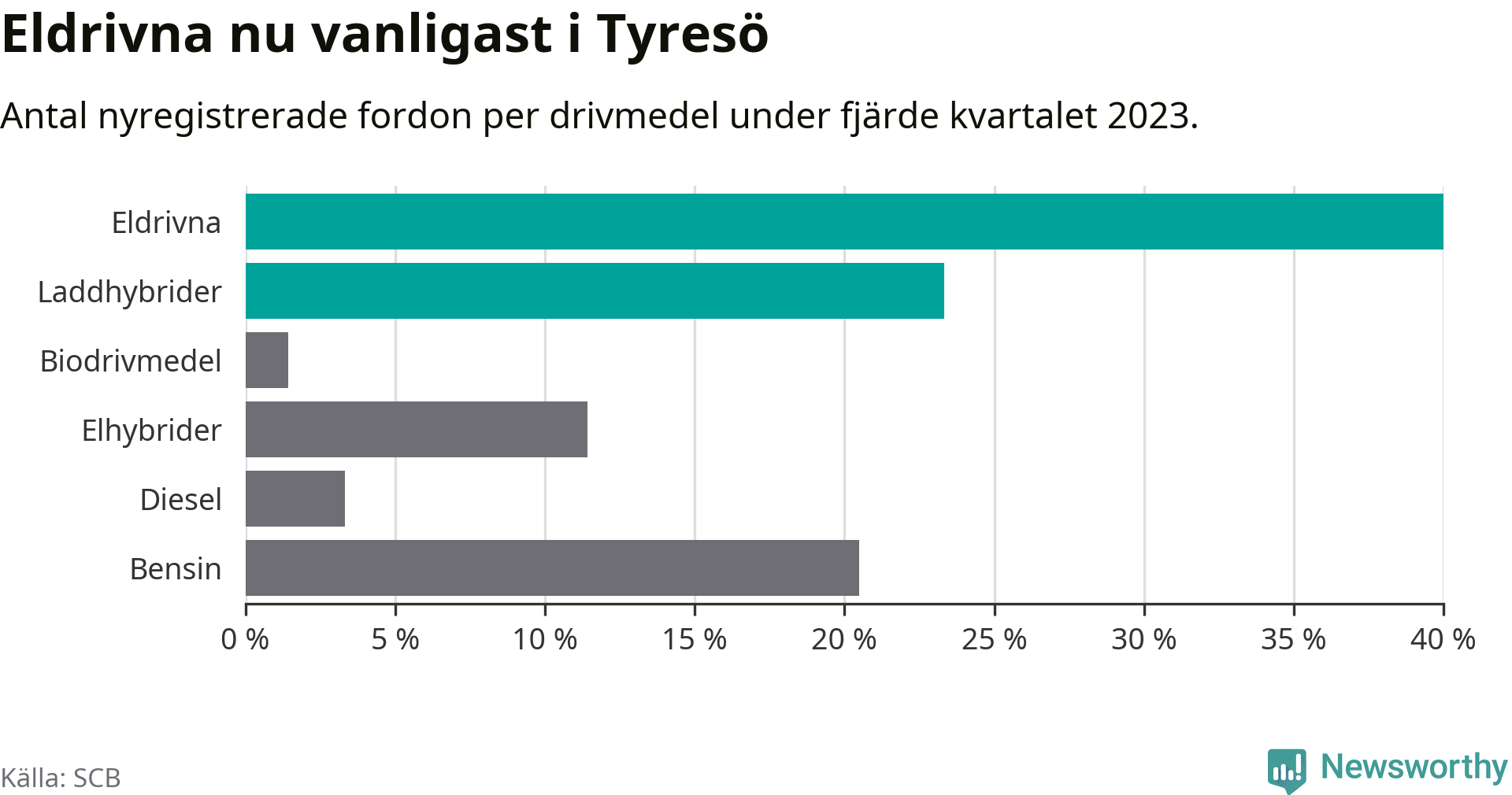 Under fjärde kvartalet 2023 var 63 procent av alla nyregistrerade personbilar i Tyresö laddbara (sammanlagt registrerades 210 nya bilar). Merparten av de laddbara bilarna var rena elbilar (40 procent av alla).