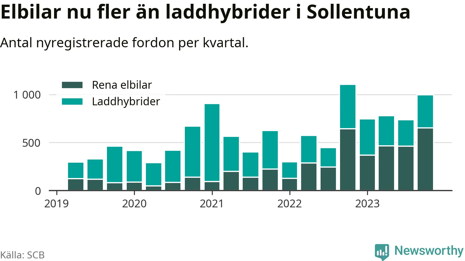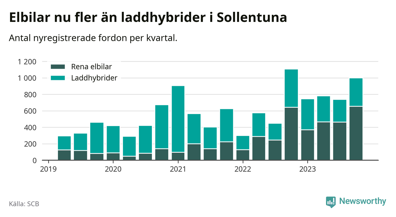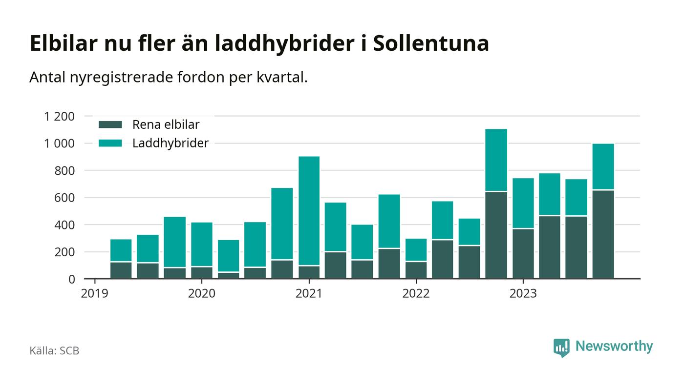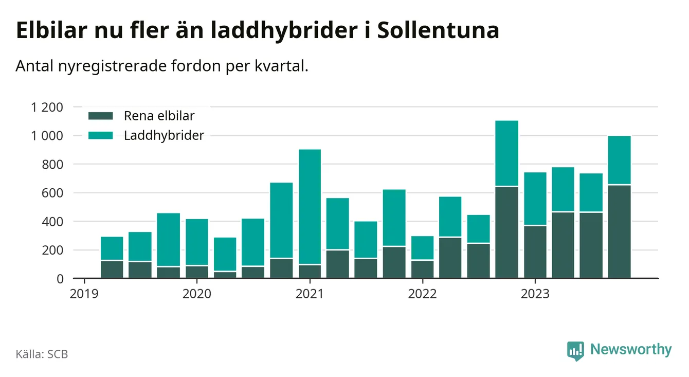Men i Sollentuna noterades ett nytt rekord under fjärde kvartalet. Aldrig tidigare har laddbara bilar utgjort en så stor del av alla nya bilar.