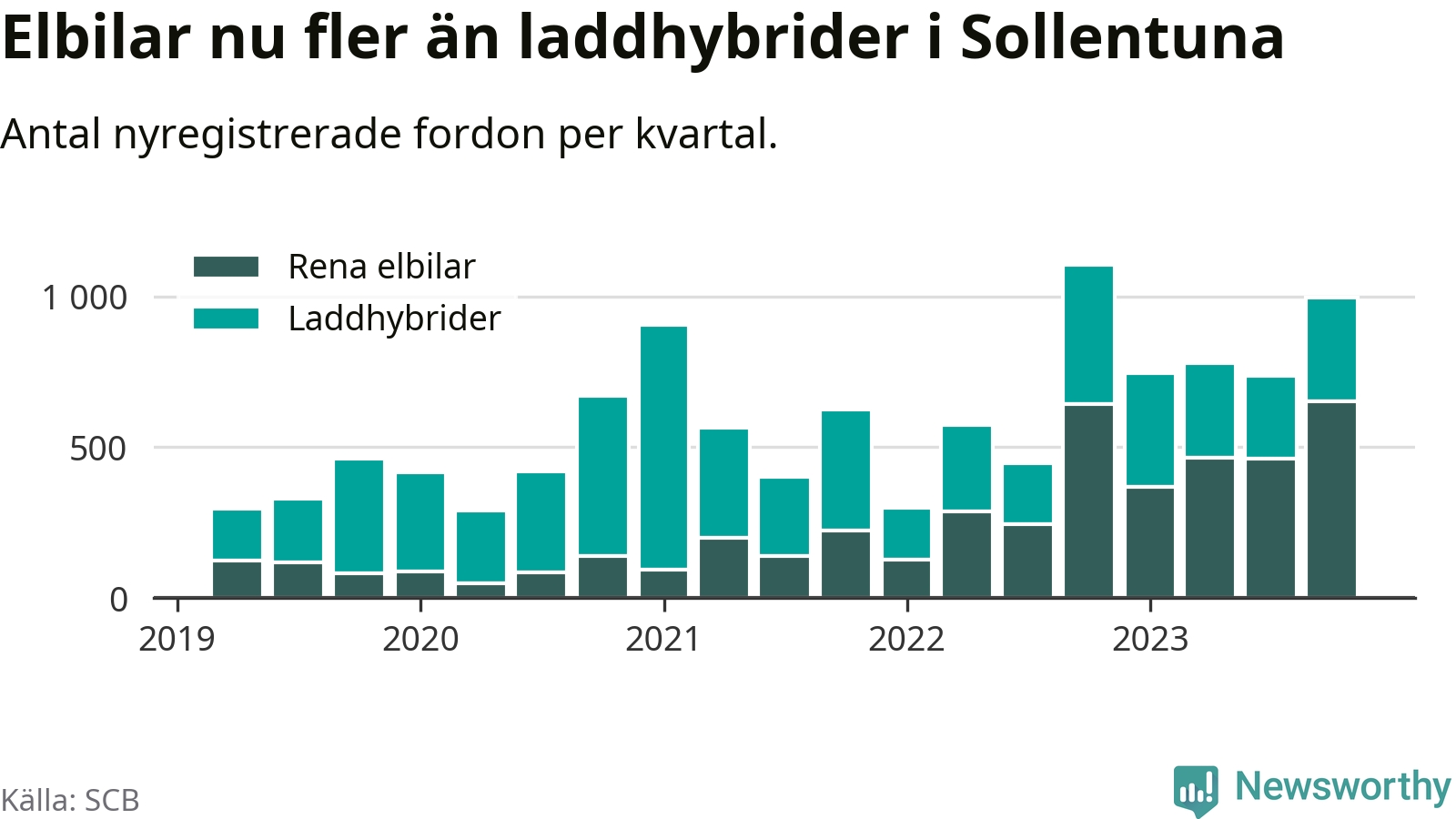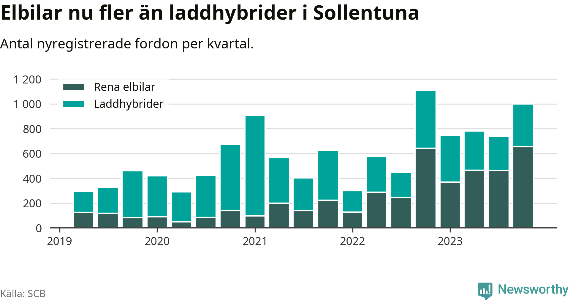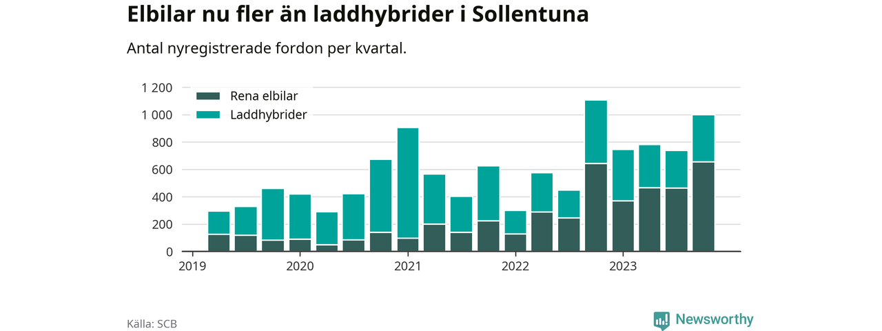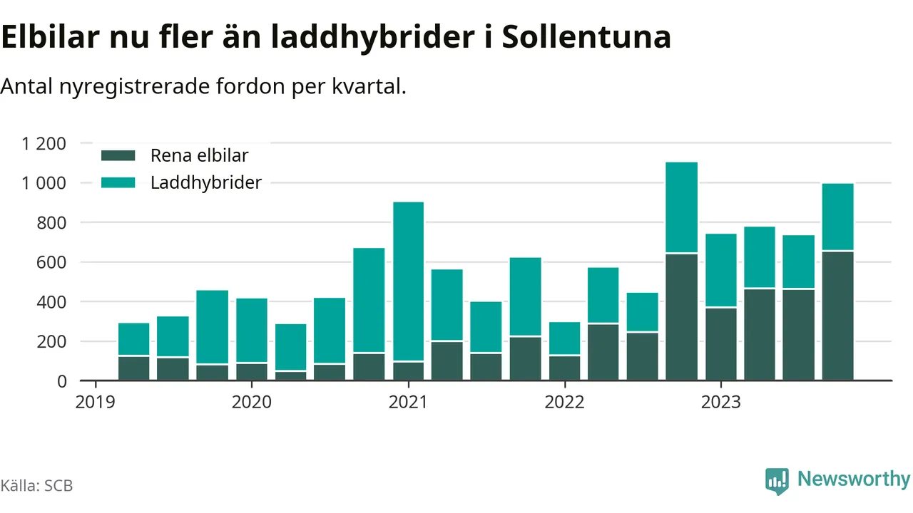Men i Sollentuna noterades ett nytt rekord under fjärde kvartalet. Aldrig tidigare har laddbara bilar utgjort en så stor del av alla nya bilar.