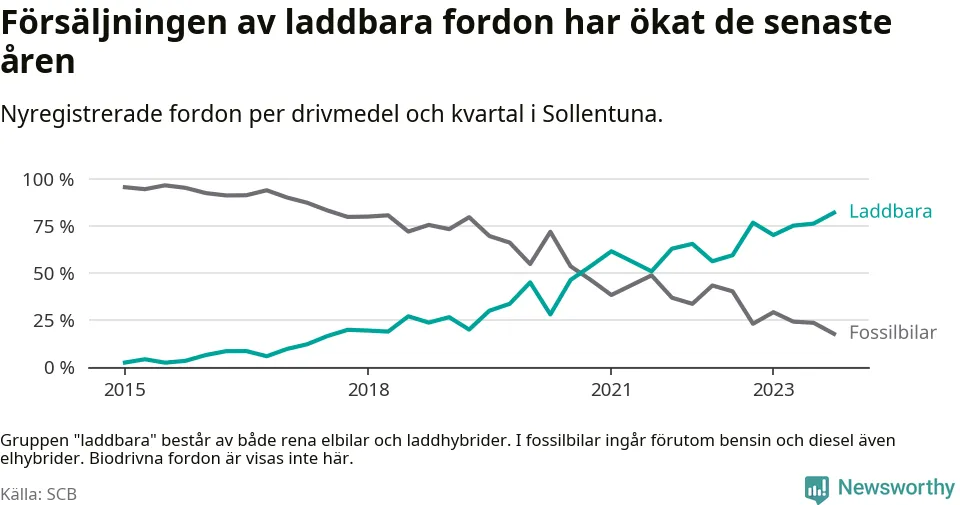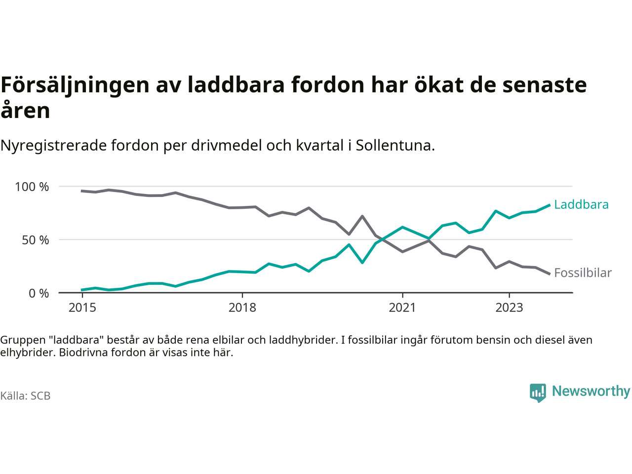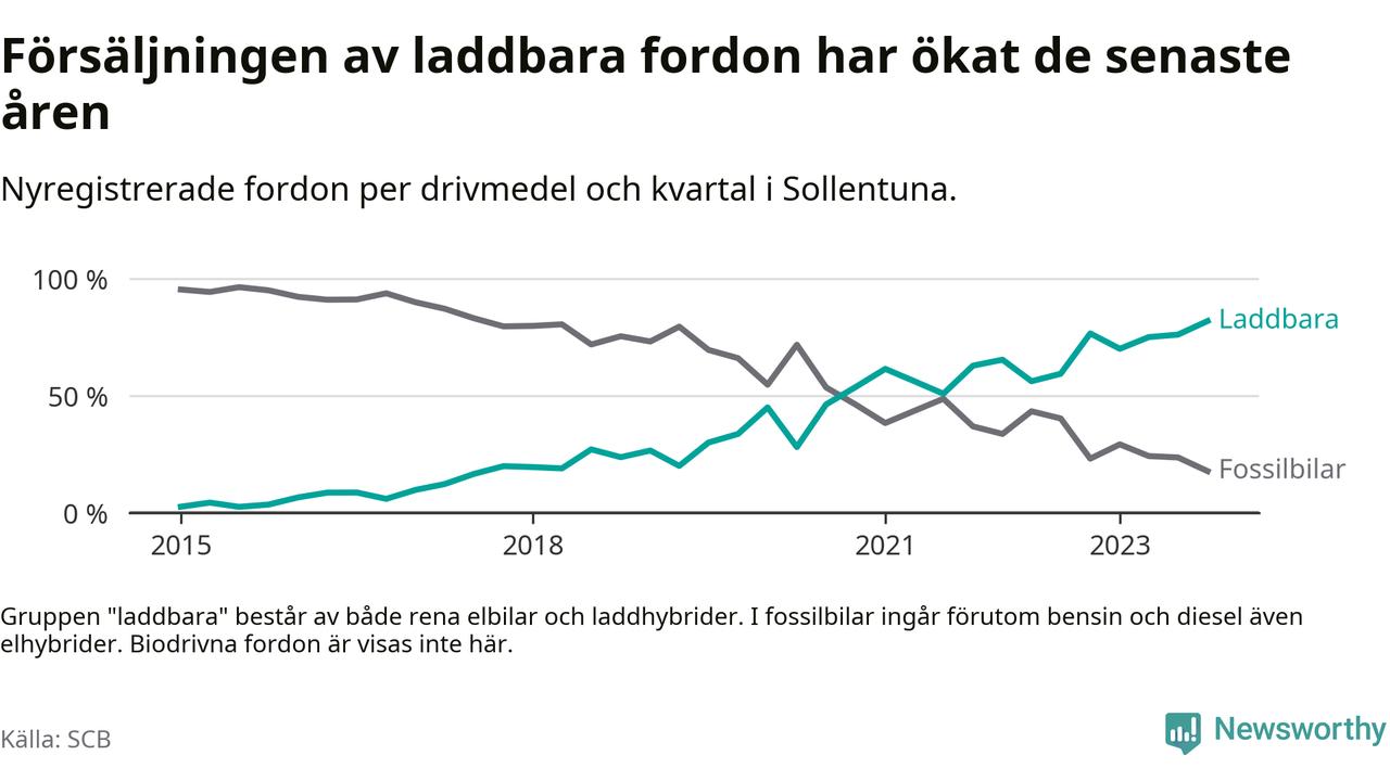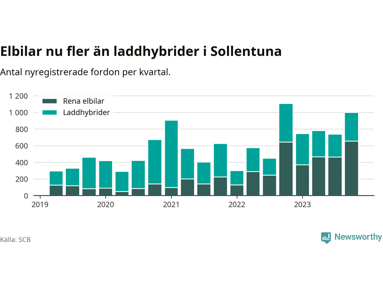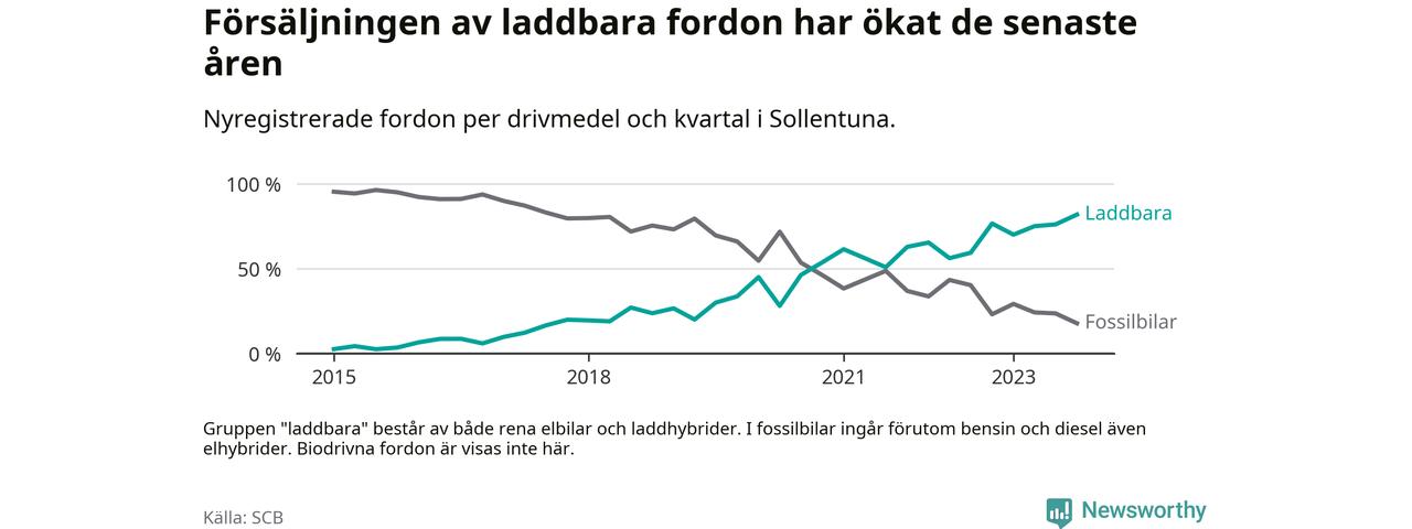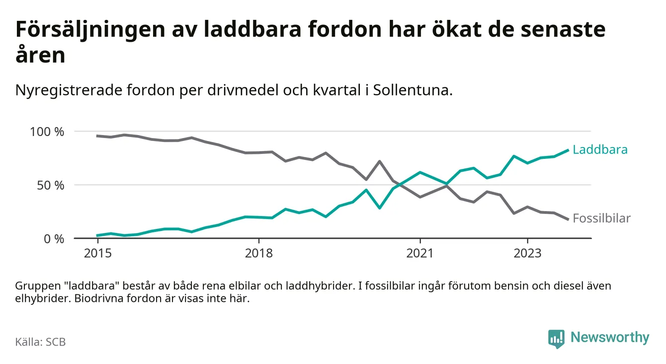 Under fjärde kvartalet 2023 var 82 procent av alla nyregistrerade personbilar i Sollentuna laddbara (sammanlagt registrerades 1 218 nya bilar). Merparten av de laddbara bilarna var rena elbilar (54 procent av alla).