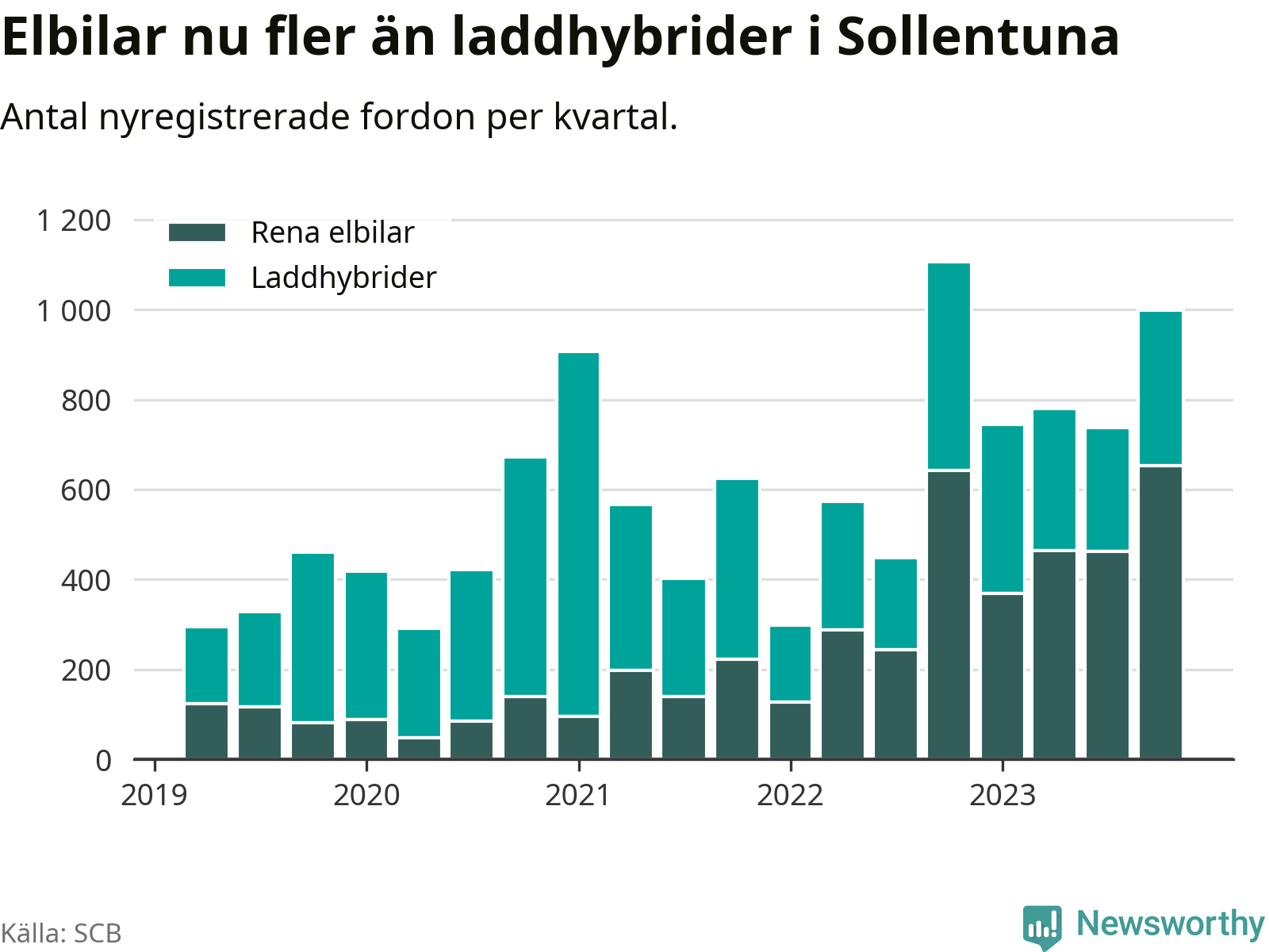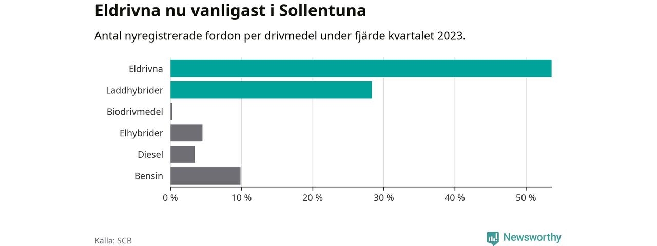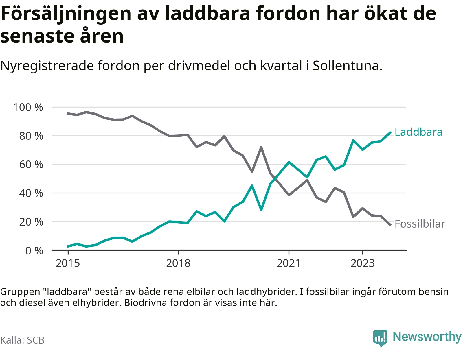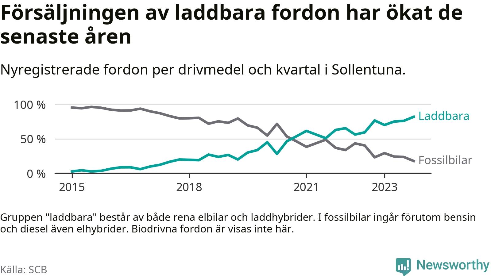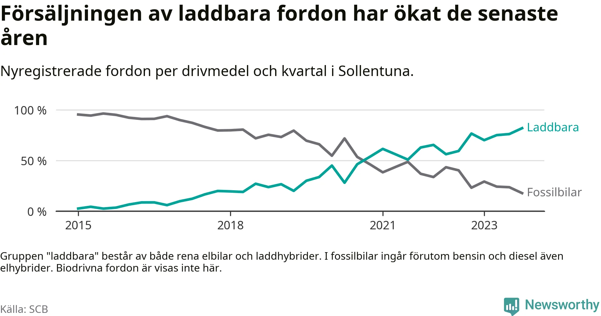 Under fjärde kvartalet 2023 var 82 procent av alla nyregistrerade personbilar i Sollentuna laddbara (sammanlagt registrerades 1 218 nya bilar). Merparten av de laddbara bilarna var rena elbilar (54 procent av alla).